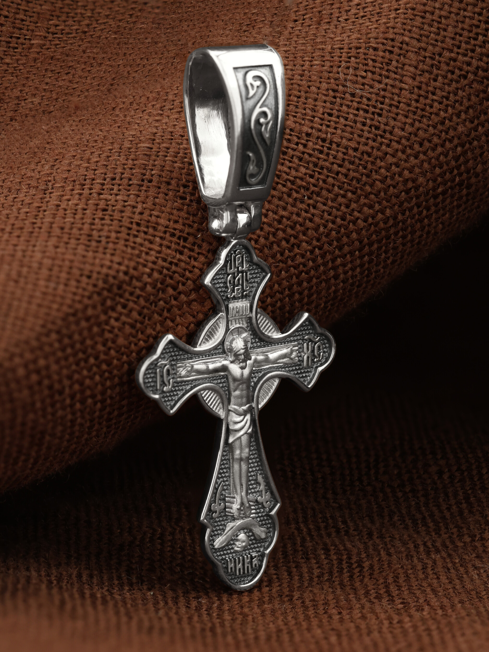 На лицевой стороне креста изображено Распятие, потому что это орудие казни Иисус Христос сделал орудием победы над грехом и смертью. Своими страданиями Он искупил грехи человечества, умерев и сошествовав во ад, победил сатану, освободил души праведников от вечной смерти и открыл им небесные врата рая. Жертва Христа сделала возможным спасение для каждого человека. На православном кресте Христос не умирает, а свободно простирает руки, ладони Иисуса открыты, будто он хочет обнять все человечество, даря им свою любовь и открывая путь к вечной жизни. Над титлом видим слова «ЦРЬ СЛВЫ» — Царь Славы. Верхняя перекладина символизирует собой табличку с надписью «IHЦI» — Иисус Назарянин Царь Иудейский. Над перекладиной пишется сокращенно имя Спасителя «IC XC» — Иисус Христос. В нижней части располагается надпись «НИКА» (греч. — Победитель). Возвышение, на котором стоит Крест, символизирует гору Голгофу, на которой произошло Распятие. У подножия Креста изображают прах Адама, обозначенный черепом.