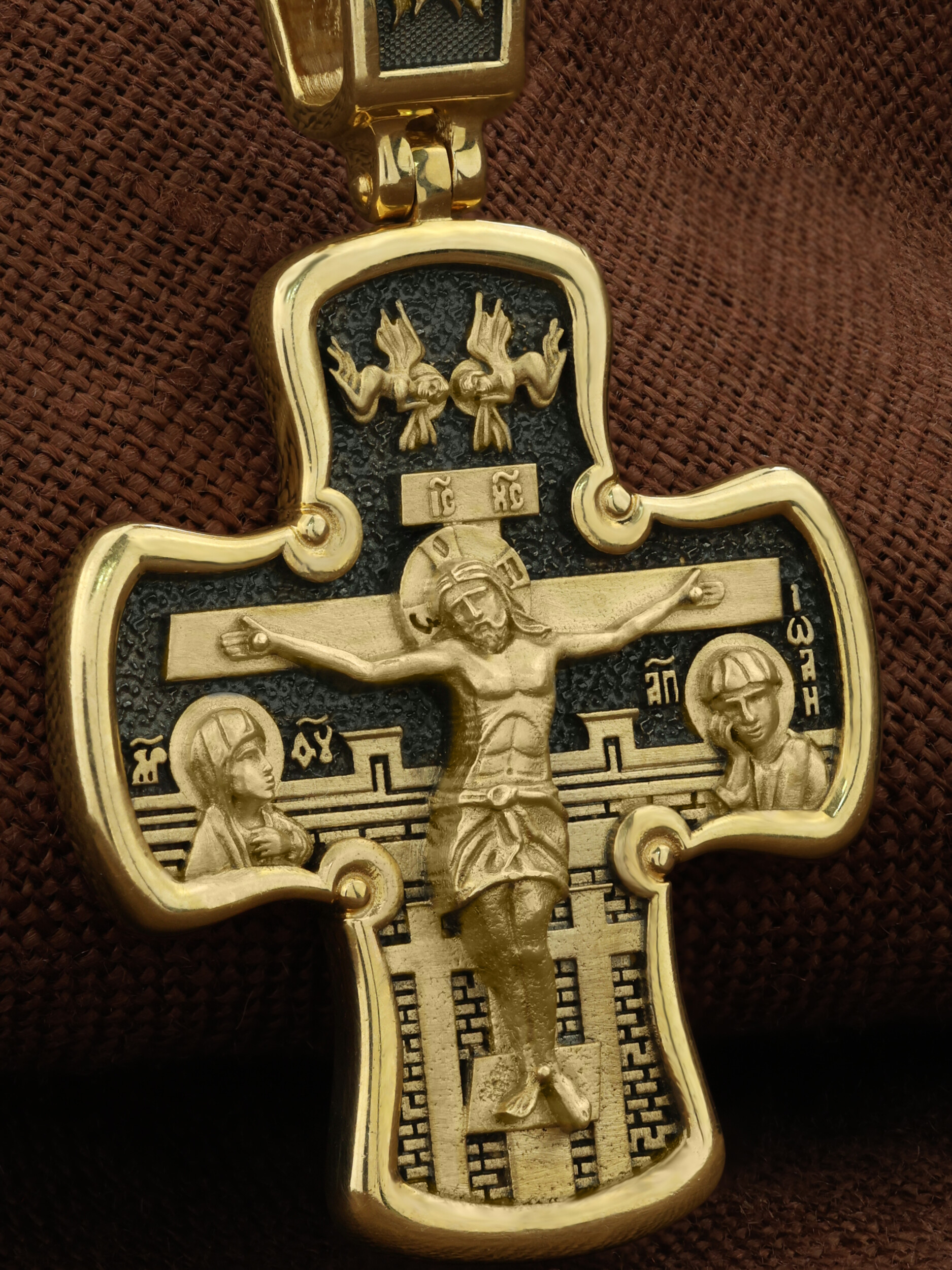 Лицевая сторона креста по канону посвящена Господу Иисусу Христу. Чаще всего на нательных крестах изображается Распятие, которое символизирует победу над грехом и смертью. Своими страданиями Господь искупил грехи человечества: умерев и сошествовав во ад, Он победил дьявола, освободил души праведников от вечной смерти и открыл им Небесные врата рая. Жертва Христа сделала возможным спасение для каждого человека. Поэтому на православных крестах Господь изображается не страдающим, а словно возносящимся и обнимающим весь мир. Он — Спаситель человечества, поправший смертию смерть и призывающий к Себе «все концы земли» (Ис. 45, 22). С двух сторон от Христа изображаются Его Мать, Пресвятая Богородица, и любимый ученик, апостол Иоанн Богослов. Они стояли у Креста неотлучно до самого конца, пока Господь не предал дух Свой Небесному Отцу. Позади — Иерусалимская стена. На иконах она обозначает место казни и символизирует Небесный Иерусалим, путь в который открылся для человечества через Голгофу.