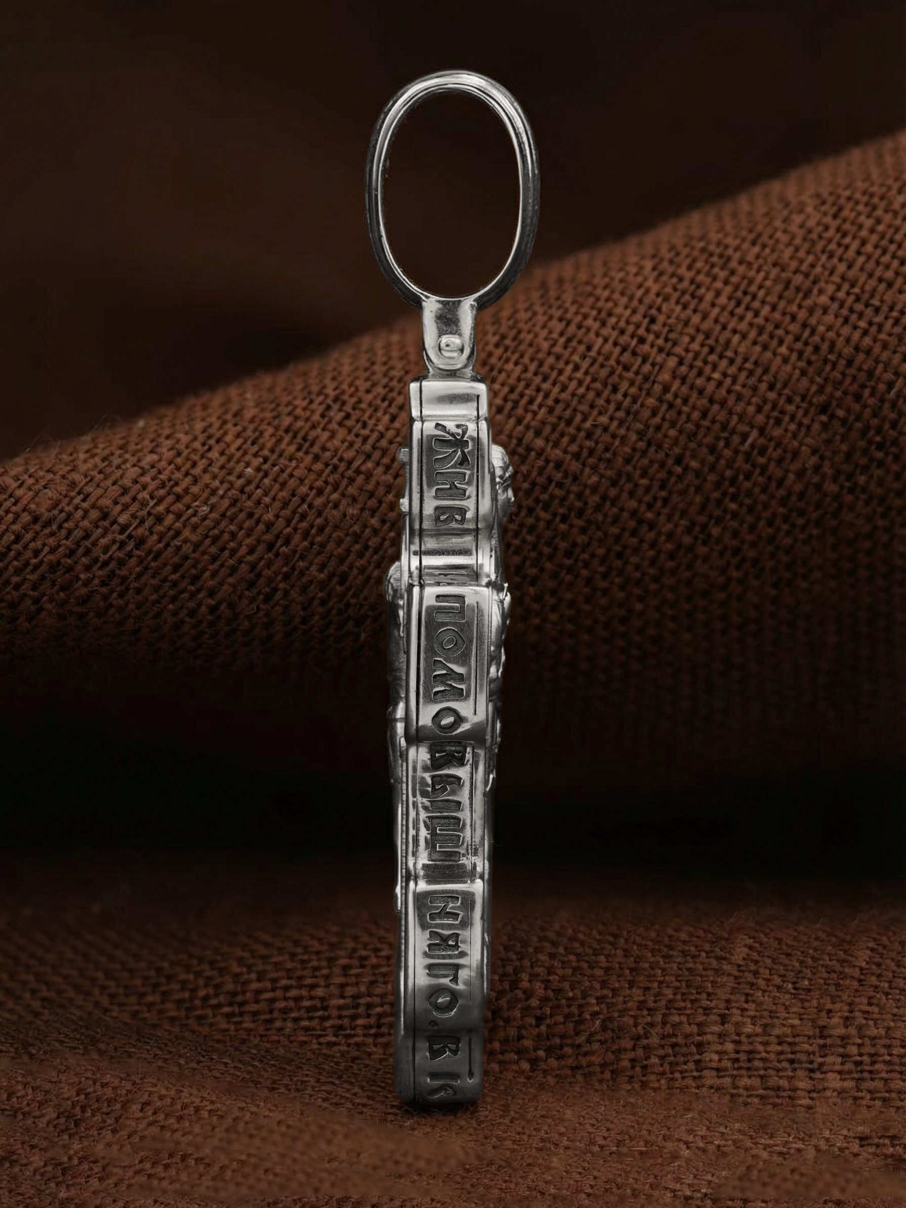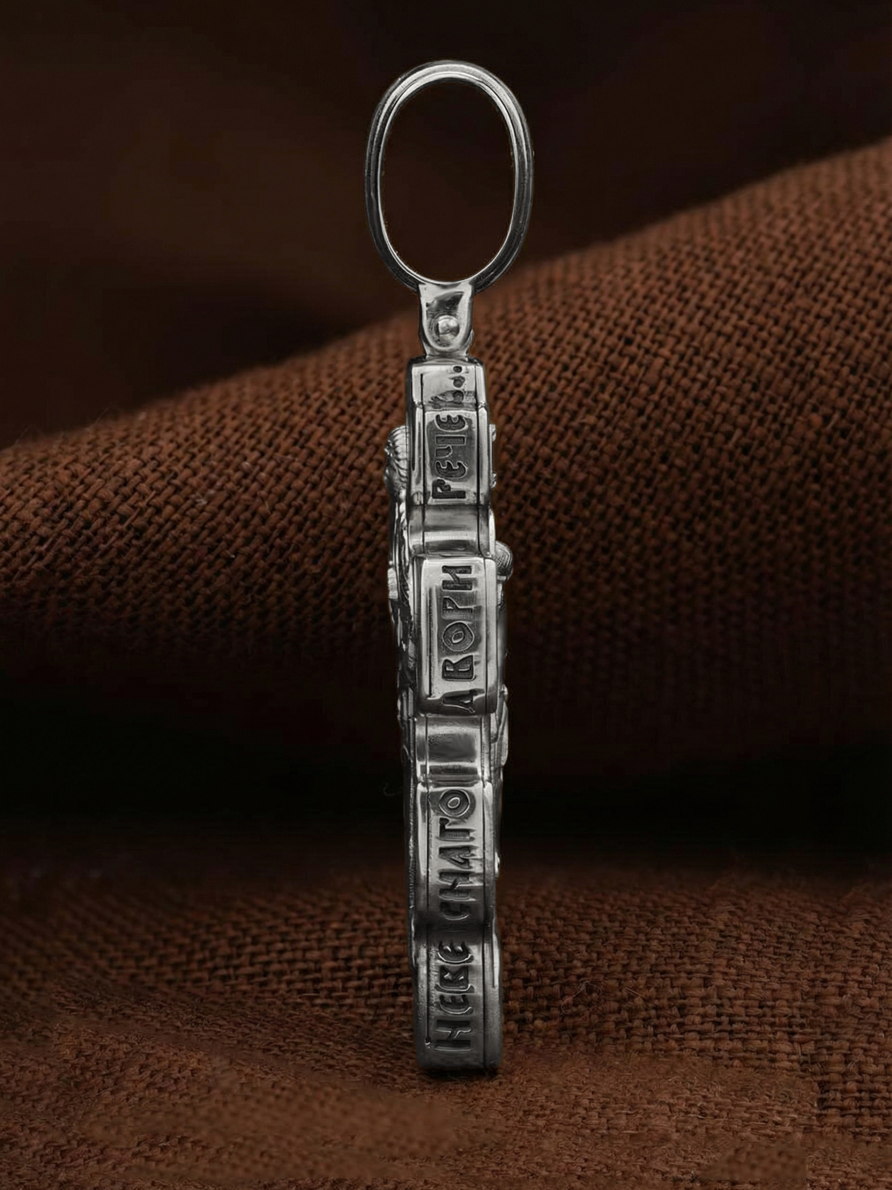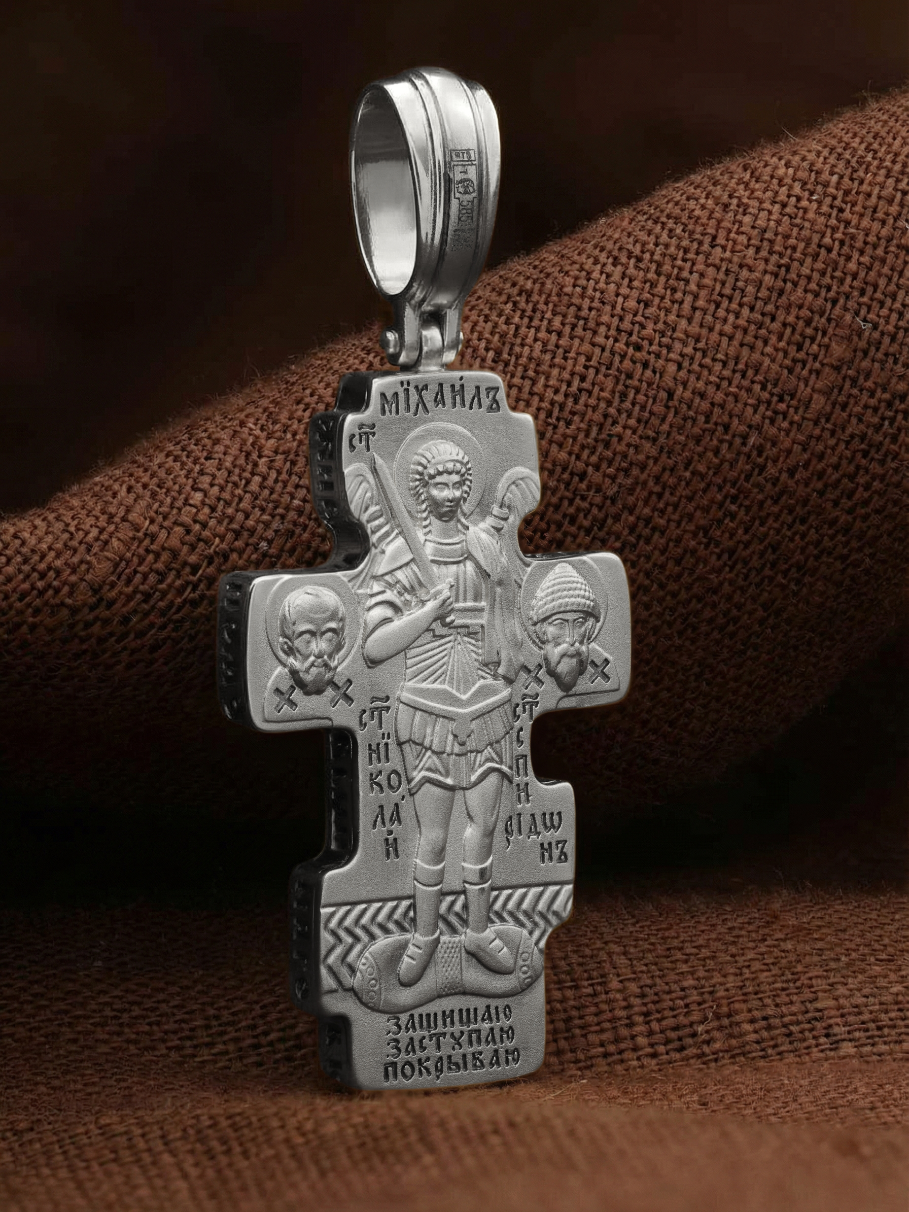 Центральную часть оборотной стороны креста занимает изображение Архангела Михаила — верного служителя Божия, который низринул с Неба возгордившегося денницу с другими павшими духами. В Православии его называют Архистратигом, что означает глава святого воинства Ангелов и Архангелов. Архангел Михаил изображен в воинственном виде с огненным мечом в правой руке. Архангел почитается как покровитель воинов и всех верных Богу и ведущих борьбу против сил зла, борец против ересей, а также защитник душ умерших, страж райских врат. С древних времен прославлен своими чудесами Архангел Михаил на Руси. Слева от образа Архангела изображен Святитель Николай Чудотворец, архиепископ Мир Ликийских, справа — Святитель Спиридон Тримифутский Чудотворец. Святители являются одними из самых почитаемых святых в православном мире. На торцевой стороне креста размещены слова молитвы из 90-го псалма: «Живый в помощи Вышняго, в крове Бога Небеснаго водворится. Речет…»