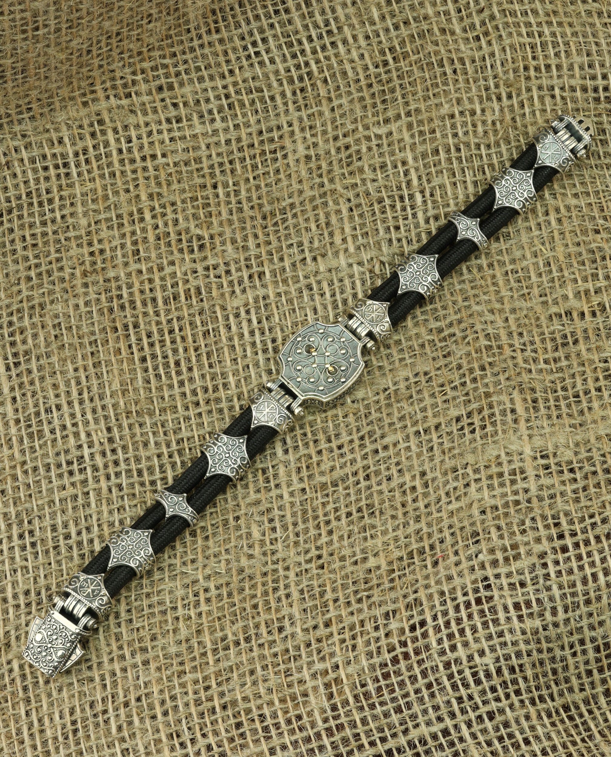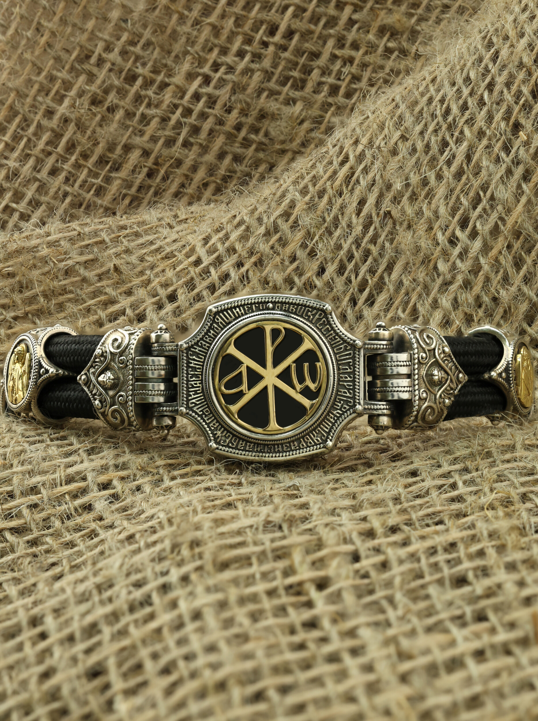 Браслет из серебра и золота c ониксом и шёлковым шнурком