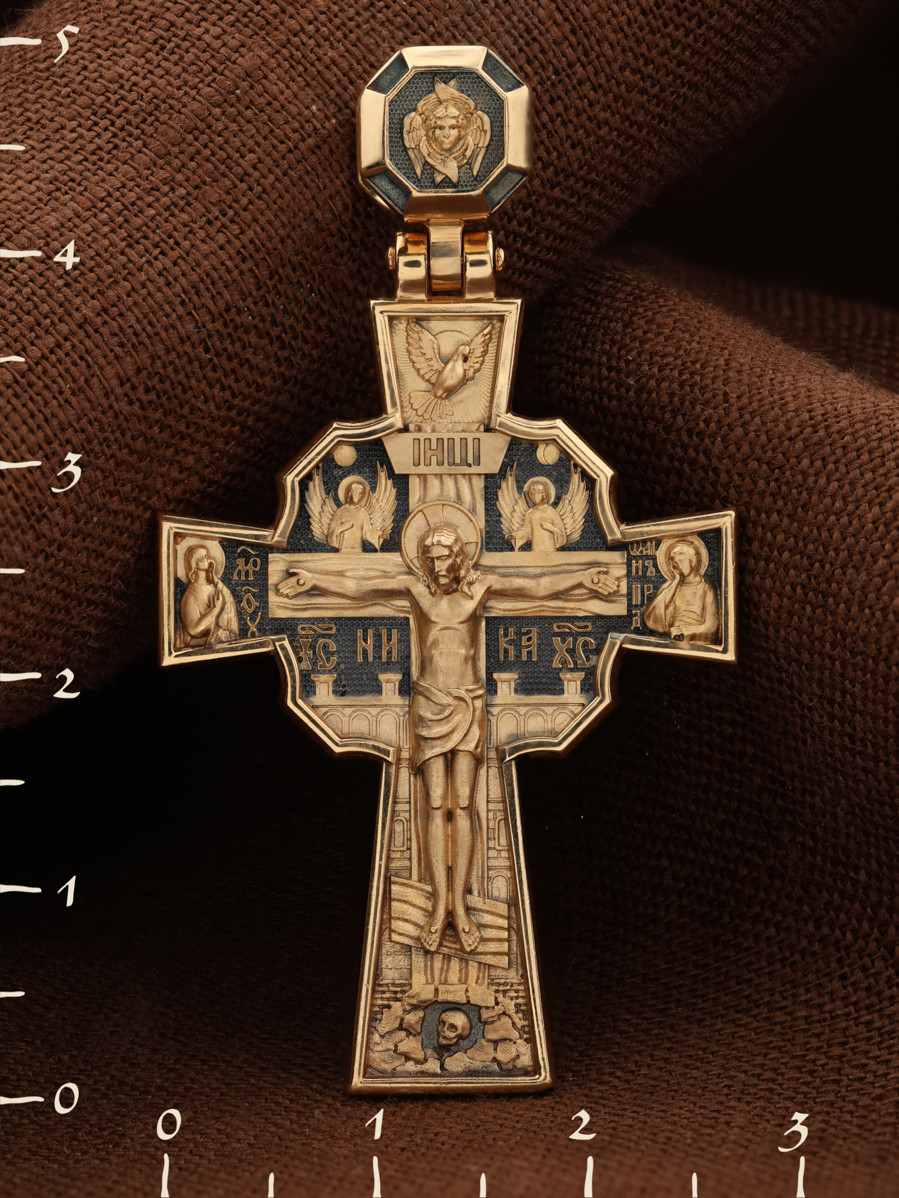 Над Распятием изображен парящий голубь — символ Святого Духа и Его благодати. На кулонном кольце изображен шестикрылый Серафим — самый приближенный к Господу Ангел.