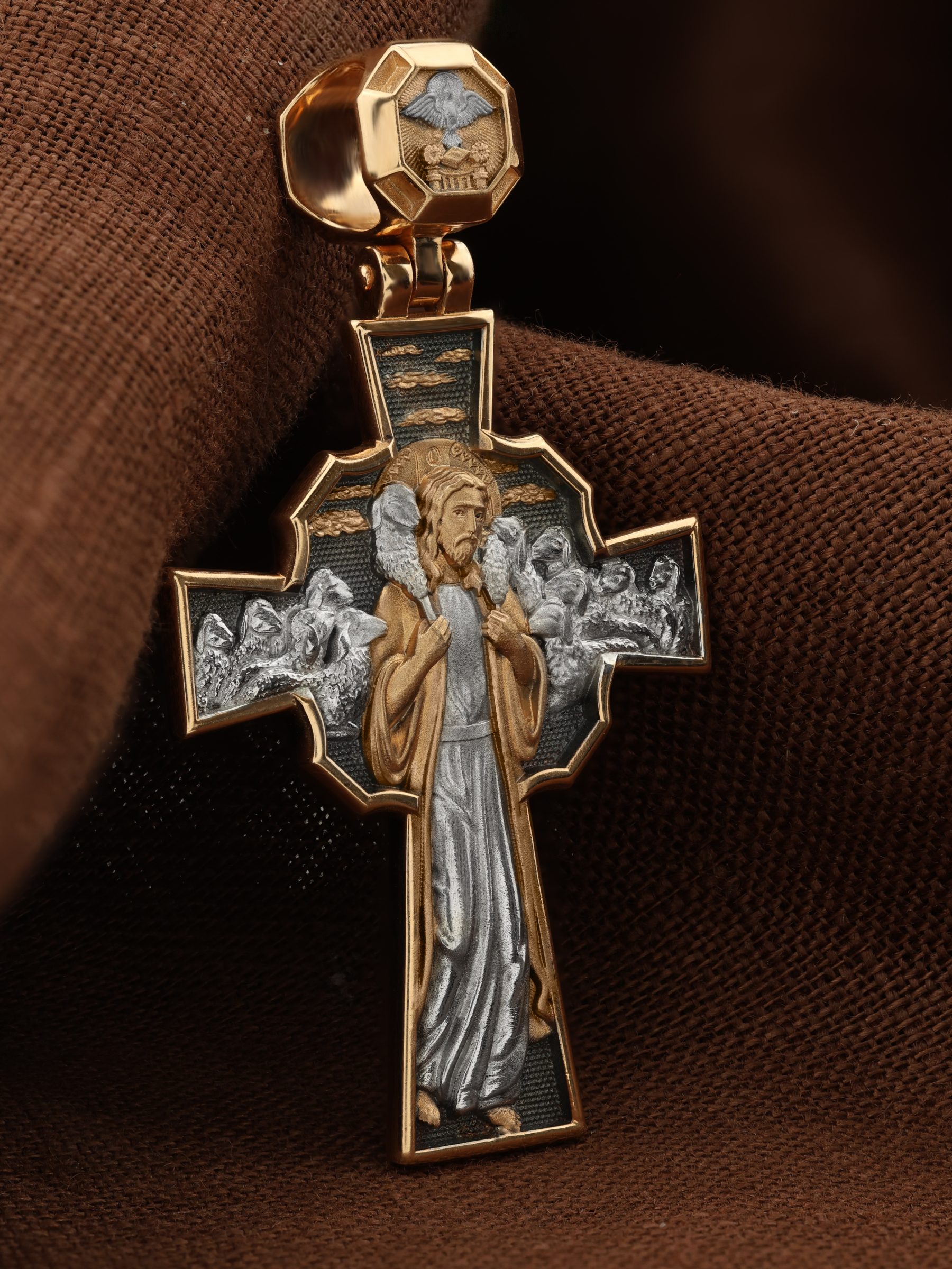 Но обратной стороне креста изображение Иисуса Христа. Добрый Пастырь — символическое именование и изображение Иисуса Христа, заимствованное из Ветхого Завета и повторенное Христом в Новом Завете в своей роли учителя. Иисус изображается с заблудшей овцой, вскинутой на плечи (Лк. 15:3−7).