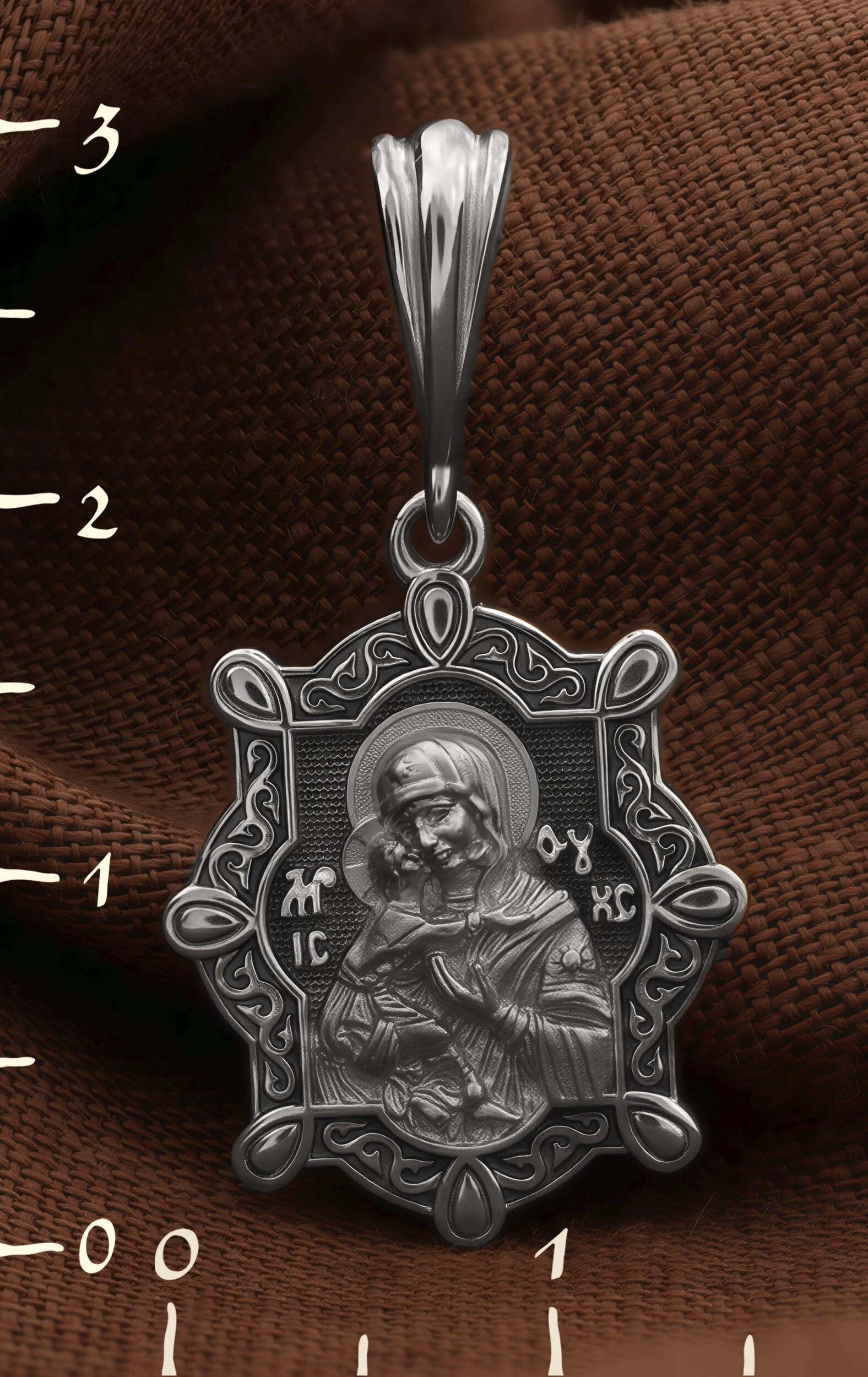 Лицевую сторону возглавляет Владимирская икона Божией Матери — самая великая русская святыня, многие века бывшая олицетворением нашей земли. Перед ней венчались на царство государи, избирались патриархи. Пречистой Богородице Владимирской клялись в верности Отечеству солдаты и за нее умирали на поле брани. Именно на ее защиту более всего уповала Россия в самые страшные периоды своей истории. Владимирская икона Божией Матери, по преданию, была написана на доске трапезного стола из дома Иисуса Христа. На Русь она была привезена в начале XII века и с тех пор почитается как главная святыня нашего Отечества. Перед ней молитвенно просят Богородицу об исцелении от телесных недугов, в частности, заболеваний сердца и сердечнососудистой системы. За помощью к ней обращаются во время бедствий, когда нуждаются в защите от врагов.