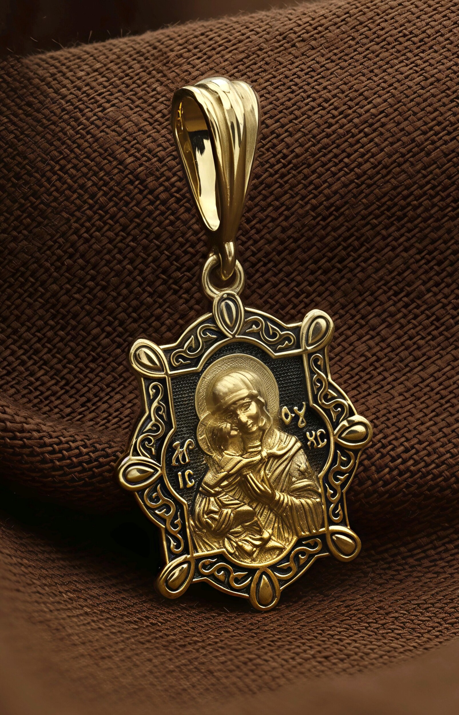 Лицевую сторону возглавляет Владимирская икона Божией Матери — самая великая русская святыня, многие века бывшая олицетворением нашей земли. Перед ней венчались на царство государи, избирались патриархи. Пречистой Богородице Владимирской клялись в верности Отечеству солдаты и за нее умирали на поле брани. Именно на ее защиту более всего уповала Россия в самые страшные периоды своей истории. Владимирская икона Божией Матери, по преданию, была написана на доске трапезного стола из дома Иисуса Христа. На Русь она была привезена в начале XII века и с тех пор почитается как главная святыня нашего Отечества. Перед ней молитвенно просят Богородицу об исцелении от телесных недугов, в частности, заболеваний сердца и сердечнососудистой системы. За помощью к ней обращаются во время бедствий, когда нуждаются в защите от врагов.