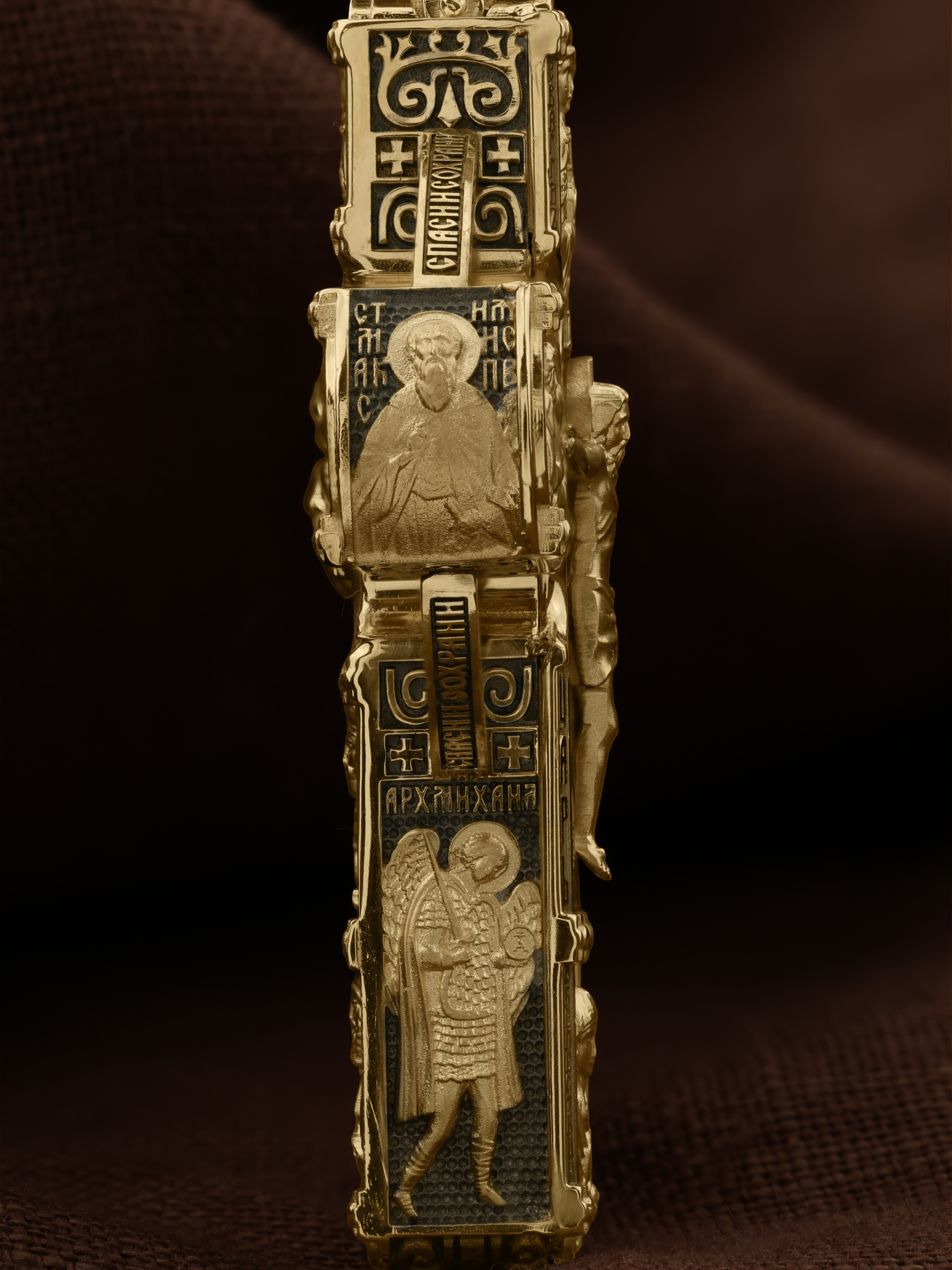 Крест объединяет в одной фигуре два христианских символа — круг-нимб и крест. На лицевой стороне креста изображено Распятие Господа и Спасителя нашего Иисуса Христа. Крест — символ спасения и искупления рода человеческого, знамение победы над смертью и адом. Распятие сопровождается каноническими надписями. На верхней табличке, выше головы Иисуса, расположена надпись, составленная Понтием Пилатом — «IНЦI». Она означает «Иисус Назорей, Царь Иудейский». Надписи «IC» «ХC», что означает Иисус Христос и «Сын Божий» размещается на разных сторонах поперечной перекладины креста. Вдоль Распятия размещены надписи «Царь Славы», «НИКА» (греч. — Победитель) и «МЛРБ» — «место лобное рай бысть» означает место лобное стало раем». Крест стоит на горе камней, символизирующих Голгофу. В ее основании различается череп — это голова Адама. Вдоль креста изображены орудия Страстей Христовых: копие сотника Лонгина, которым пронзили подреберье мёртвого Иисуса, чтобы убедиться в Его смерти, и трость с губкой, с которой Иисуса напоили уксусом. Они обозначены буквами «К» и «Т». Слева от Распятия помещены лики Пречистой Богородицы и Апостола Петра, справа изображены Апостол и евангелист Иоанн Богослов и Апостол Павел. Над Распятием изображен Святой Ангел-Хранитель, ниже — икона Божией Матери «Семистрельная». По кругу размещена молитва: «Кресту Твоему поклоняемся, Владыко, и Святое Воскресение Твое славим». На кулонном кольце помещено изображение Креста «Голгофа», на котором был распят Господь и Спаситель наш Иисус Христос.