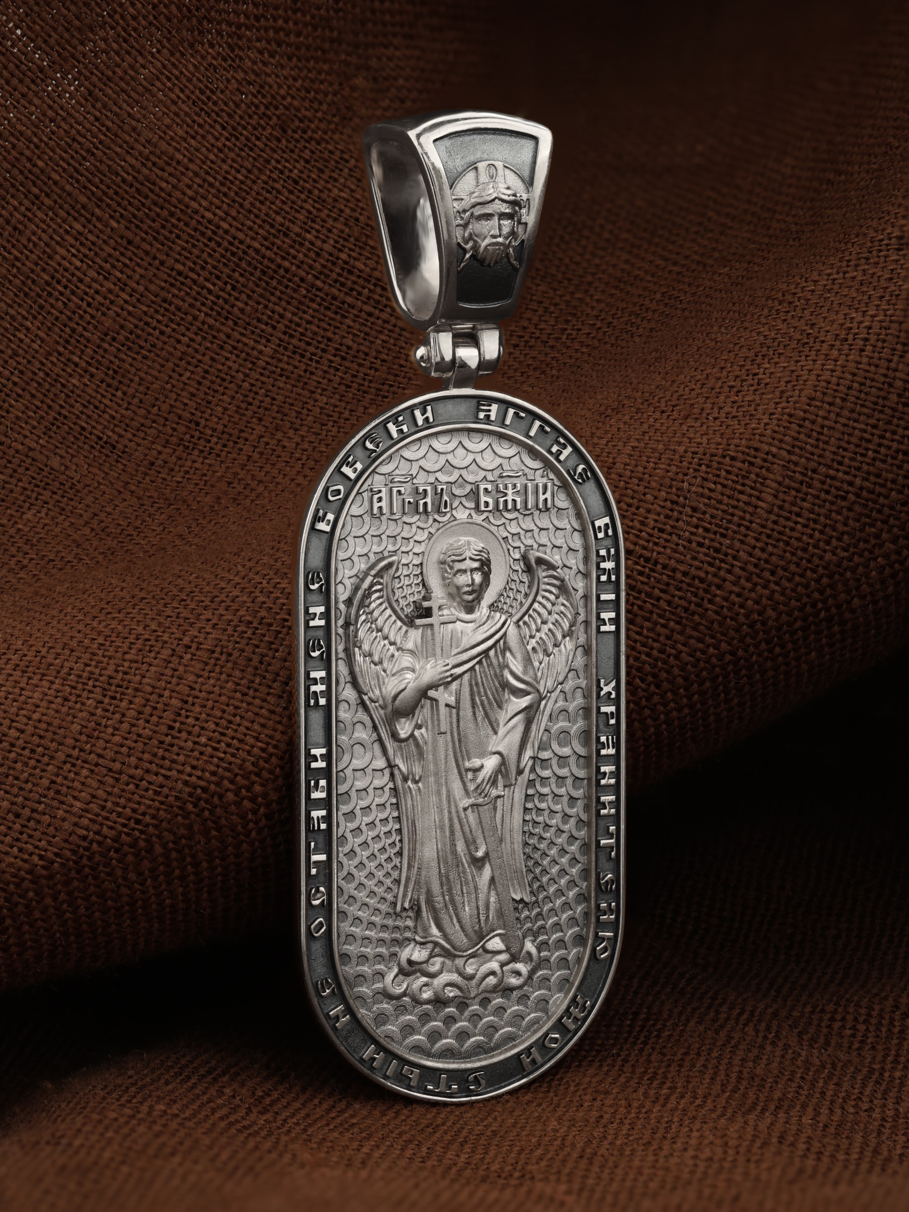 Основой композиции оборотной стороны является изображение Ангела Хранителя, который неотступно находится рядом с человеком, помогая, оберегая и наставляя его, а после смерти сопровождает его душу через мытарства. По контуру написана молитва: «Ангел Божий, хранителю мой святый, не остави мене вовеки». На кулонном кольце изображен Спас Нерукотворный — Символ вочеловечившегося Божества.