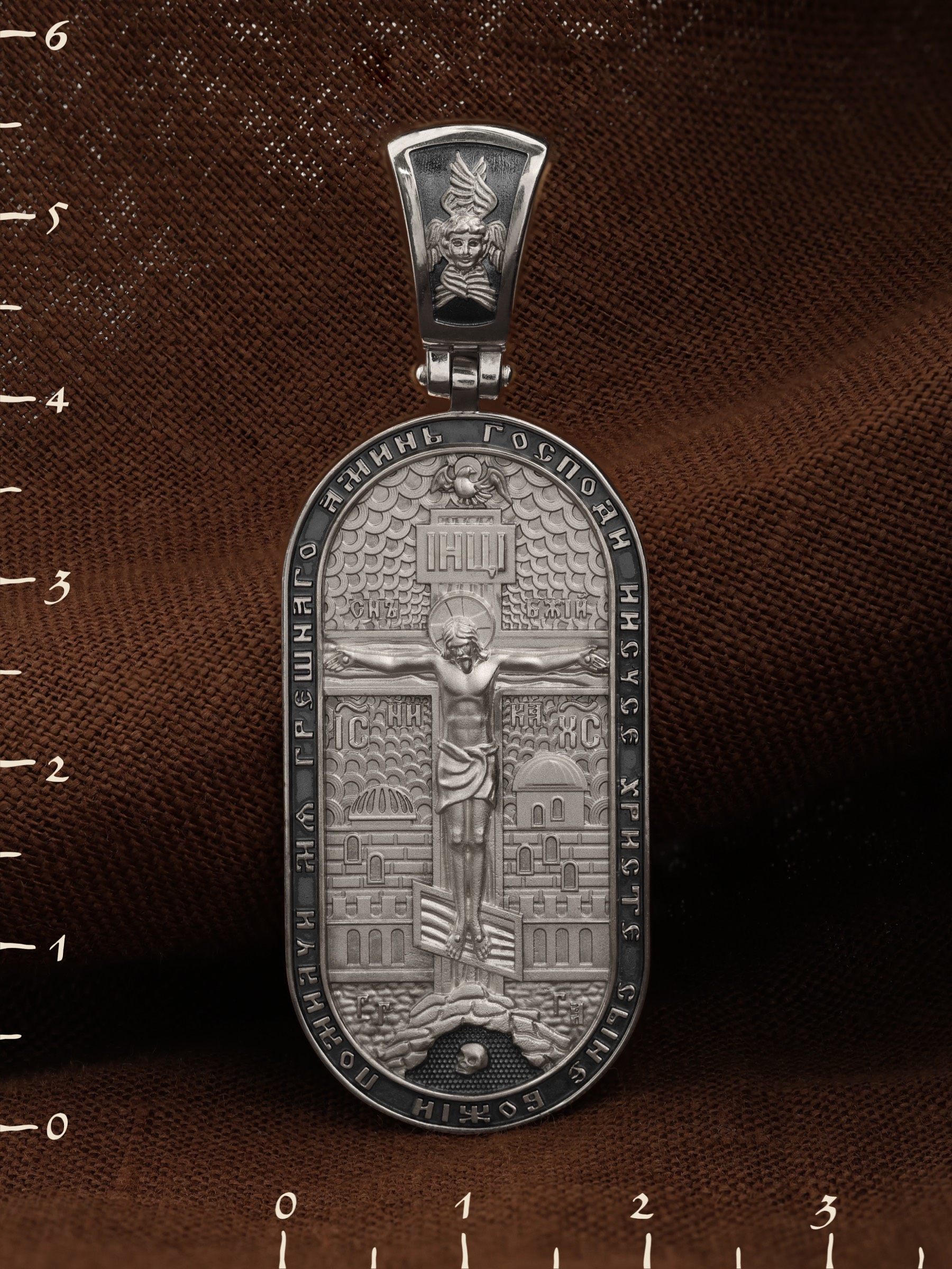 Центральную часть лицевой стороны занимает Распятие Христа — образ жертвы, принесенной Господом за грехи людей. Именно ко Христу, сошедшему на землю ради нашего спасения, возносятся все молитвы. Рядом с Его образом помещены слова — «НИКА» (греч. — Победитель) и «СЫН БОЖИЙ». Эти слова характеризуют Господа как Великого Архиерея, победителя смерти. Также Распятие сопровождается надписями, олицетворяющими Христа — это святое имя Христа «IC» (Иисус) «ХС» (Христос). Верхняя перекладина символизирует собой табличку с надписью «IHЦI» — Иисус Назарянин Царь Иудейский. Возвышение, на котором стоит Крест, символизирует гору Голгофу, на которой произошло Распятие. У подножия Креста изображают прах Адама, обозначенный черепом. На кулонном кольце изображен шестикрылый Серафим — самый приближенный к Господу Ангел. По контуру образка написана молитва: «Господи Иисусе Христе, Сыне Божий, помилуй мя грешного. Аминь»