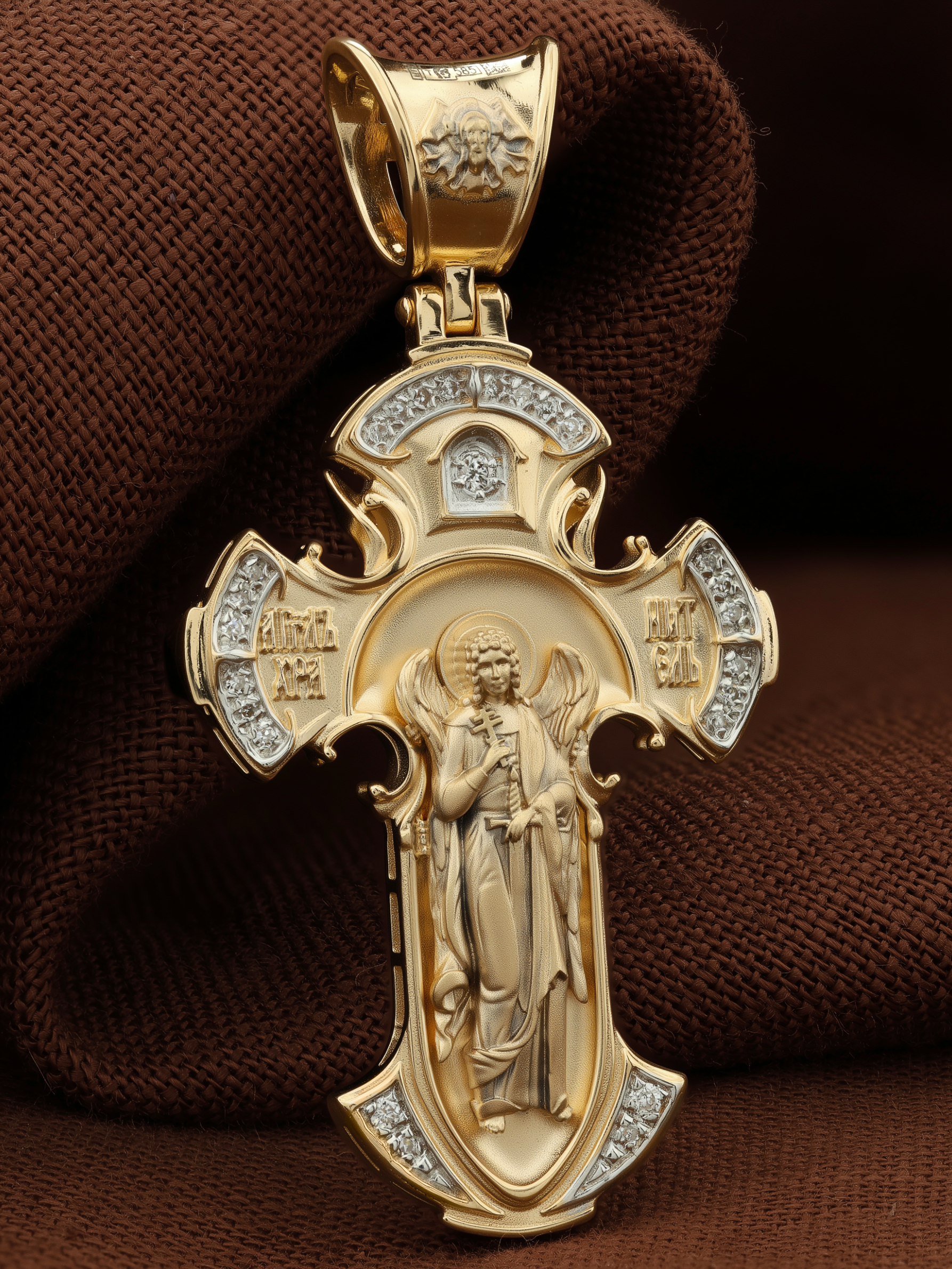 На оборотной стороне креста изображен Святой Ангел-Хранитель. Он держит в правой руке крест, а в левой — мечь. Ангел-Хранитель — это Ангел приставляемый Богом к человеку при крещении для охраны и помощи в добрых делах. Он невидимо находится при человеке на протяжении всей его жизни, если человек сохраняет в себе любовь к Богу и истинную веру перед Ним. Ангел-Xранитель делают для нас все, что служит к истинному нашему благу и спасению души.