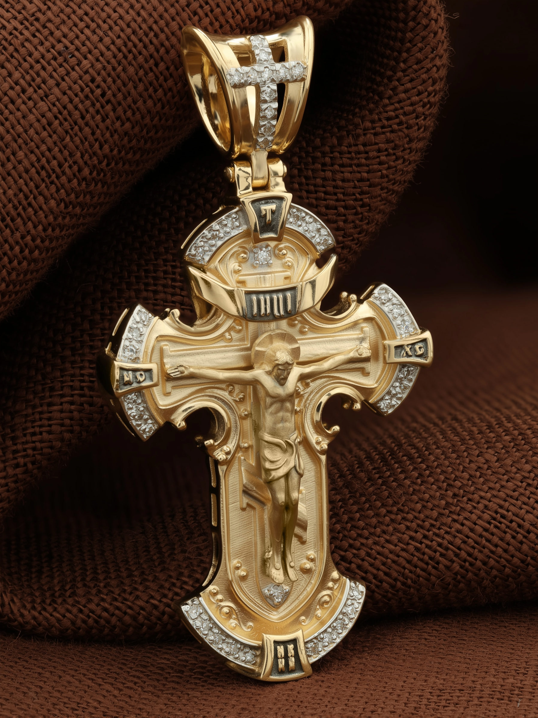 На лицевой стороне креста изображено Распятие Иисуса Христа на Голгофском Кресте, верхняя перекладина которого символизирует титло — табличку, на которой, согласно Евангелию, было начертано: Иисус Назорей Царь Иудейский (IНЦI). Справа и слева от Распятия изображены символы «IС ХС» — святое имя Христа. Внизу креста написано слово «НИКА», что значит «победитель». В верхней части креста обозначена буква «Т», которая символизирует одно из орудий страданий Господа — трость.