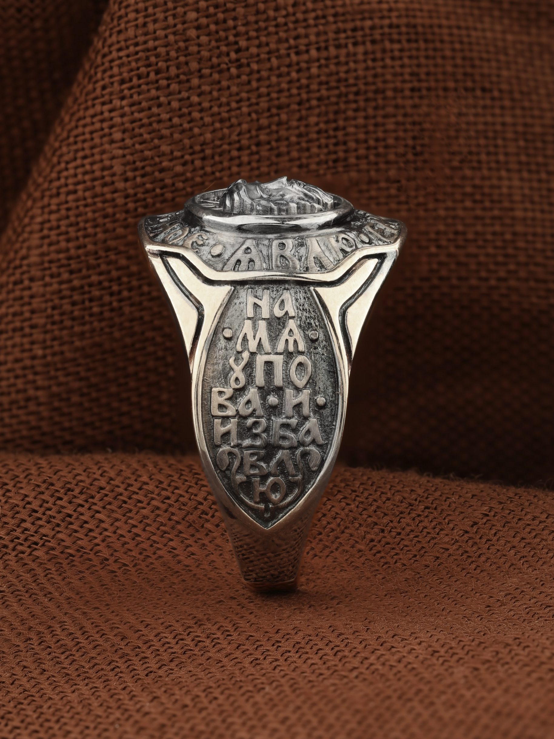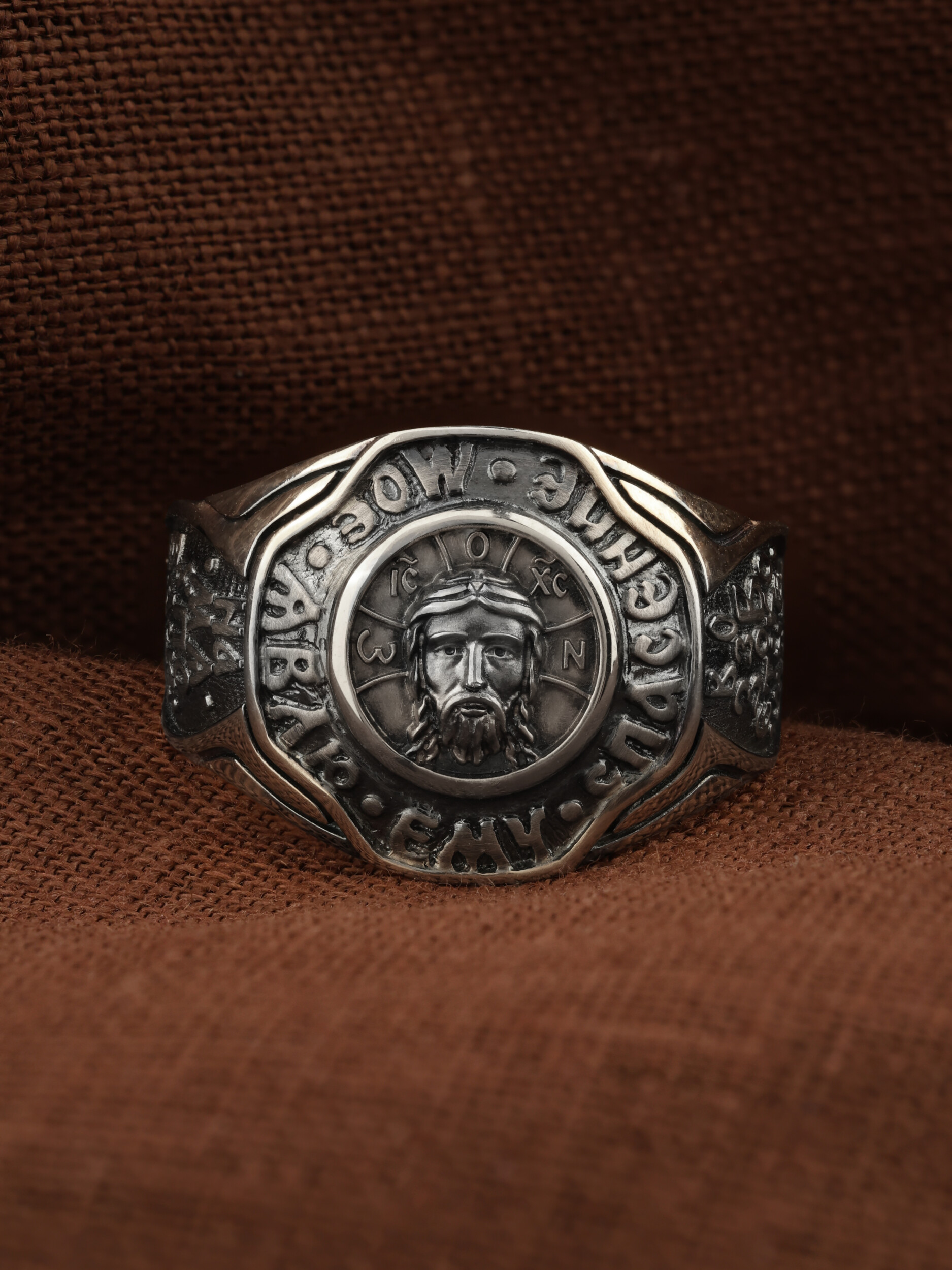 Кольцо «Господь Вседержитель» выполнено в древних христианских традициях. Спас Нерукотворный — образ Господа и Спасителя нашего Иисуса Христа, чудесно отпечатавшийся на плате, котором Христос вытер свой лик. Согласно Преданию, изложенному в Четьи Минее, Авгарь V Ухама, больной проказой, послал ко Христу своего архивария Ханнана (Ананию) с письмо, в котором просил Христа прийти в Едессу и исцелить его. Ханнан же был художником, и Авгарь поручил ему, если Спаситель не сможет прийти, то написать хотя бы Его образ и принести ему. Видя, что Ханнан хочет сделать Его портрет, Христос потребовал воды, умылся, вытер Свой лик платом, и на этом плате отпечатался Его образ. Спаситель передал этот плат Ханнану с повелением отнести с ответным письмом пославшему его. Получив портрет, Авгарь исцелился от главного своего недуга, но лицо его оставалось еще поврежденным. После Пятидесятницы в Едессу пошёл святой апостол Фаддей, один из 70-ти, закончил исцеление Авгаря и обратил его в христианство. Авгарь прикрепил образ к доске и поместил в нише над городскими воротами, убрав оттуда находившегося там идола. Лик Спасителя — в трехчастно разделенном нимбе, на котором начертана греческая монограмма «WOИ», что означает «Сущий» или «Тот, кто есть». Вокруг образа Спаса Нерукотворного надпись: «Явлю ему спасение Моё»