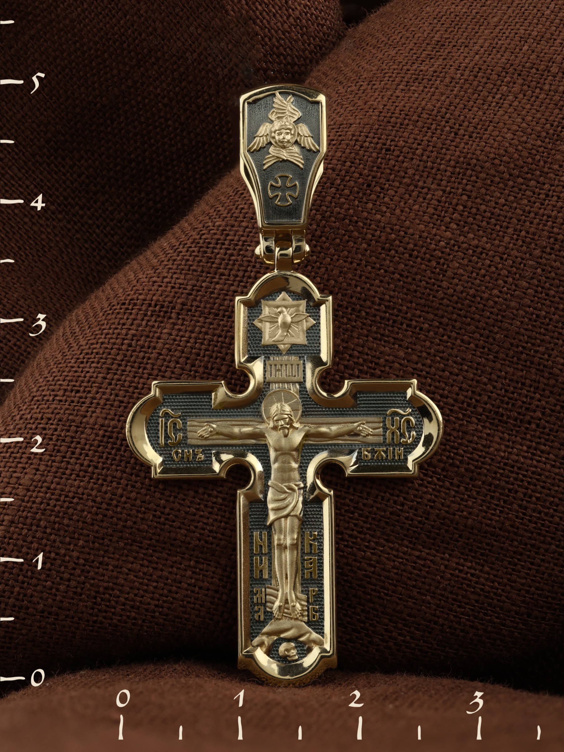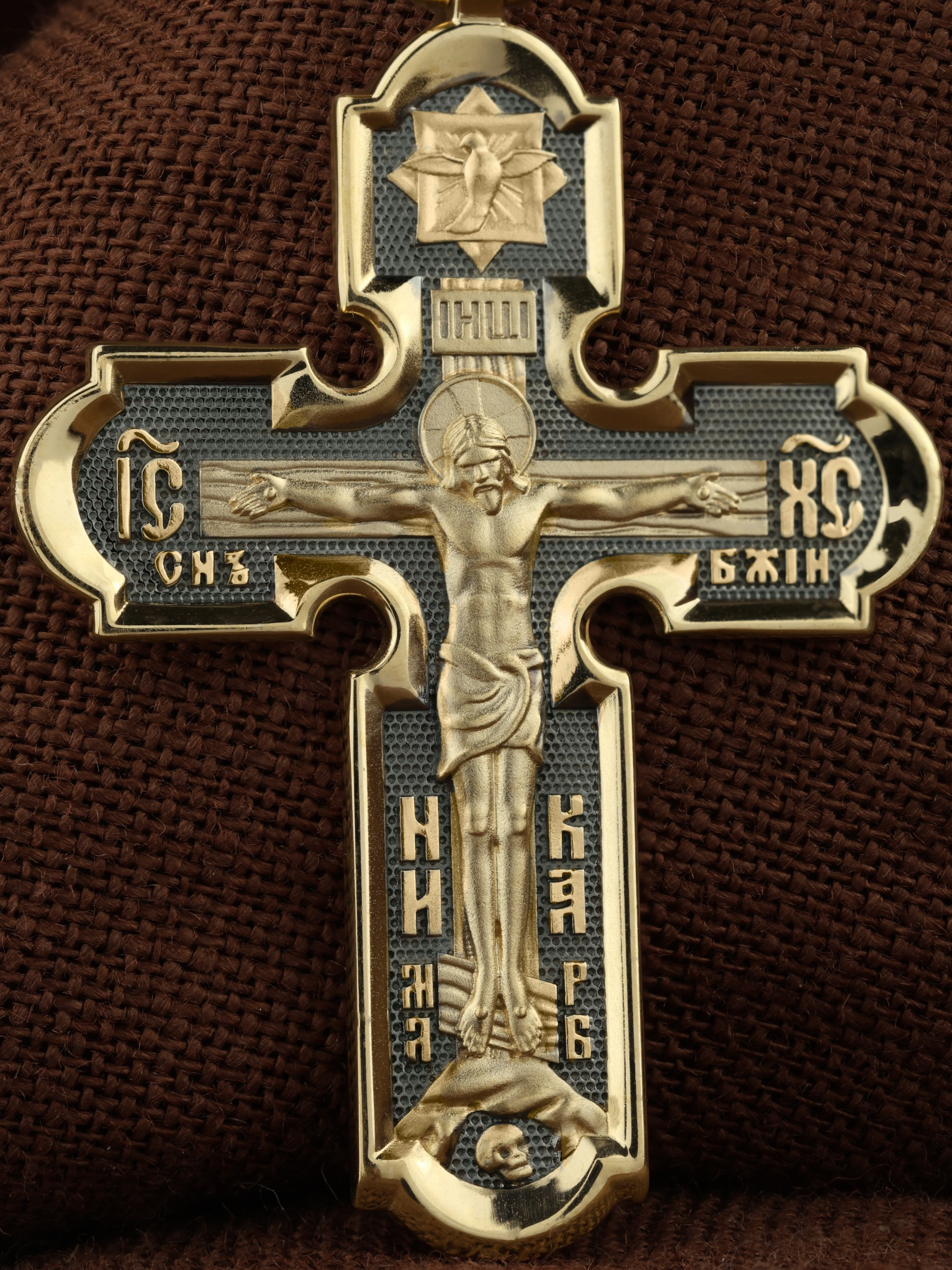 На лицевой стороне креста изображено Распятие Иисуса Христа. Господь представлен свободно покоящимся на кресте с простертыми руками и как бы обнимающим всю Вселенную. Он — Спаситель, искупивший грехи мира, «поправший смертию смерть» и призывающий к Себе «все концы земли». Поэтому рядом с Его образом помещены слова «НИКА» и «Царь Славы». Эти слова характеризуют Господа как Великого Архиерея, победителя смерти. Верхняя перекладина символизирует титло — табличку, на которой, согласно Евангелию, было начертано: Иисус Назорей Царь Иудейский (IНЦI). Также Распятие сопровождается надписями, олицетворяющими Христа. Это святое имя Христа «IC» (Иисус) «ХС» (Христос) и словосочетание «СЫН БОЖИЙ». Крест стоит на горе камней, символизирующих Голгофу, в основании которой различается череп. Это голова Адама. На кулонном кольце помещено изображение серафима.