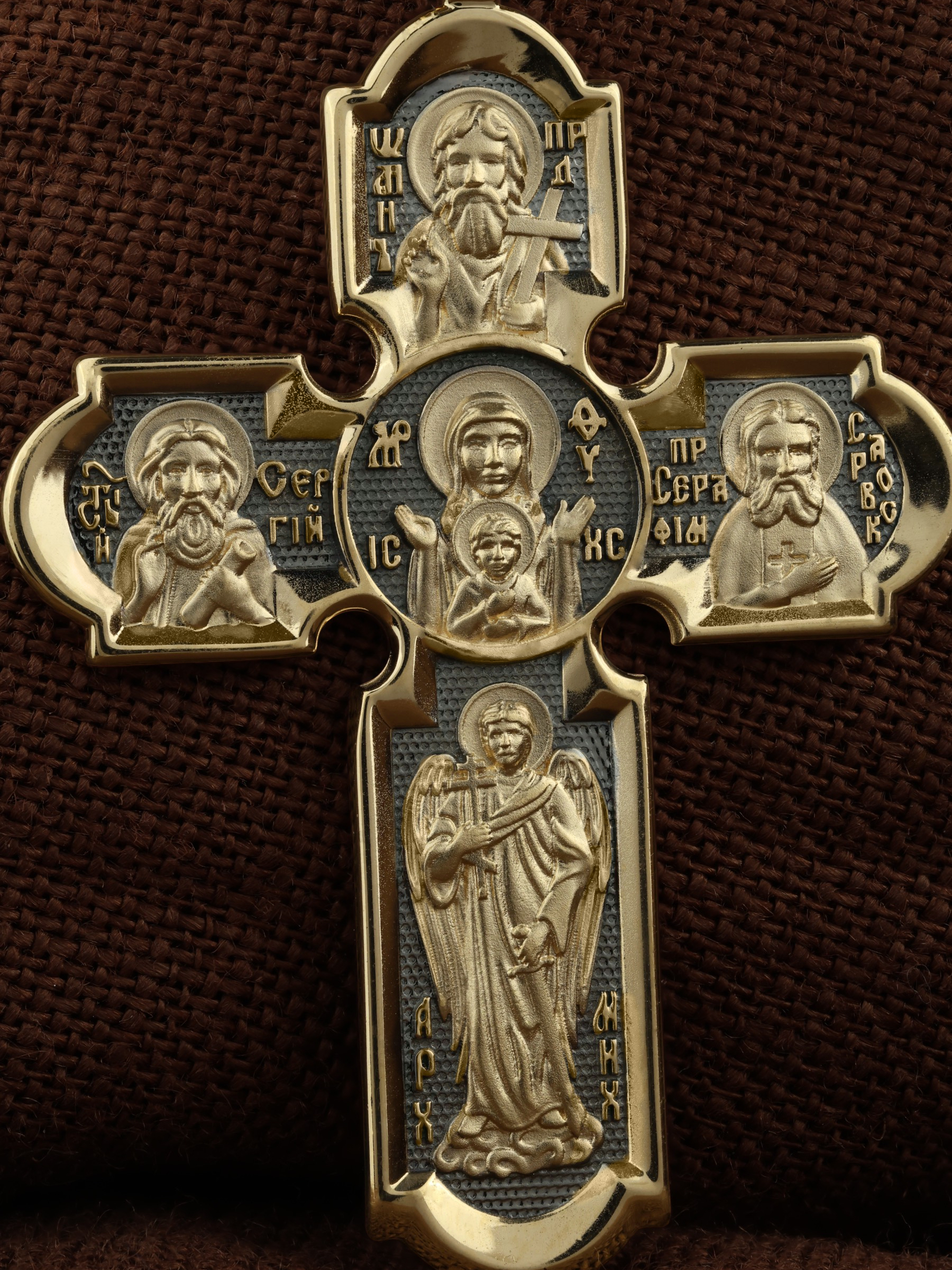 На кресте внизу изображен Ангел Хранитель, слева — Святая Блаженная Ксения, справа — Святая Блаженная Матрона, вверху — пророк, почитающийся в христианстве, Предтеча Господень Иоанн Креститель. На кулонном кольце помещено изображение Спаса Нерукотворного — образ Спасителя, который Он запечатлел на плате и передал для исцеления больному проказой царю Эдессы. Ему придается победное и защитное значение.