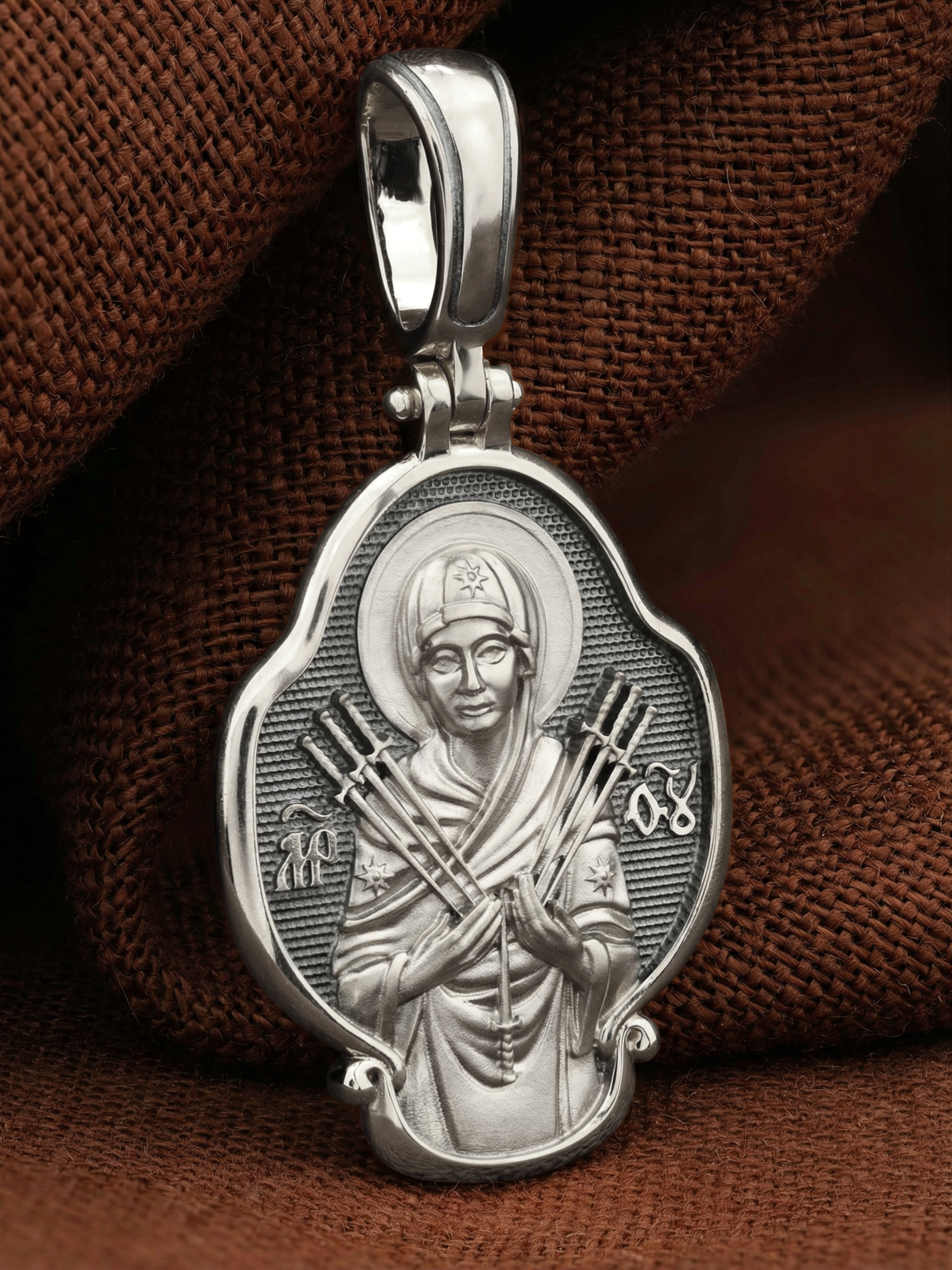 На лицевой стороне образка изображена икона Пресвятой Богородицы «Семистрельная» — одна из самых чудотворных икон на Руси. На протяжении многих веков христиане взывали к Царице Небесной через эту икону, если в стране начинались войны или мятежи.