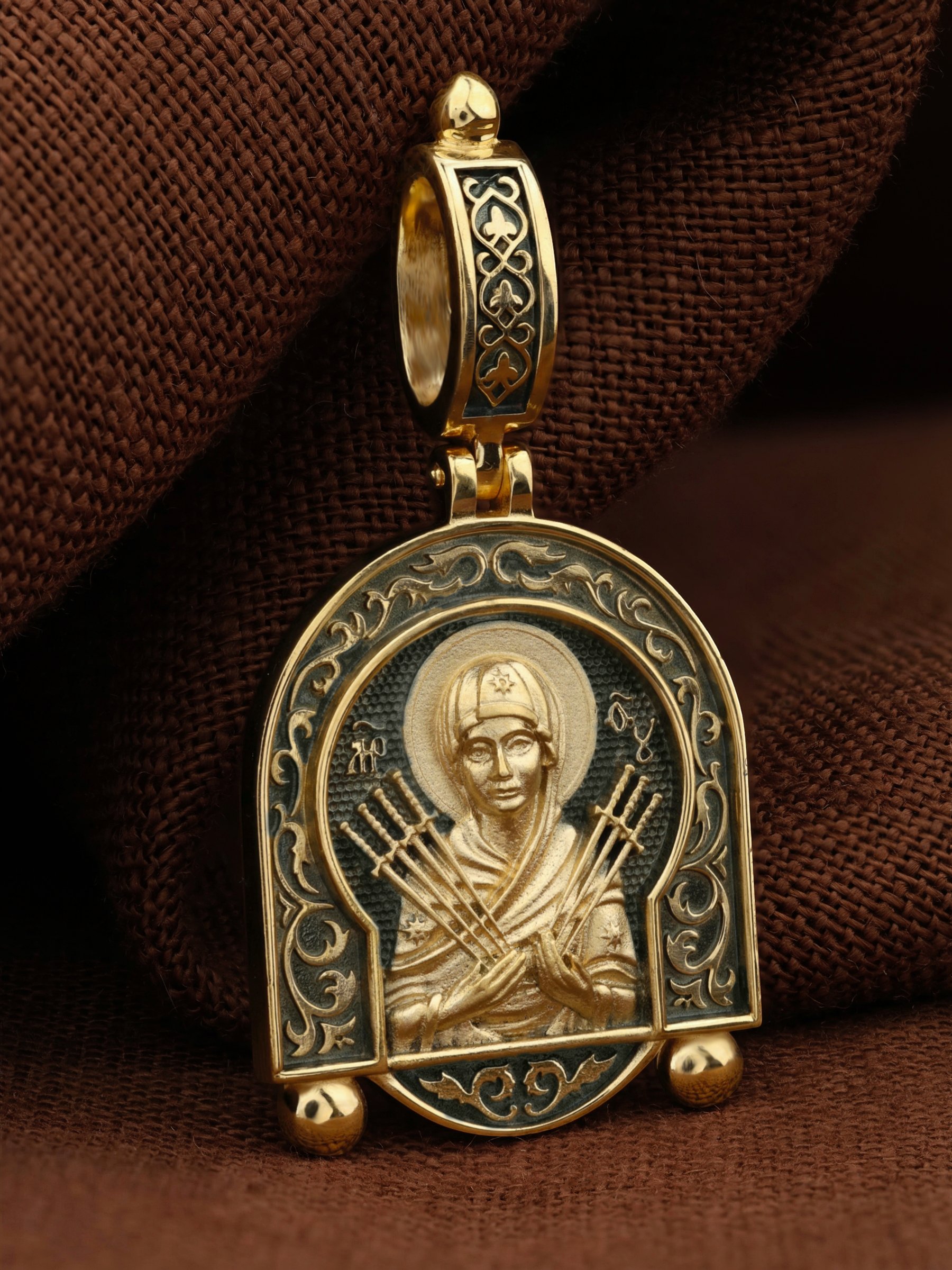 На лицевой стороне образка изображена икона Пресвятой Богородицы «Семистрельная» — одна из самых чудотворных икон на Руси. На протяжении многих веков христиане взывали к Царице Небесной через эту икону, если в стране начинались войны или мятежи.