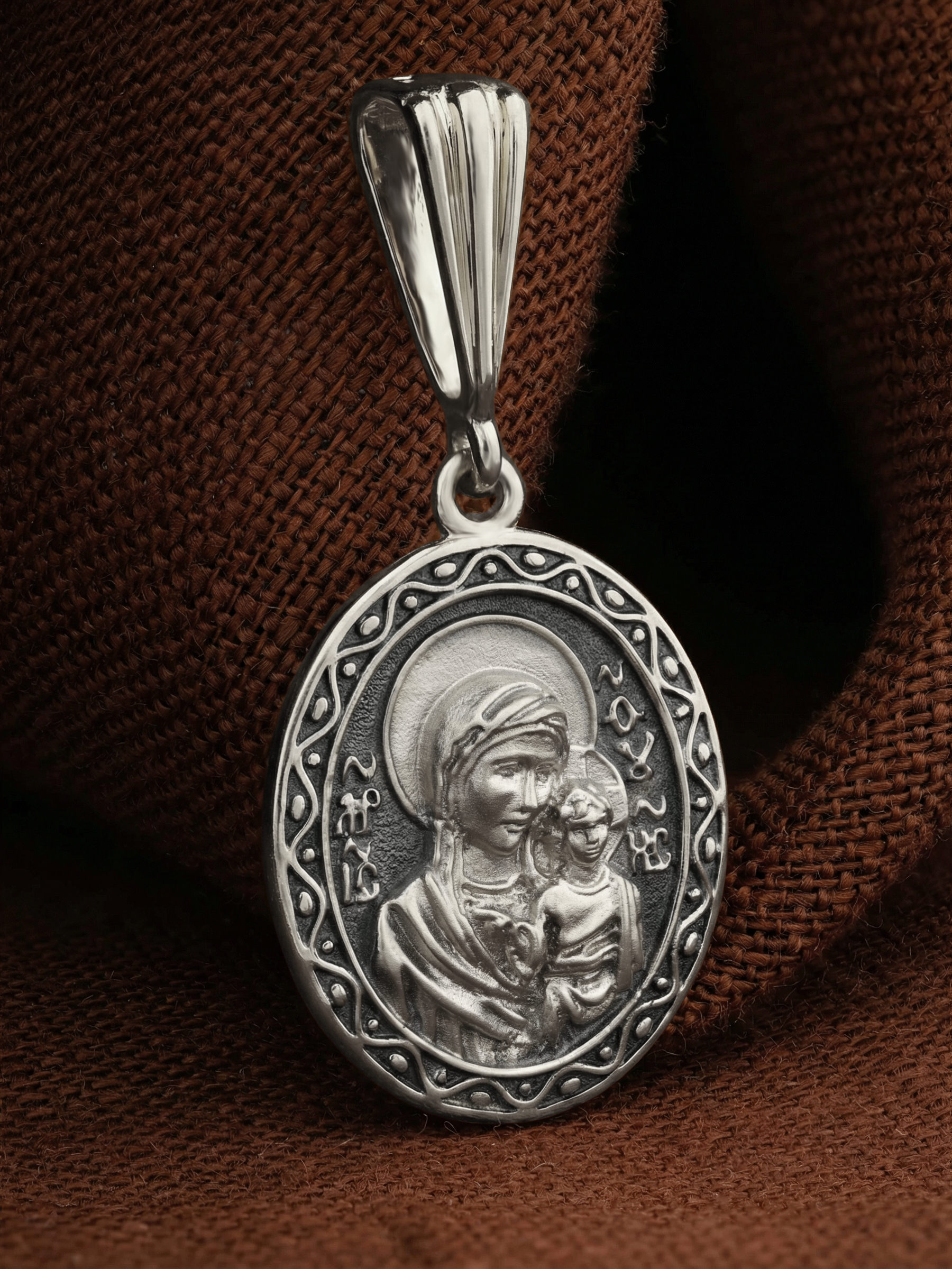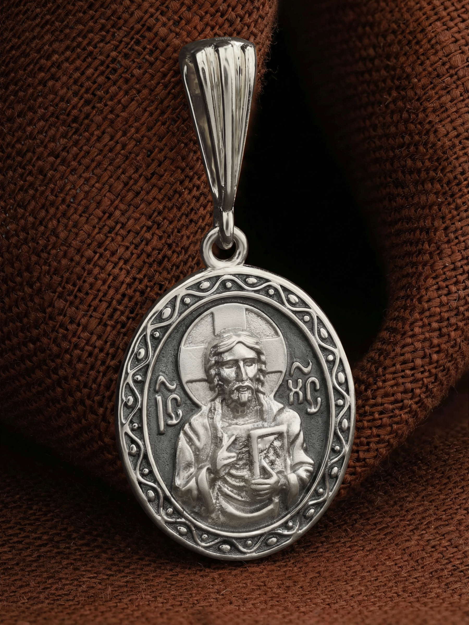 На лицевой части образка изображен Спас Вседержитель или Пантократор (от греч. «панкратос"— всевластный, всесильный) — центральный образ в иконографии Христа, представляющий Его как Небесного Царя и Судию. Господь правой рукой благословляет, а в левой держит Книгу Жизни, в которой для каждого человека есть своя страница.