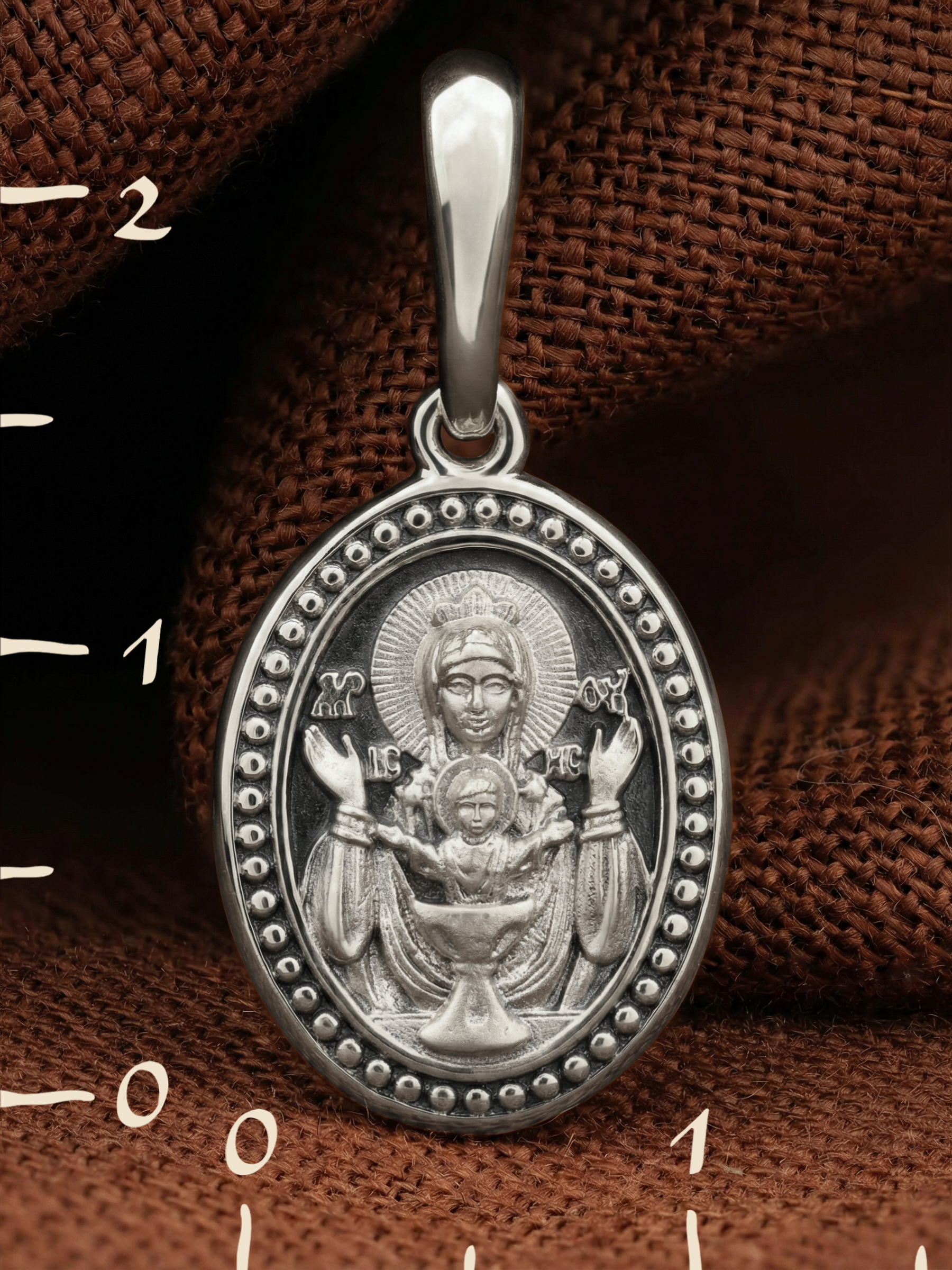 На лицевой части образка изображена икона Божией Матери «Неупиваемая чаша». Икона славится помощью в исцелении зависимостей, помогает людям обрести свободу от греховных страстей.