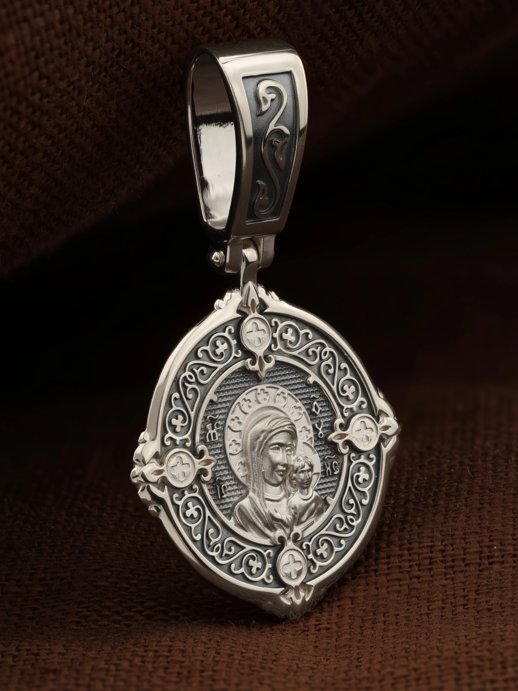 На лицевой части образка изображена Казанская икона Пресвятой Богородицы — одна из самых почитаемых в России чудотворных икон Богородицы. Богословское значение Казанской иконы — указать верующим истинный Путь к спасению, который лежит через Христа. Только Божия Матерь имеет настолько сильное дерзновение к Спасителю, что может ходатайствовать перед Ним за всех верных. Именно этот образ дарится новой повенчанной паре, как хранитель очага и семейная реликвия. Молитва перед Казанской иконой Божьей Матери помогает во всех сложных случаях жизни, в болезнях, во всех печалях, невзгодах, скорбях. Уникальная история появления, чудеса, случившиеся по молитвам православных людей возле образа — все это делает Казанскую Богородицу особенной, среди тысяч других икон.