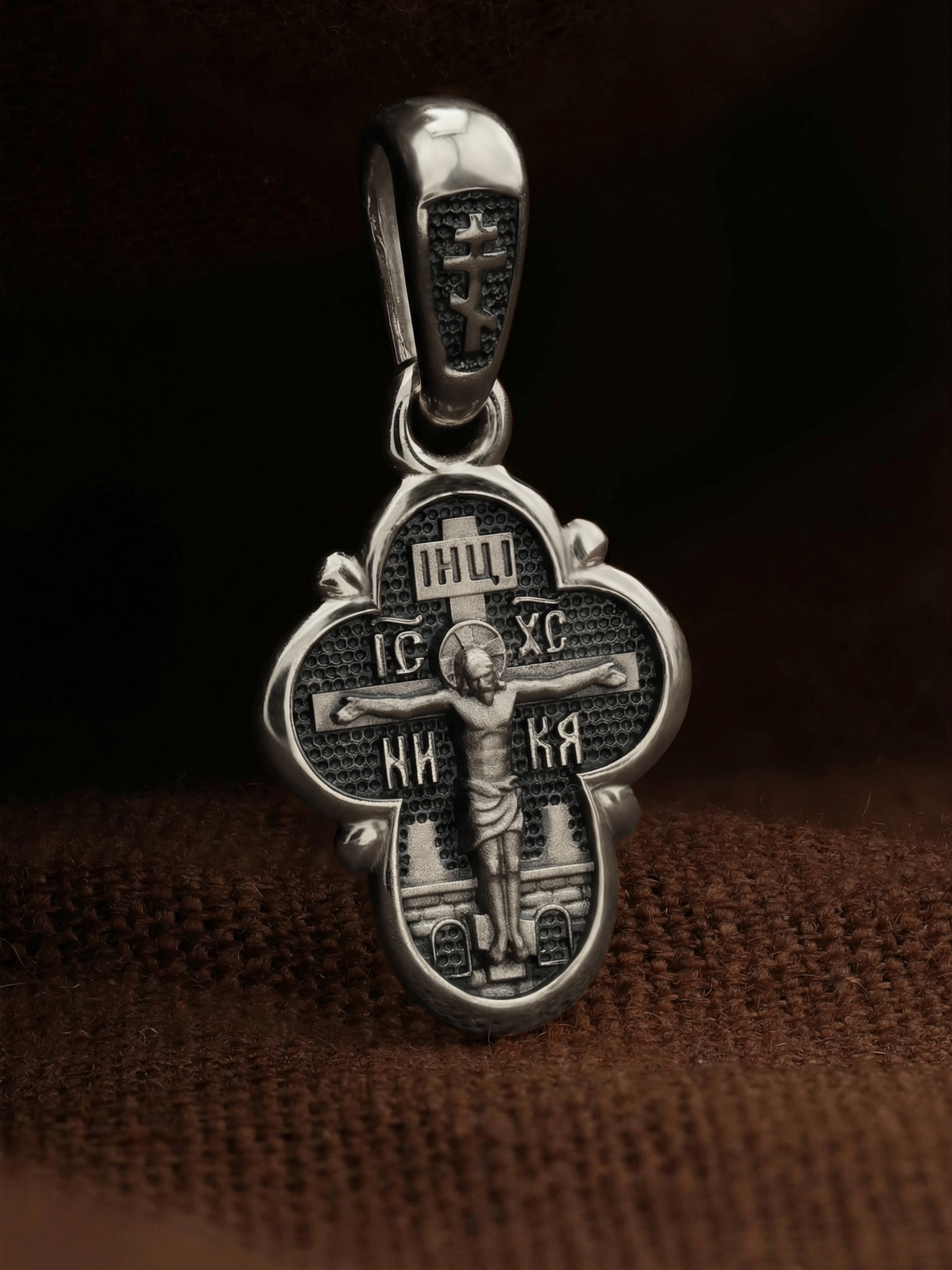 На лицевой стороне креста изображено Распятие Господа и Спасителя нашего Иисуса Христа, отдавшего Себя на смерть, для искупления грехов мира. Крест является символом жертвенной любви Всеблагого Бога к падшим людям, всепобеждающим духовным оружием христиан, основанием и средоточием церковной жизни. Господь сказал: «кто хочет идти за Мною, отвергнись себя, и возьми крест свой, и следуй за Мною». (Мк. 8: 34). На верхней табличке, выше головы Иисуса, расположена надпись, составленная Понтием Пилатом — «IНЦI». Она означает «Иисус Назорей, Царь Иудейский». Надпись «IC» «ХC», означает Иисус Христос, помещается на разных сторонах поперечной перекладины креста. Рядом — слово «НИКА», что означает «победитель». За крестом высится Иерусалимская стена. Над вершиной Распятия, на кулонном кольце, помещен крест.