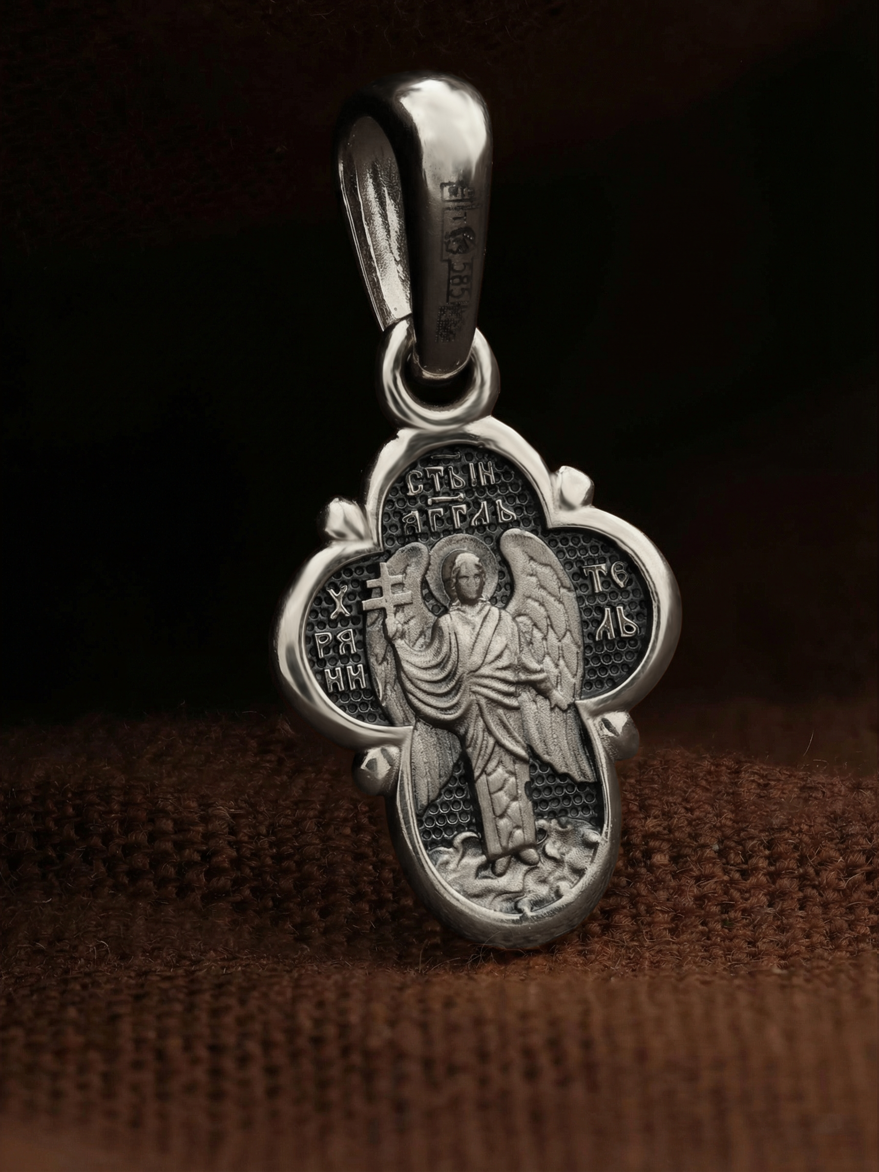 На оборотной стороне креста изображен Святой Ангел-Хранитель держащий в правой руке крест. Ангел-Хранитель — это Ангел приставляемый Богом к человеку при крещении для охраны и помощи в добрых делах. Он невидимо находится при человеке на протяжении всей его жизни, если человек сохраняет в себе любовь к Богу и истинную веру перед Ним. Ангел-Xранитель делают для нас все, что служит к истинному нашему благу и спасению. Невидимо пребывая при нас постоянно, он, руководствуя нас ко спасению, не только по нашему желанию таинственно наставляет нас на все доброе и полезное, не только возносит наши молитвы к Богу, но еще и сам от себя охраняют и защищают нас от врагов видимых и невидимых и ходатайствует за нас пред Богом. Ангел-Хранитель так любит нас, как никто на земле любить не может. Одного лишь каждому из нас он желает — спасения души; к этому он направляет все свои заботы.
