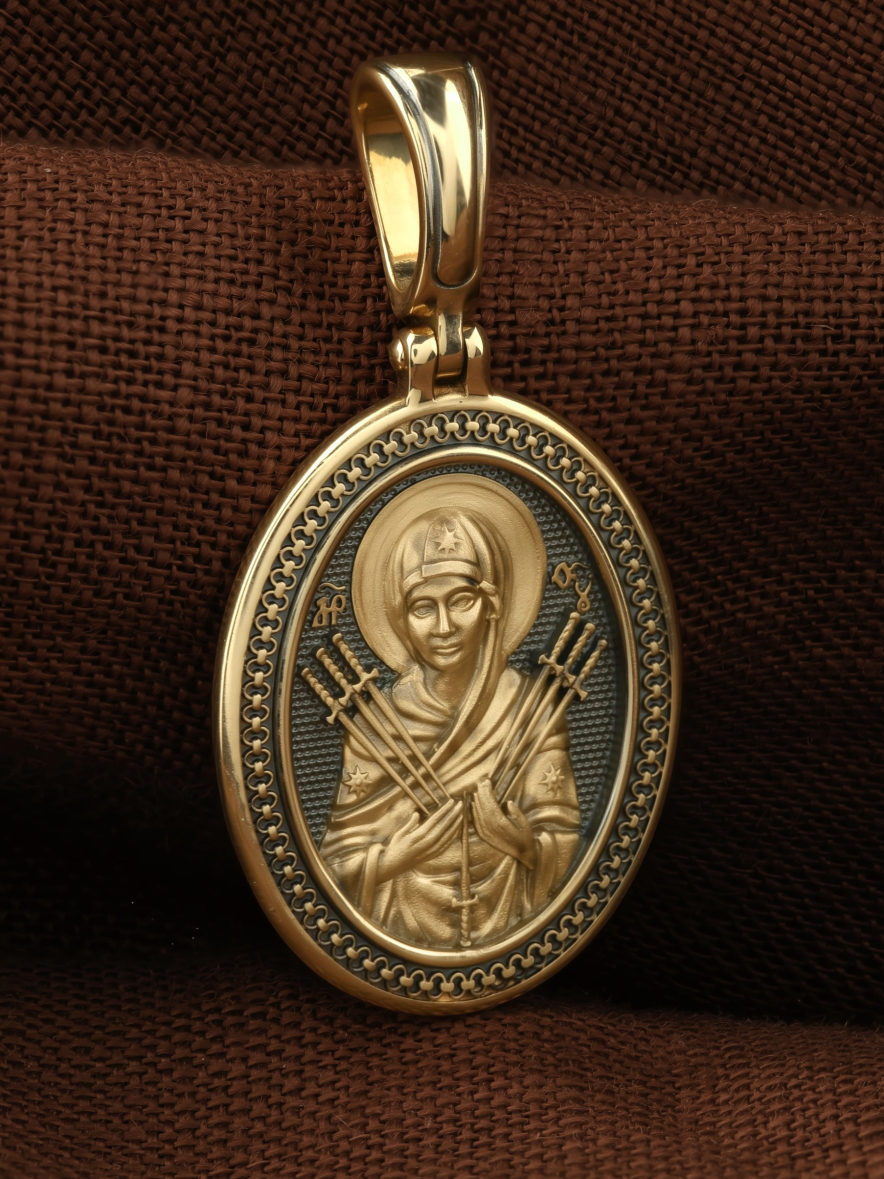 На лицевой стороне образка изображена икона Пресвятой Богородицы «Семистрельная» — одна из самых чудотворных икон на Руси. На протяжении многих веков христиане взывали к Царице Небесной через эту икону, если в стране начинались войны или мятежи.