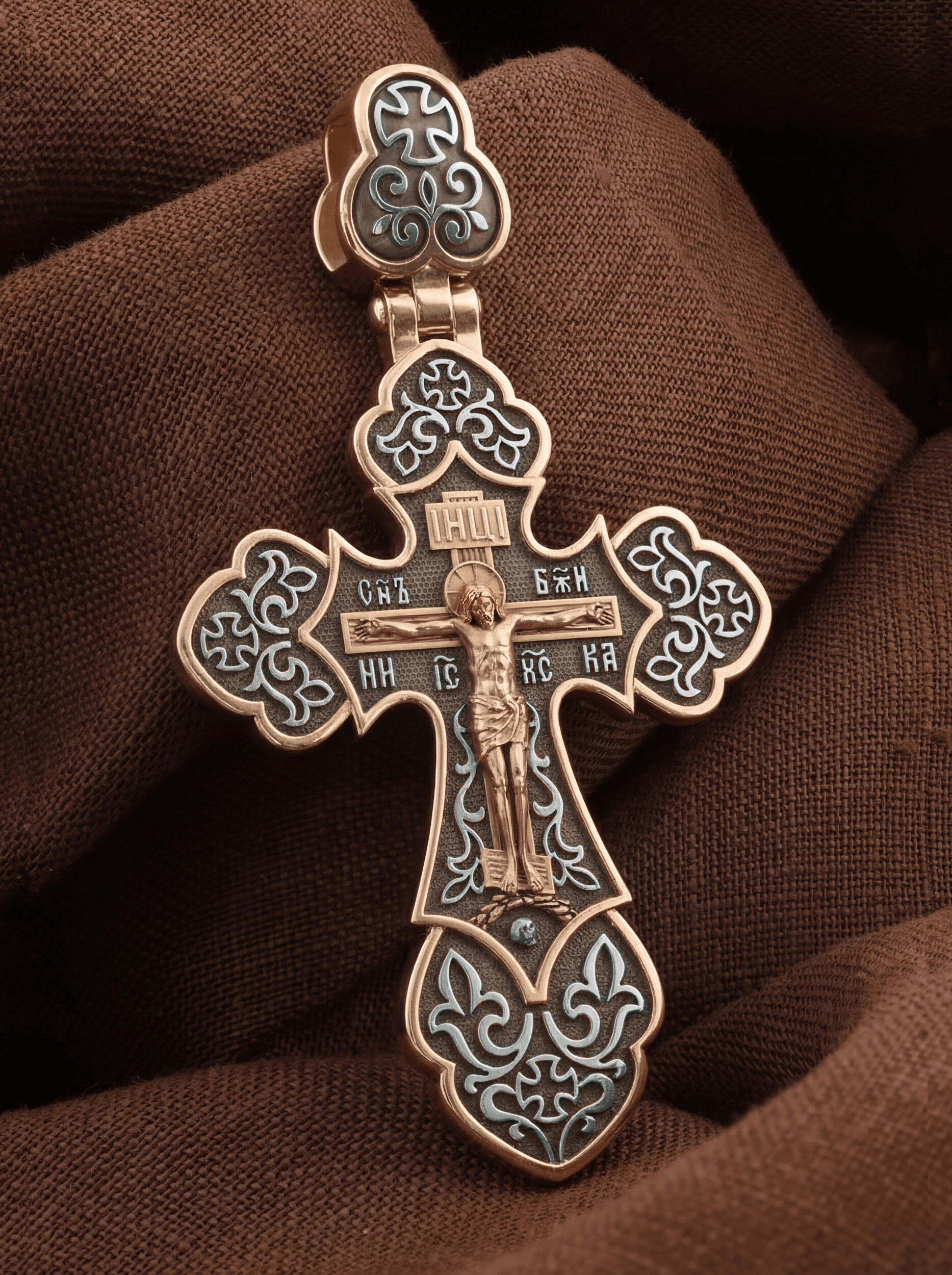 Крест с рельефным изображением Распятия в окружении пышных цветов и ажурного узора, напоминает нам о красоте Райского сада. Такой крест вводит мотив процветшего креста и ассоциируется с образом райского Древа Жизни. Как через древо познания пришла смерть, так через Крест Христа — «Древо Жизни» — даровано спасение.