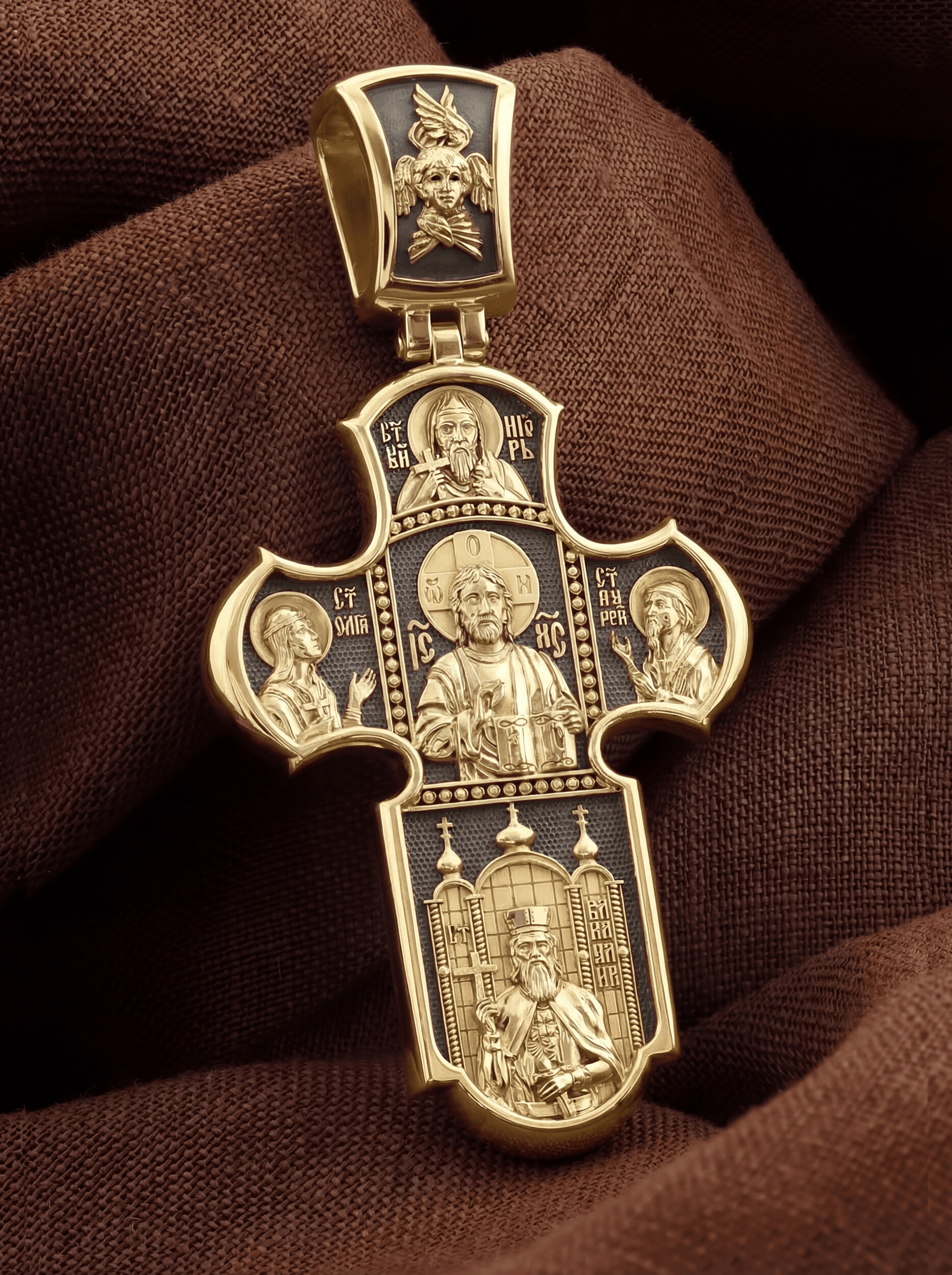 Образ Христа на лицевой стороне символически являет Господа как вершителя судеб человеческих, всесильного и всемогущего Бога. Господь правой рукой благословляет, а в левой держит Книгу Жизни, в которой для каждого человека есть своя страница. Рядом с Христом — Святая равноапостольная великая княгиня Ольга и Святой апостол Андрей Первозванный. Над образом спасителя изображен Святой благоверный князь Игорь. Внизу — Святой равноапостольный великий князь Владимир, креститель Руси.