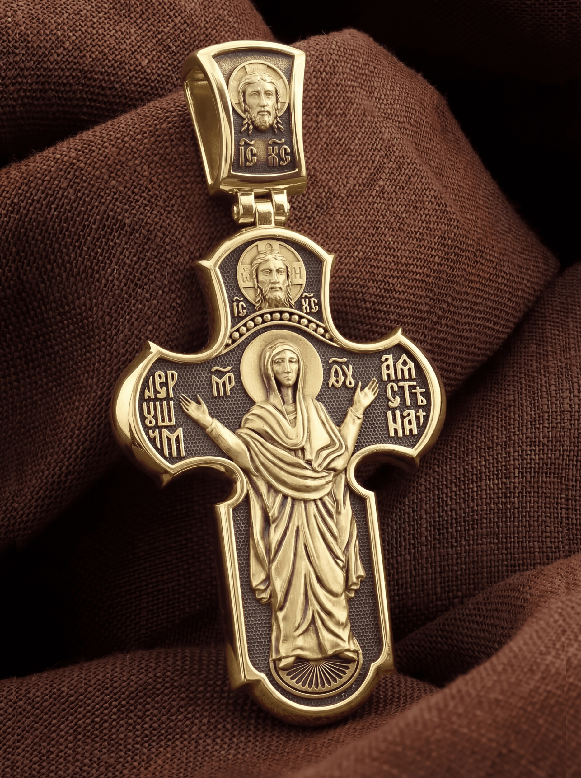 На обороте креста изображена одна из самых древних и почитаемых святынь — икона Божией Матери «Нерушимая Стена». Это величественное изображение, представляющее Божью Матерь в позе Оранта, с воздетыми в молении руками. Особенно почитается эта икона как помощница в тяжелых жизненных ситуациях, как защитница от врагов и спасительница в смертельной опасности. Над образом Божией Матери помещено изображение Спаса Нерукотворного — образ Спасителя, который Он запечатлел на плате и передал для исцеления больному проказой царю Эдессы. Ему придается победное и защитное значение.