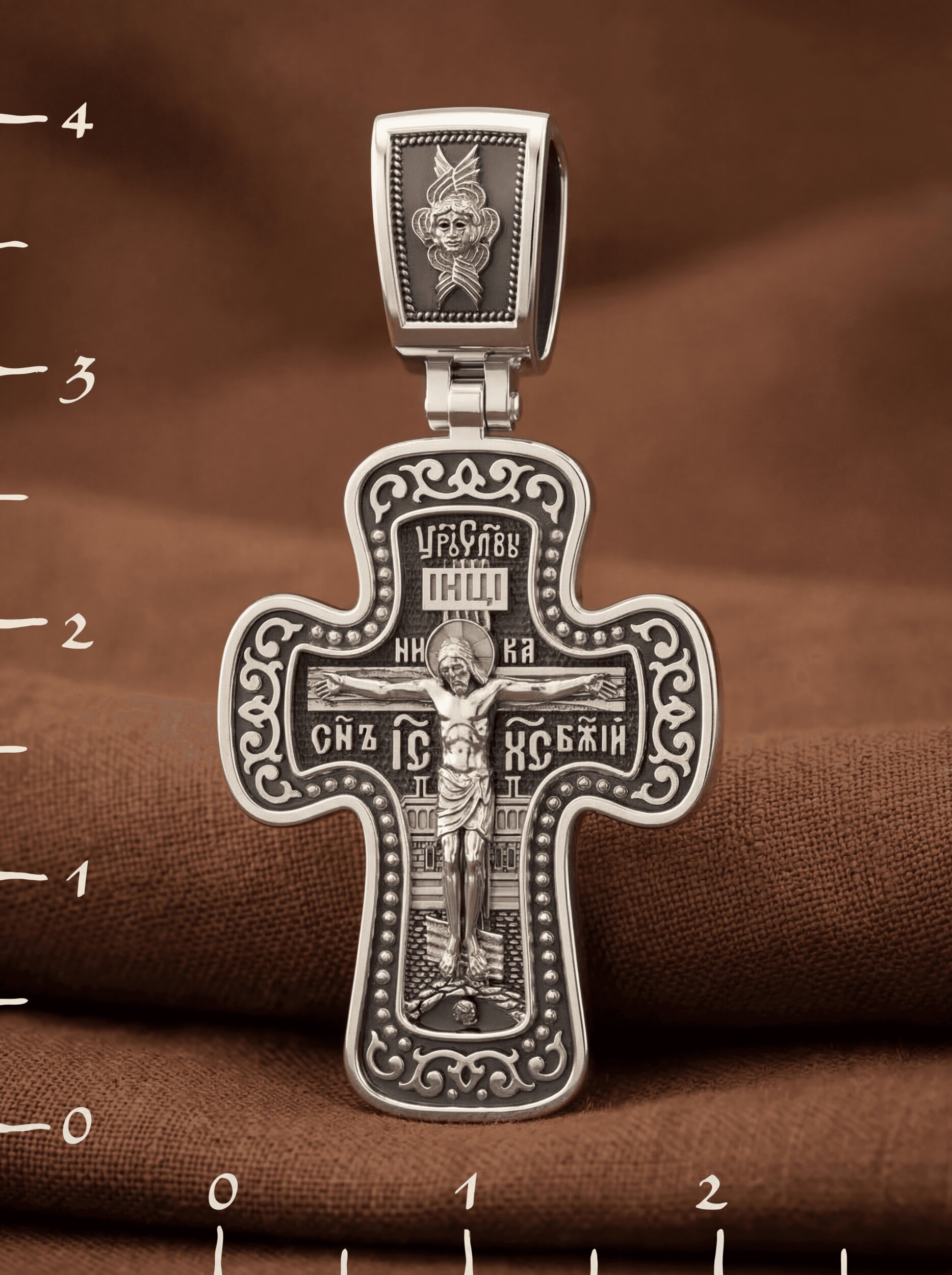Распятие сопровождается каноническими надписями. Это святое имя Христа, которое принято писать на иконах сокращенно — «ИС ХС», словосочетание «СЫН БОЖИЙ», что означает божественную природу Иисуса Христа. Рядом с Его образом помещены слова «Царь Славы». Над головой Господа на поперечной перекладине аббревиатура «IНЦI», что символизирует табличку, которая была прибита к Кресту, с надписью «Иисус Назорей Царь Иудейский». На кулонном кольце помещено изображение серафима.