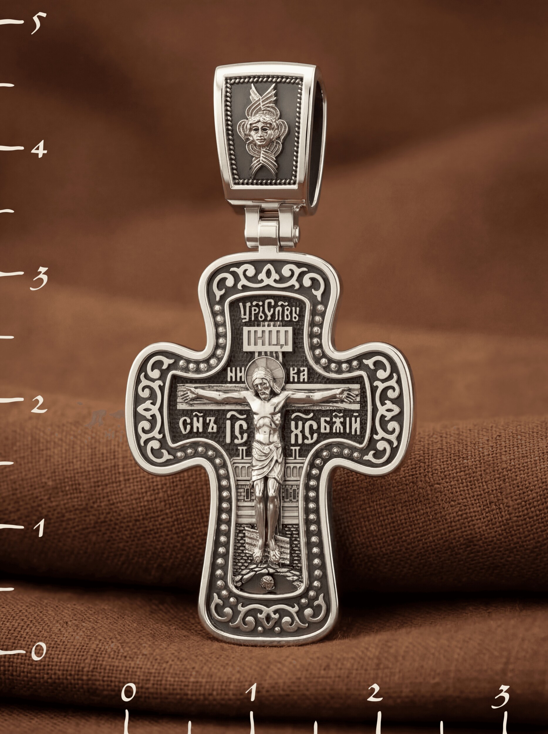 Распятие сопровождается каноническими надписями. Это святое имя Христа, которое принято писать на иконах сокращенно — «ИС ХС», словосочетание «СЫН БОЖИЙ», что означает божественную природу Иисуса Христа. Рядом с Его образом помещены слова «Царь Славы». Над головой Господа на поперечной перекладине аббревиатура «IНЦI», что символизирует табличку, которая была прибита к Кресту, с надписью «Иисус Назорей Царь Иудейский». На кулонном кольце помещено изображение Серафима.