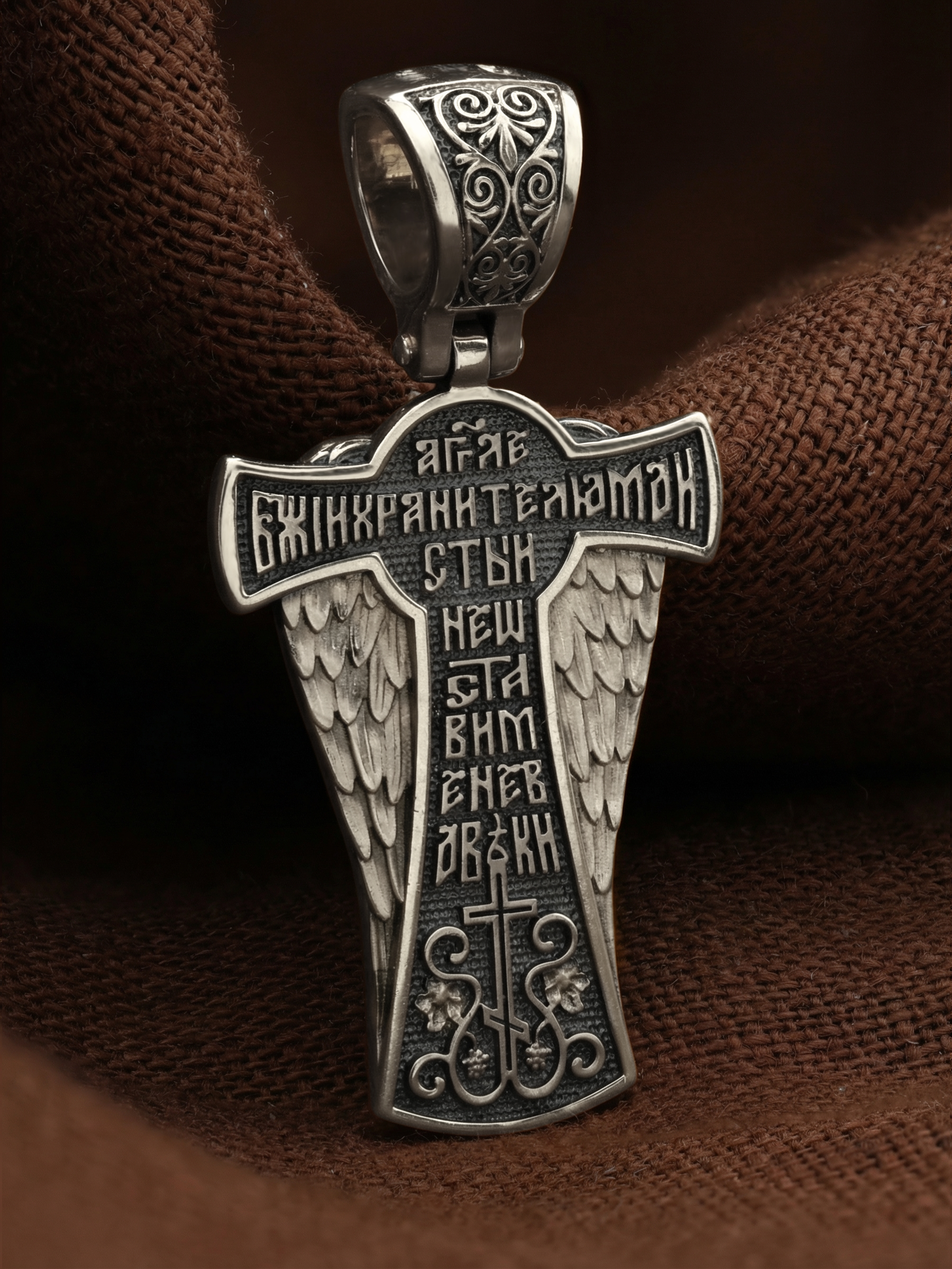 На оборотной стороне креста написана молитва: «Ангеле Божий, хранителю мой святый, не остави мене во веки».