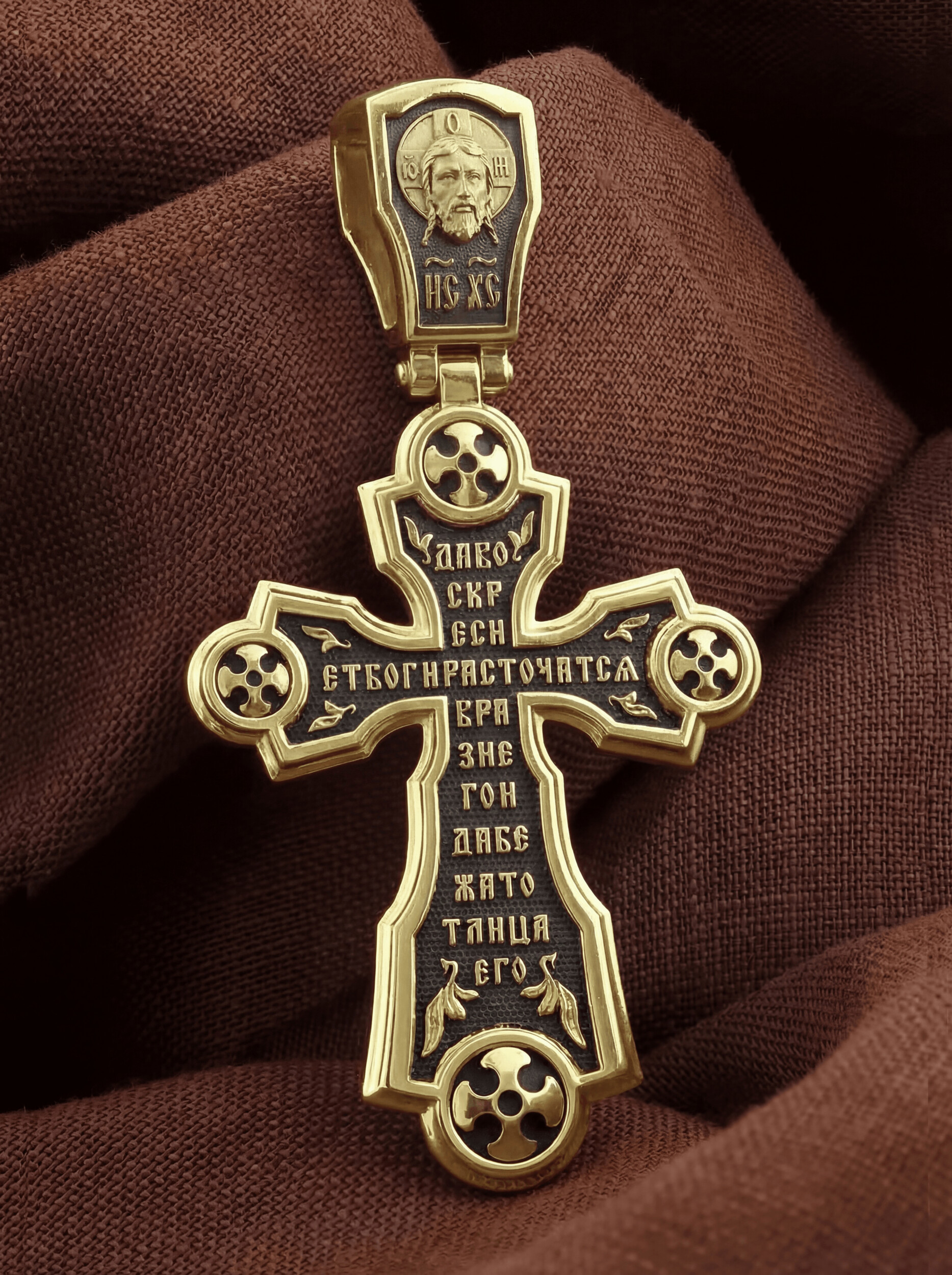 Всю оборотную часть креста занимает начальный стих оградительной молитвы Честному Кресту Господню: «Да воскреснет Бог, и расточатся врази Его, и да бежат от лица Его…».