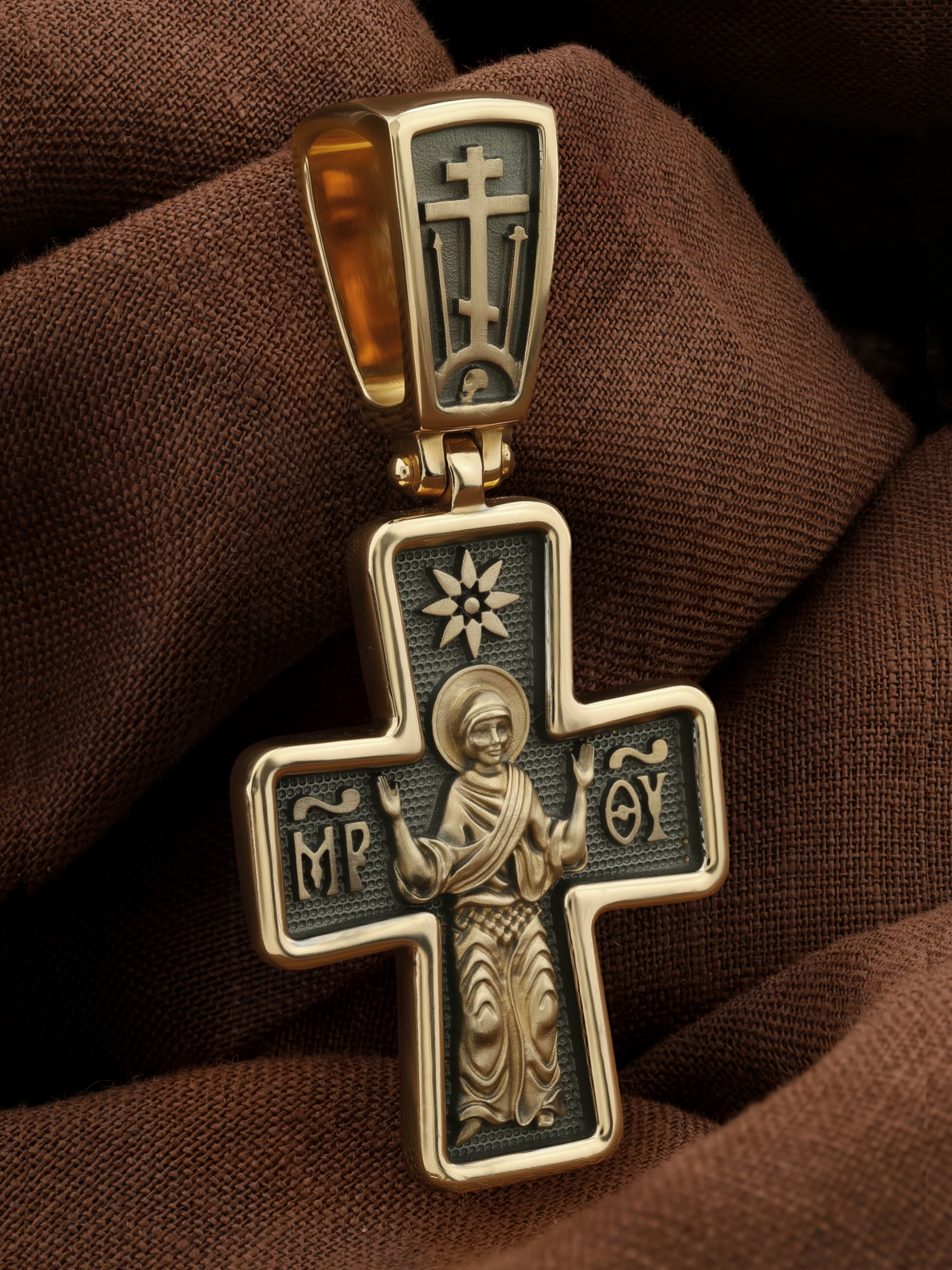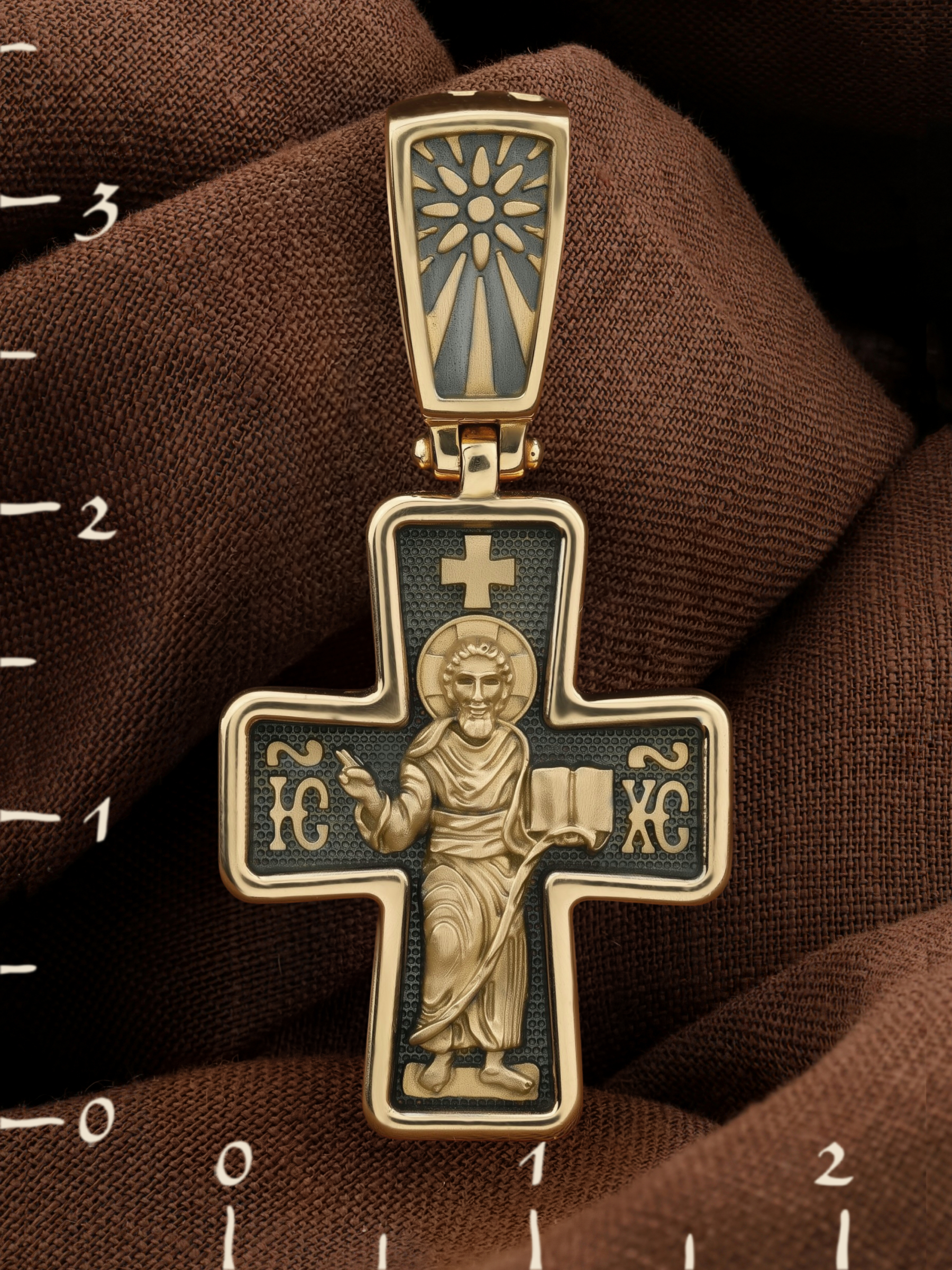На лицевой стороне креста изображена икона Господа и Спасителя нашего Иисуса Христа — Господь Вседержитель или Пантократор. Он представлен как Царь Небесный и будущий Судия мира. Именование Иисуса «Вседержителем» указывает, с одной стороны, на Его Божественную природу: «Аз есмь Альфа и Омега, начало и конец, говорит Господь, Который есть и был и грядет, Вседержитель» (Откр. 1: 8). С другой стороны, такое именование связано и с человеческой природой Христа, искупившего крестной жертвой людские грехи и обновившего тем самым человеческую природу. Правой рукой Он благословляет, а левой держит Книгу. Она символизирует Евангелие — благую весть, принесенную Христом всему миру. Указывая на раскрытое Евангелие и одновременно благословляя, Иисус недвусмысленно указывает нам путь к спасению души.