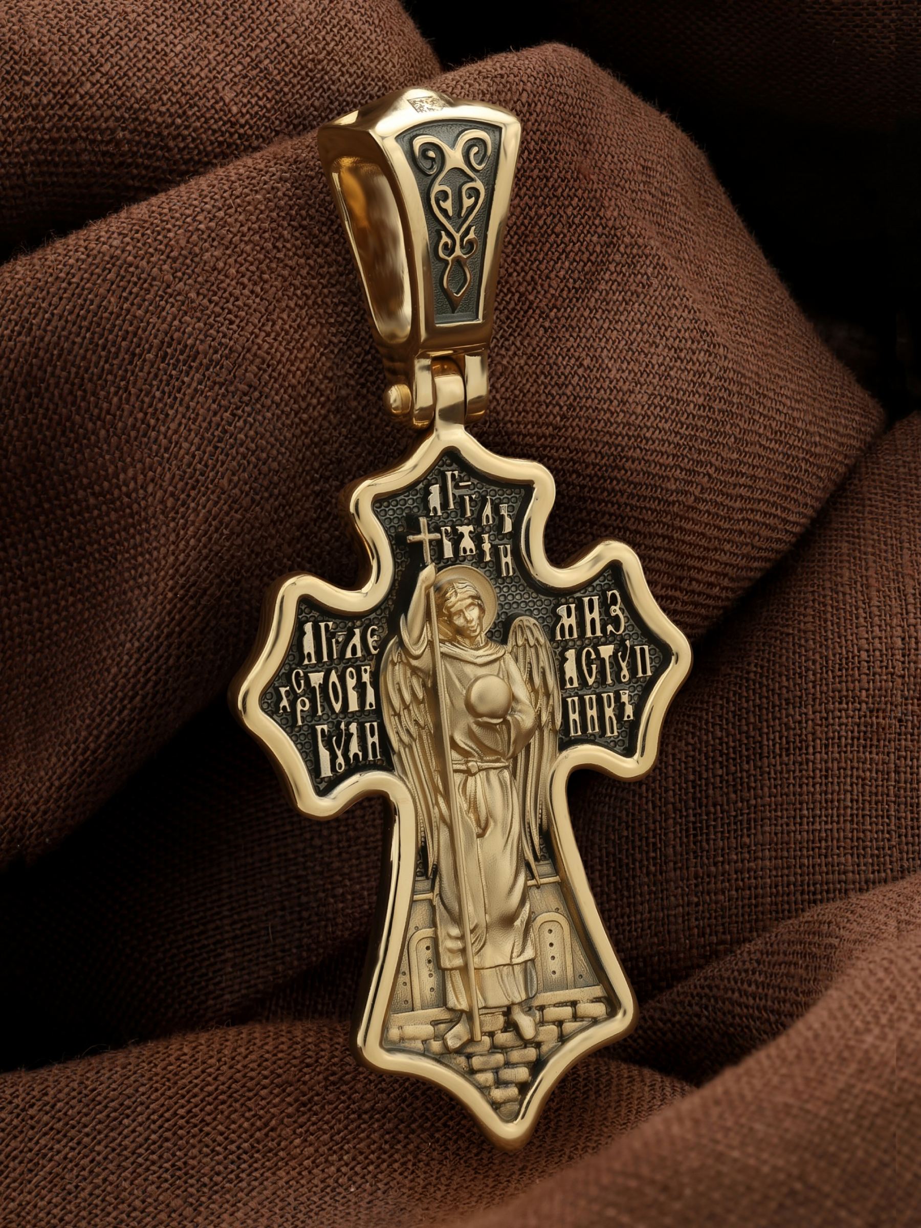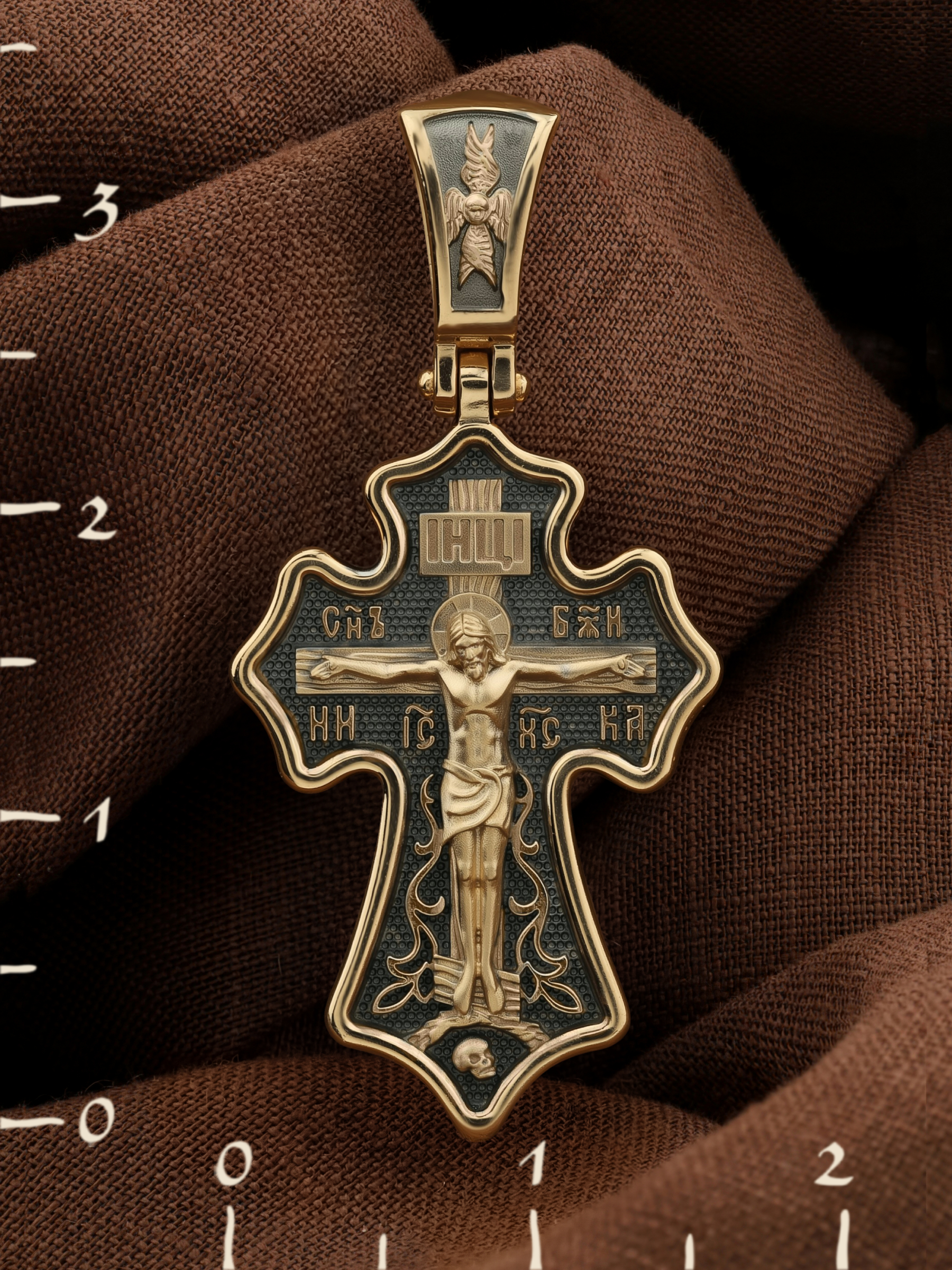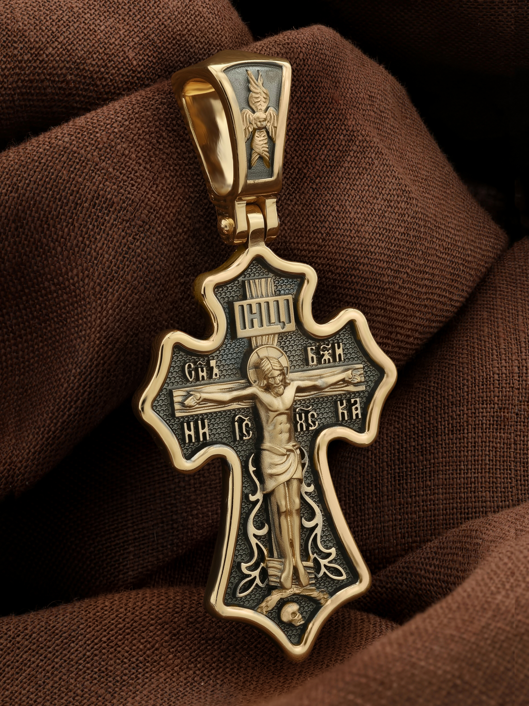 На лицевой стороне креста изображено Распятие, потому что это орудие казни Иисус Христос сделал орудием победы над грехом и смертью. Своими страданиями Он искупил грехи человечества, умерев и сошествовав во ад, победил сатану, освободил души праведников от вечной смерти и открыл им небесные врата рая. Жертва Христа сделала возможным спасение для каждого человека. На православном кресте Христос не умирает, а свободно простирает руки, ладони Иисуса открыты, будто он хочет обнять все человечество, даря им свою любовь и открывая путь к вечной жизни. Верхняя перекладина символизирует собой табличку с надписью «IHЦI» — Иисус Назарянин Царь Иудейский. Над перекладиной пишется словосочетание «СНЪ БЖIЙ» — СЫН БОЖИЙ. Ниже перекладины пишется сокращенно имя Спасителя «IC XC» — Иисус Христос и слово «НИКА» (греч. — Победитель). Возвышение, на котором стоит Крест, символизирует гору Голгофу, на которой произошло Распятие. У подножия Креста изображают прах Адама, обозначенный черепом. На кулонном кольце изображен шестикрылый Серафим — самый приближенный к Господу Ангел.