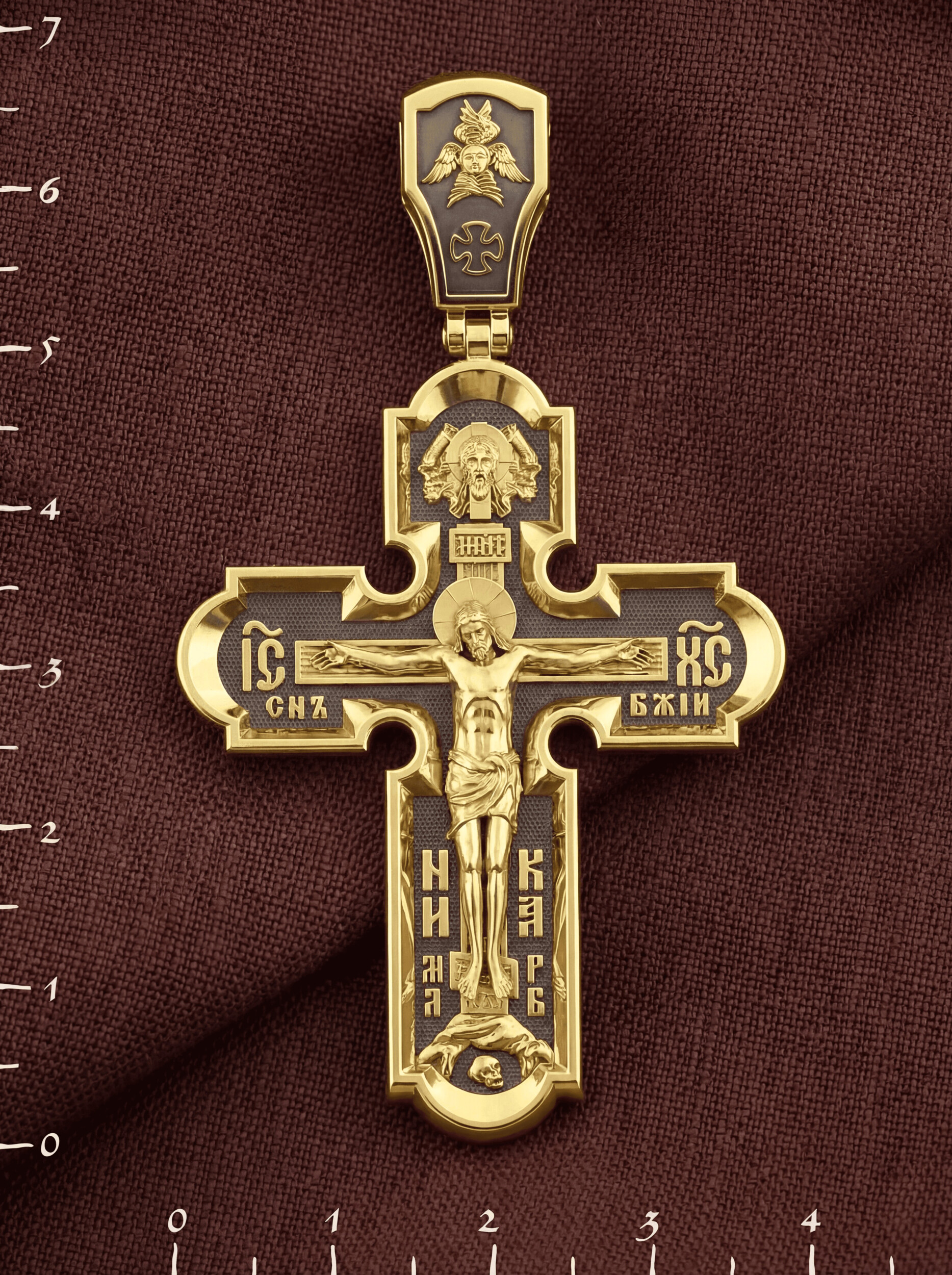 На лицевой стороне нательного креста по традиции изображено Распятие Господа нашего Иисуса Христа. Крест Господень стоит на небольшом каменистом возвышении, символизирующем гору Голгофу, которая обозначена буквами МЛРБ (Место Лобное Рай Бысть). Над головой Господа на поперечной перекладине написано «ИНЦИ», что символизирует табличку, которая была прибита к Кресту, с надписью «Иисус Назорей Царь Иудейский». Этим иудеи хотели посмеяться над Христом, не зная, что распинают истинного Царя всех царей. По сторонам основной перекладины расположены позолоченные рельефные инициалы Христа «ИС ХС». Под перекладиной, по сторонам древа, находится надпись «СЫН БОЖИЙ», а в основании креста — надпись «НИКА» (Победитель).