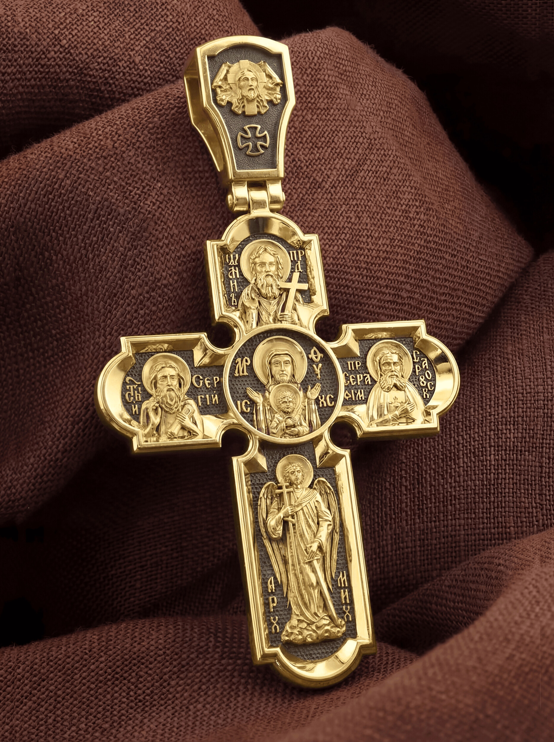 Центральную часть оборотной стороны креста украшает икона Божией Матери «Знамение». Иконы Божией Матери, известные под именем «Знамение», появились на Руси в XI — XII веках, а называться так стали после чудесного знамения от Новгородской иконы, случившегося в 1170 году. Многочисленные списки с иконы Знамения известны по всей России. Многие из них просияли чудесами в местных храмах и были наименованы по месту явления чудес. На кресте внизу изображен Архангел Михаил, слева — Преподобный Сергий Радонежский, справа — Преподобный Серафим Саровский, вверху — Предтеча Господень Иоанн Креститель. На кулонном кольце помещено изображение Спаса Нерукотворного — образ Спасителя, который Он запечатлел на плате и передал для исцеления больному проказой царю Эдессы. Ему придается победное и защитное значение.