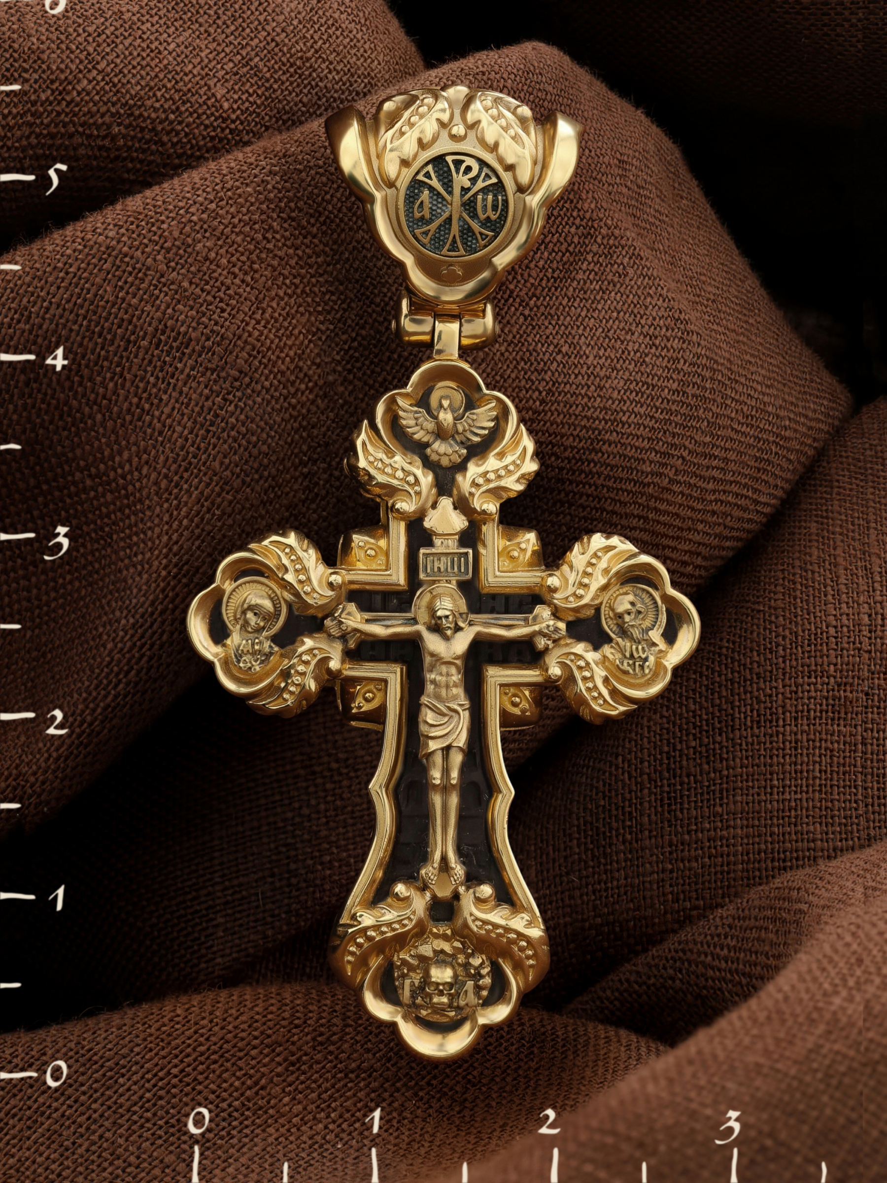 На лицевой стороне креста изображено Распятие Господа и Спасителя нашего Иисуса Христа. Крест- символ спасения и искупления рода человеческого, знамение победы над смертью и адом. Иисус Христос, как искупительная жертва освобождения человечества от власти греха, умер крестной смертью и в третий день воскрес. На верхней табличке, выше головы Иисуса, расположена надпись, составленная Понтием Пилатом — «ИНЦИ». Она означает «Иисус Назорей, Царь Иудейский». Над перекладиной написано сокращенно имя Спасителя «IC» «XC» — Иисус Христос. Ниже перекладины написано слово «НИКА» (греч. — Победитель). Крест стоит на горе камней, символизирующих Голгофу. В ее основании различается череп и надписи «Г.А.» — это голова Адама. Слева от Распятия помещен лик Пречистой Богородицы, скорой помощницы и заступницы рода Христианского. Слева изображен апостол и евангелист Иоанн Богослов, один из ближайших учеников Иисуса Христа. Над Распятием — изображение Духа Святого в виде голубя, сходящего с Небес. На кулонном кольце помещен крест.