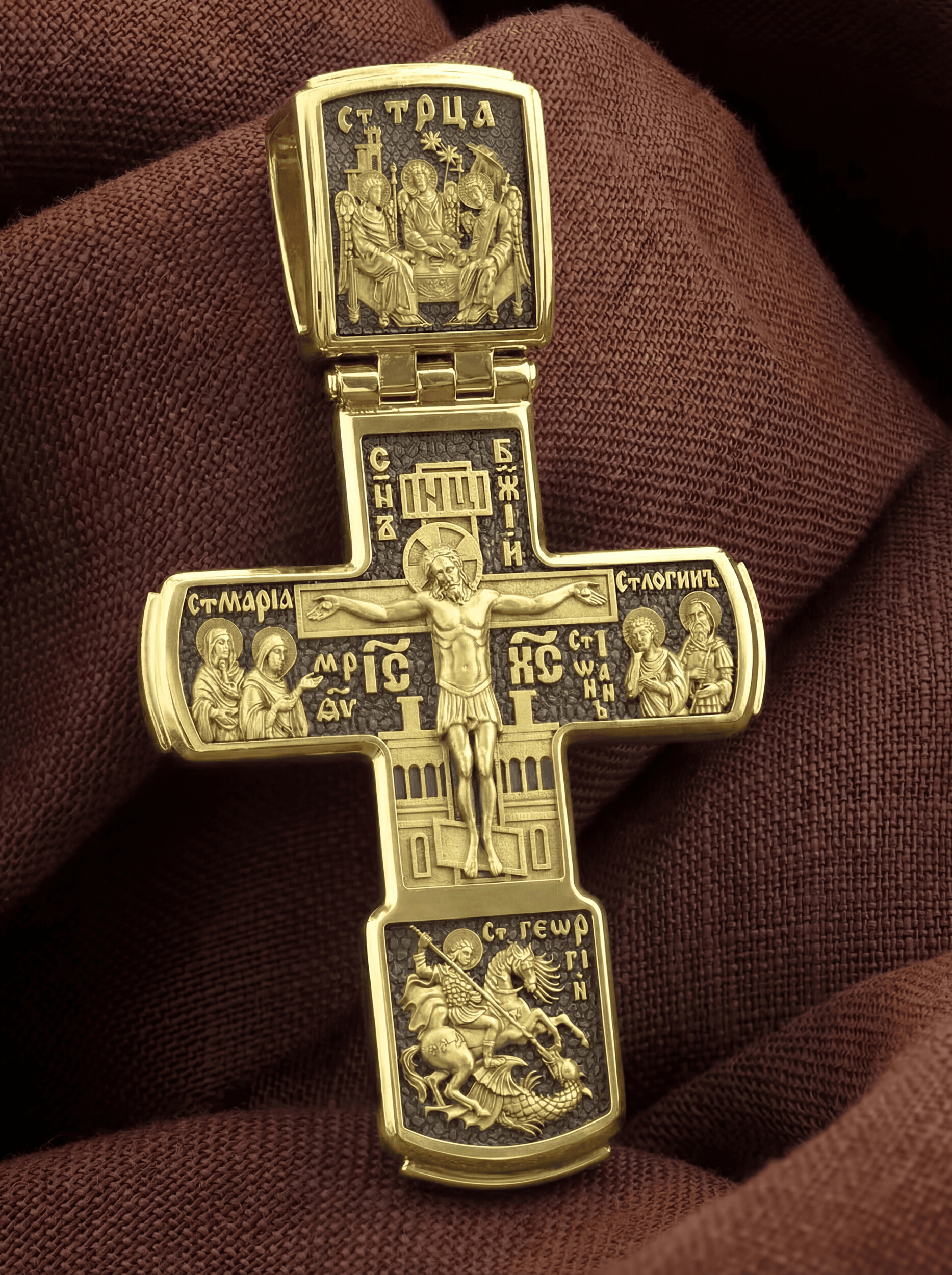 На кресте изображено Распятие Господа нашего Иисуса Христа. Ему предстоят Святая Мария Магдалина, Пресвятая Богородица, апостол Иоанн и Святой Иосиф, свидетели крестных страданий Господа. Вверху — икона Святой Троицы, на которой запечатлено явление Триединого Бога праотцу Аврааму в виде трех ангелов. В нижнем клейме изображено Чудо Святого Георгия о змие. Великомученик Георгий почитается как покровитель воинов, защитник от злых сил, помощник в духовной борьбе.