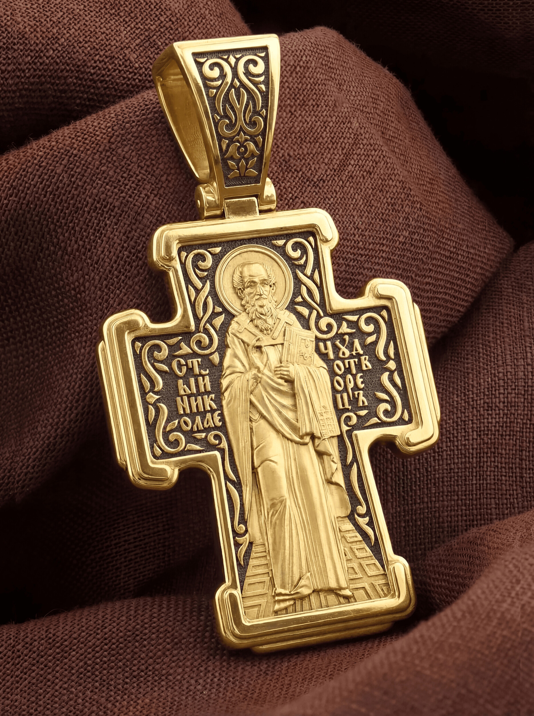 На оборотной стороне креста изображен Святитель Николай архиепископ Мир Ликийских, Чудотворец. Он является одним из самых почитаемых святых в православном мире. Святитель Николай родился во второй половине III века в Малой Азии в Ликийском городе Патары. С рождения Божий Угодник проявлял необыкновенные дарования. Сохранилось Предание, что во время крещения он, никем не поддерживаемый, простоял в купели три часа. Вся жизнь святого Николая — это служение Богу. Много великих и преславных чудес сотворил на земле и на море великий Святитель Николай Угодник. Он помогал сущим в бедах, укрощал штормы, спасал от потопления и выносил на сушу из глубины морской, освобождал из плена и приносил освобожденных домой, избавлял от уз и темницы, защищал от посечения мечом, освобождал от смерти и подавал многим различные исцеления, слепым прозрение, хромым хождение, глухим слух, немым дар слова.