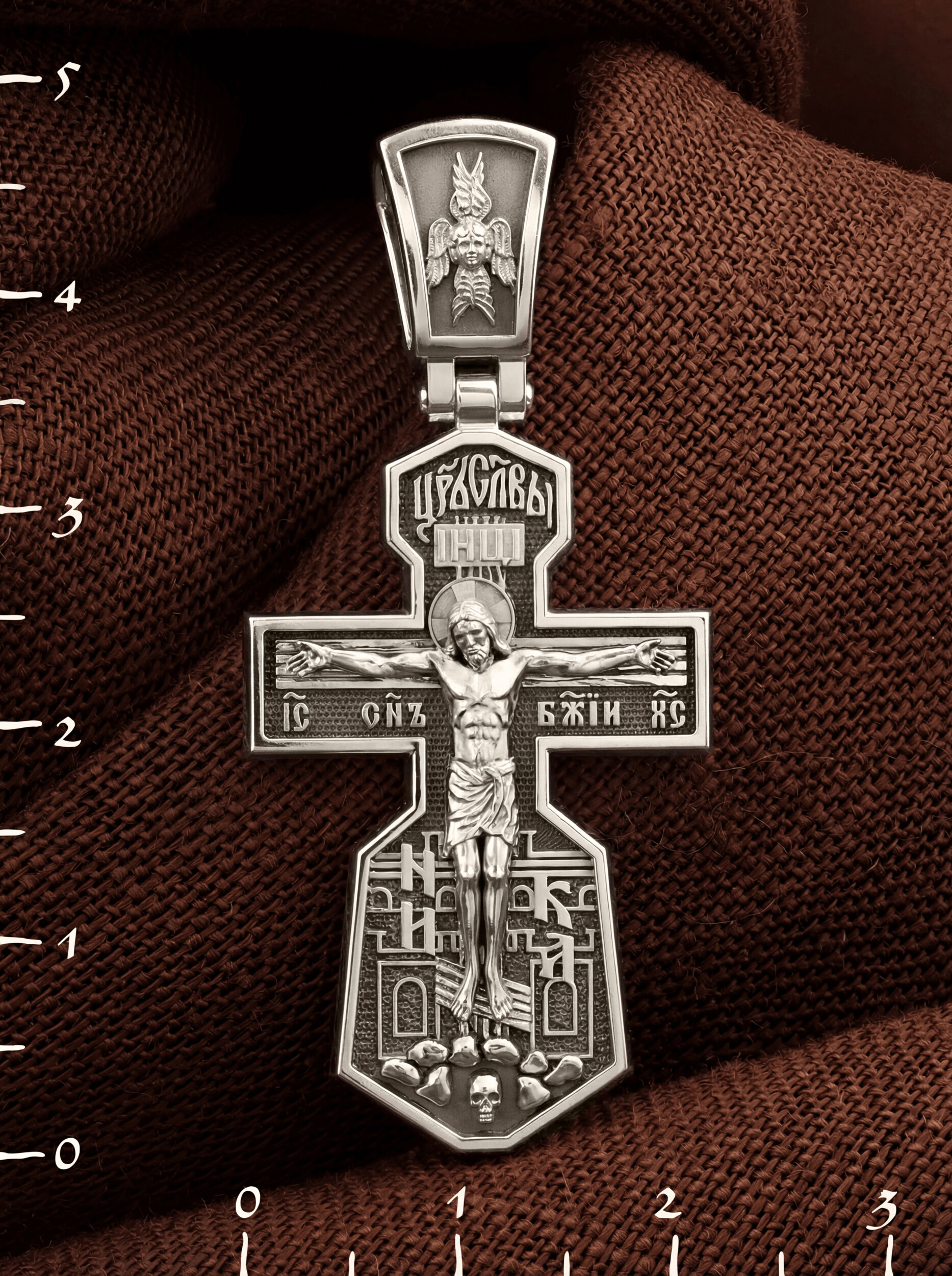 На лицевой стороне креста изображено Распятие Иисуса Христа. Господь представлен свободно покоящимся на кресте с простертыми руками и как бы обнимающим всю Вселенную. Он — Спаситель, искупивший грехи мира, «поправший смертию смерть» и призывающий к Себе «все концы земли». Поэтому рядом с Его образом помещены слова — «НИКА» и «Царь Славы». Эти слова характеризуют Господа как Великого Архиерея, победителя смерти. Верхняя перекладина символизирует титло — табличку, на которой, согласно Евангелию, было начертано: Иисус Назорей Царь Иудейский (IНЦI). Также Распятие сопровождается надписями, олицетворяющими Христа. Это святое имя Христа «IC» (Иисус) «ХС» (Христос), и словосочетание «СЫН БОЖИЙ».