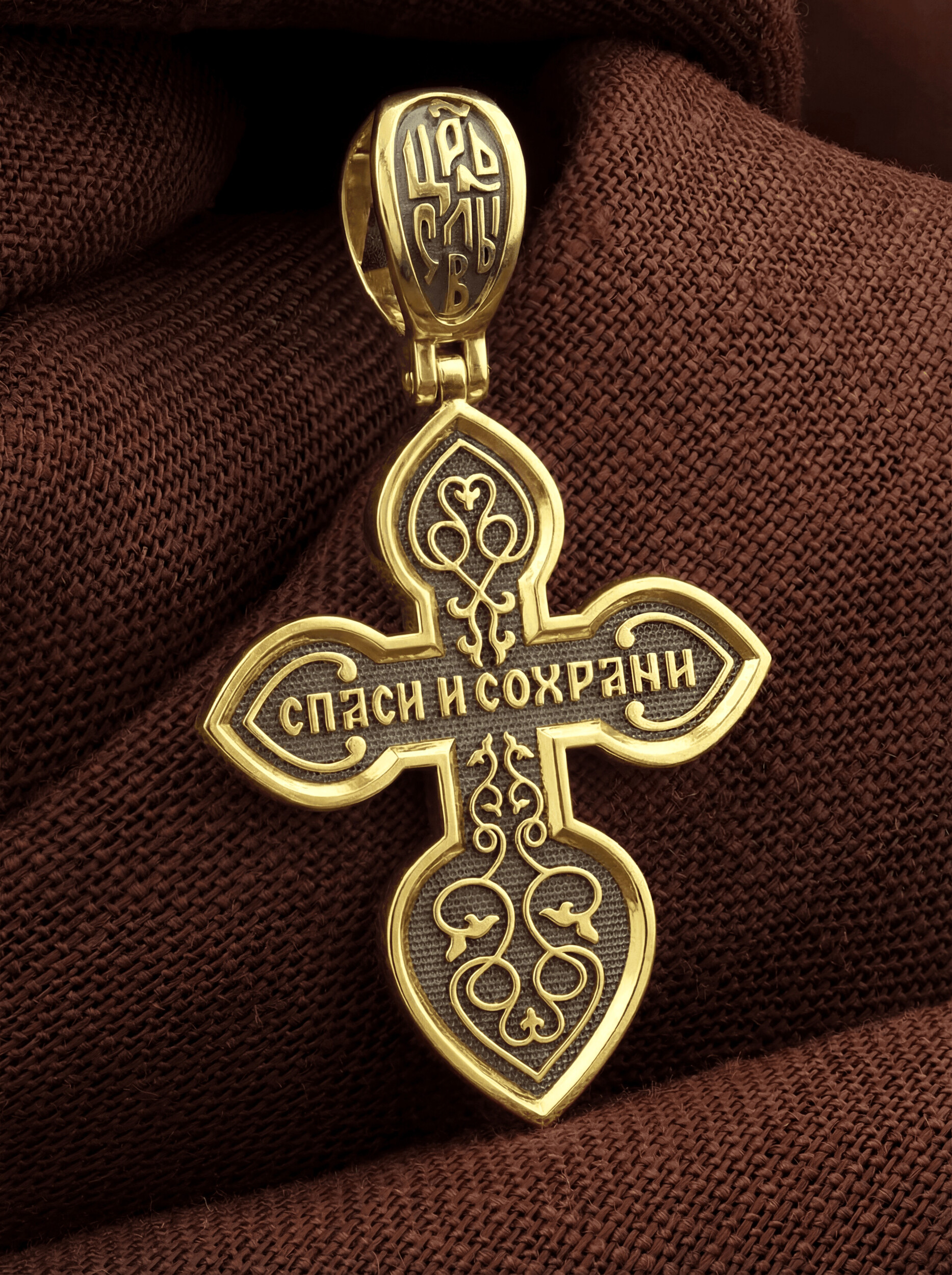 На обороте данного креста, в окружении изящного растительного узора, написано молитвенное славословие: «Спаси и сохрани».