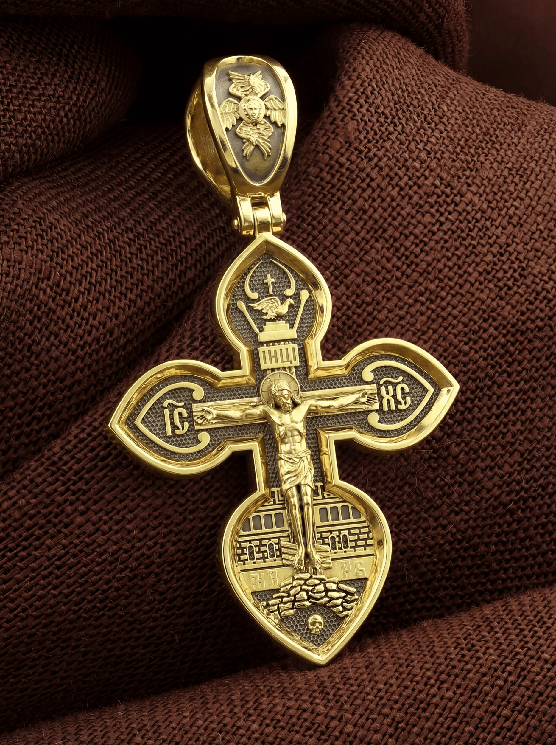 На лицевой стороне нательного креста по традиции изображено Распятие Иисуса Христа. В основании креста изображен череп Адама, а гора Голгофа именуется также Лобным Местом и обозначена на кресте буквами «МЛ РБ». С обеих сторон горизонтальной перекладины написано святое имя Христа, которое принято писать на иконах сокращенно — «ИС ХС». Сверху у изголовья Иисуса Христа размещена табличка с надписью в виде аббревиатуры IНЦI — «Иисус Назорей Царь Иудейский», которая, согласно Евангелию, была прибита к кресту после Распятия. Внизу, в земной части креста, под ногами Христа изображается наклоненная перекладина. Это подножие, символизирующее мерило дел человеческих, в чаши которого на Страшном Суде будут полагаться добрые и злые дела людей. Один из распятых с Христом разбойников хулил Господа, и мерило склонилось под тяжестью его грехов, как бы низводя его в ад. Другой же каялся и просил у Господа милости. Ему подножие указывает на Царство Небесное.