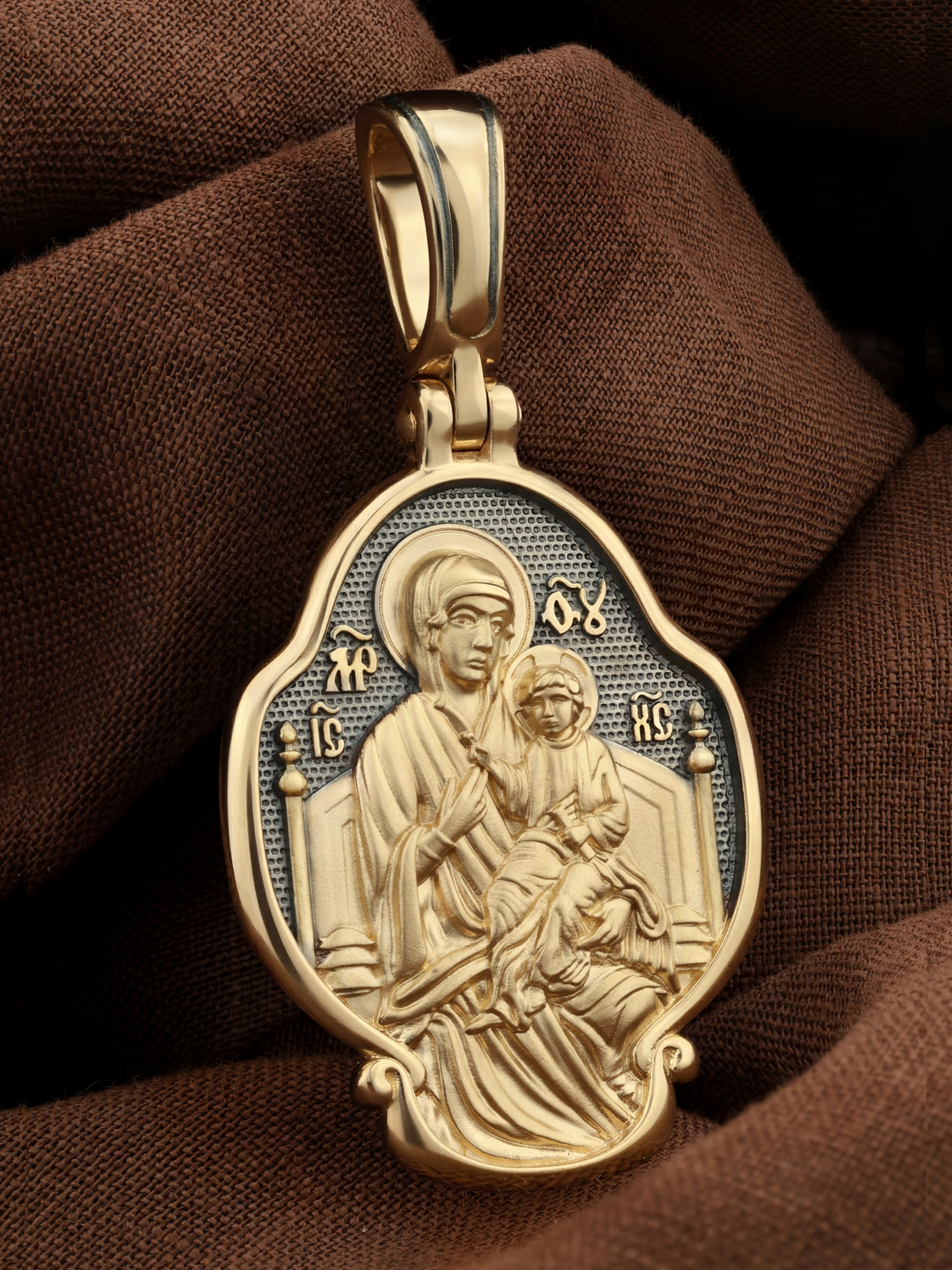 В центр образка помещен образ Божией Матери «Всецарица», восседающая на царском троне. На руках Ее — Богомладенец Иисус Христос со свитком в левой руке. Пальцы Его правой руки сложены в благословляющем жесте.