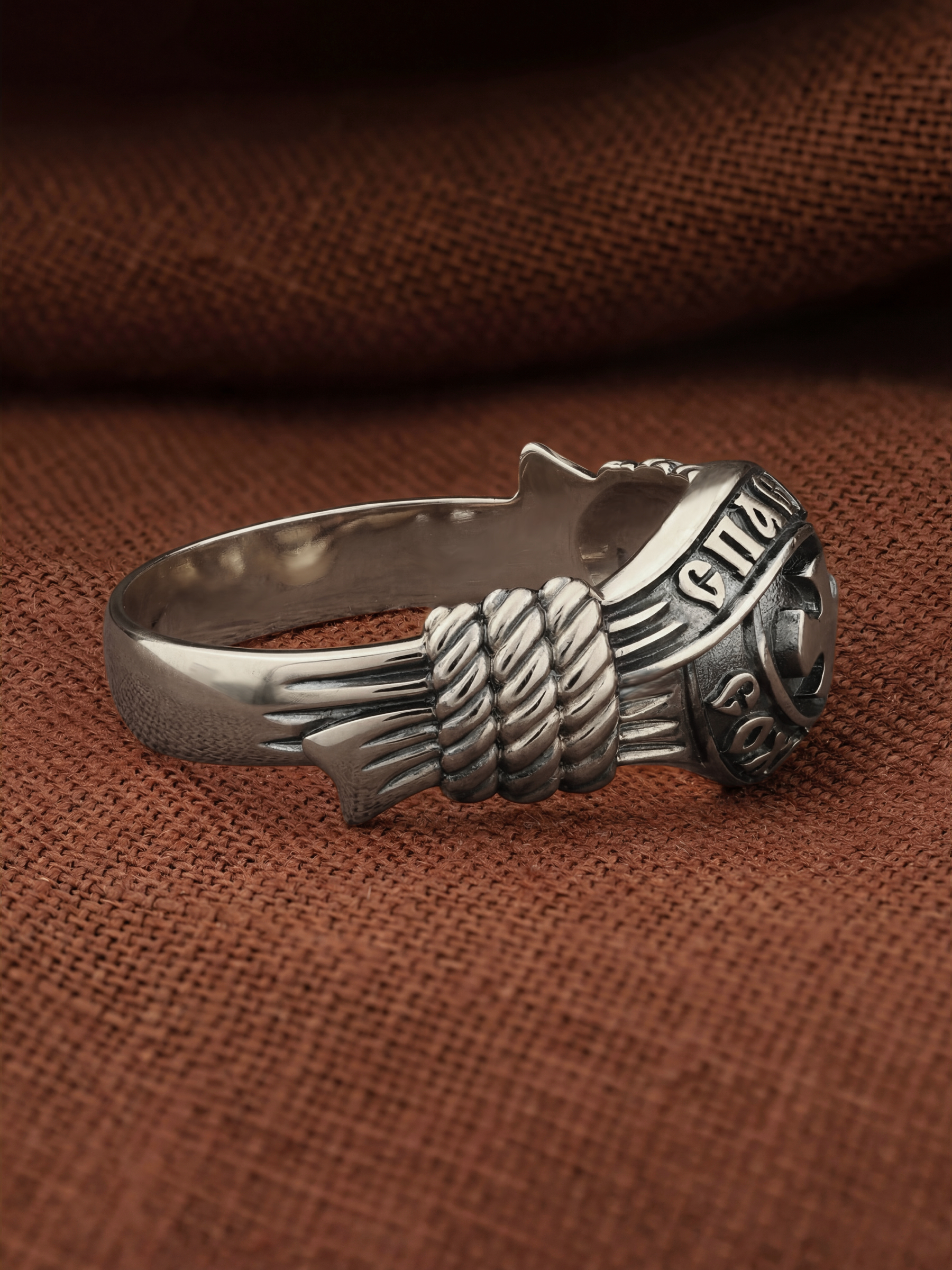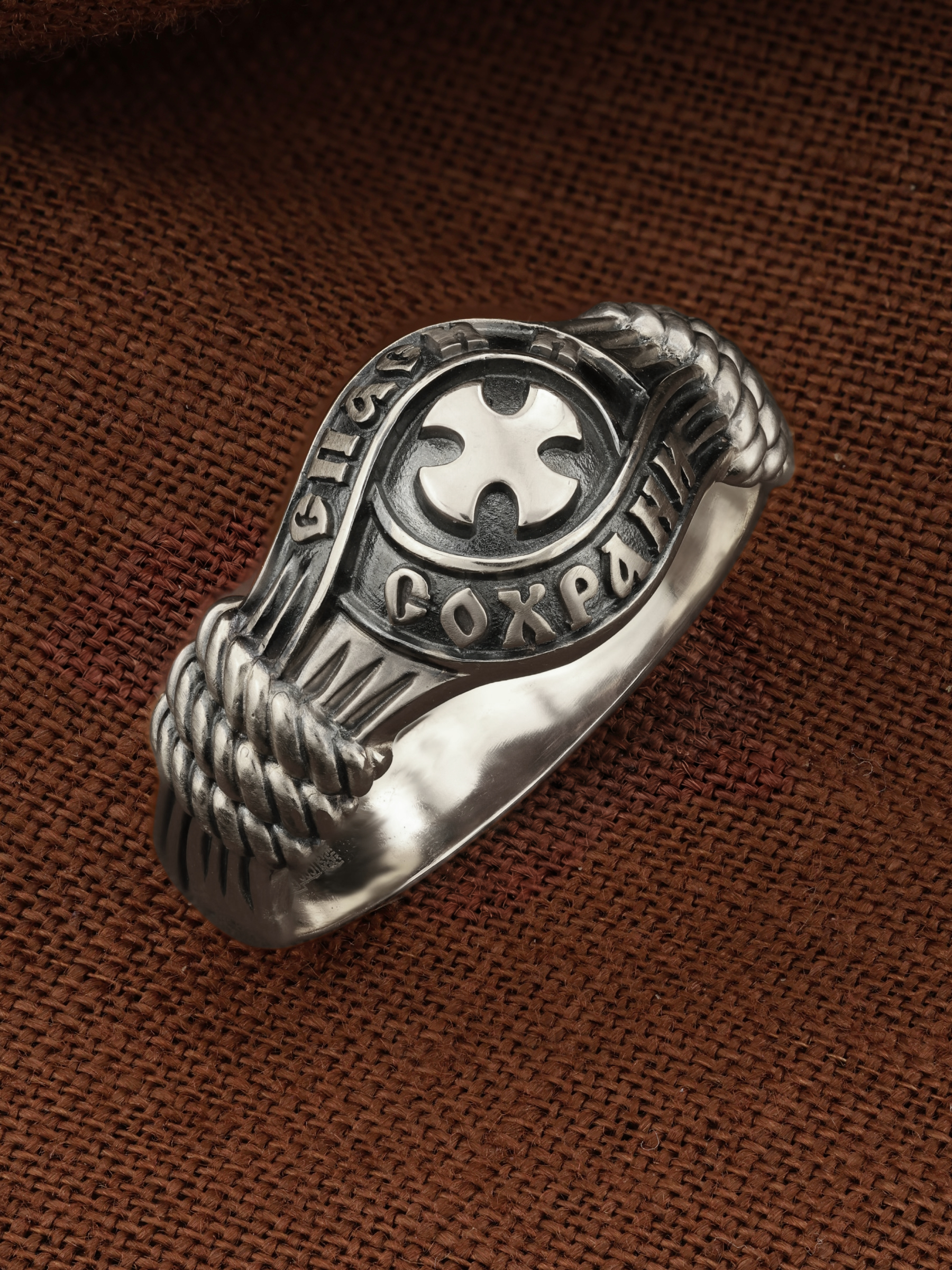 В центральной части лицевой стороны кольца изображен Крест. Господь сказал: кто хочет идти за Мною, отвергнись себя, и возьми крест свой, и следуй за Мною. Крест является символом жертвенной любви Всеблагого Бога к падшим людям, всепобеждающим духовным оружием христиан, основанием и средоточием церковной жизни. Иисус Христос, как искупительная жертва освобождения человечества от власти греха, умер крестной смертью и в третий день воскрес. Крест имеет четырехконечную форму с равными балками. Такого типа кресты существовали во многих дохристианских культурах и были в первую очередь использованы Церковью для выражения идеи христианского преобразования мира. Вокруг креста помещена молитва: «Спаси и Сохрани».
