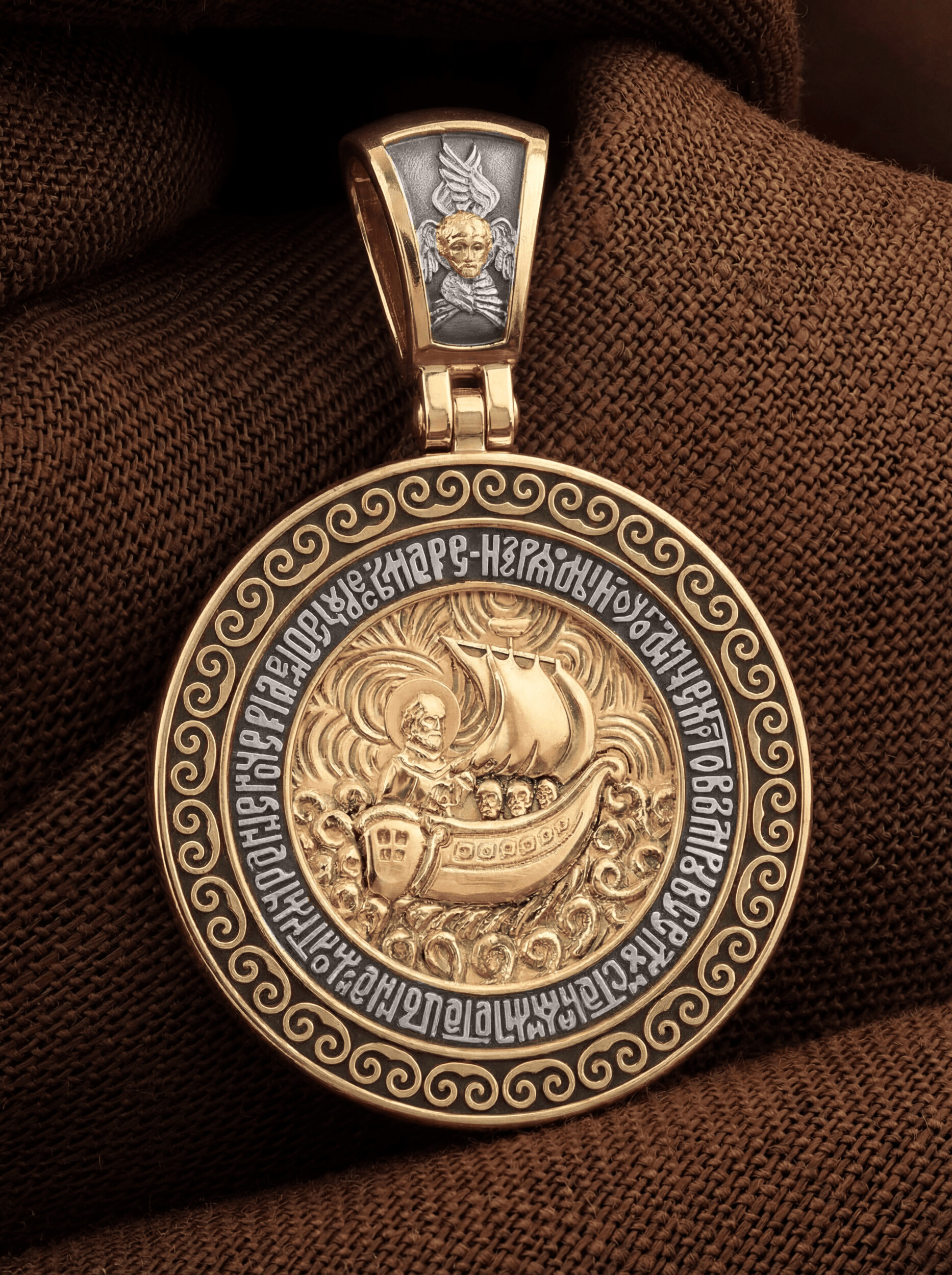 На кулонном кольце изображен Спас Нерукотворный — Символ вочеловечившегося Божества и шестикрылый Серафим — самый приближенный к Господу Ангел.
