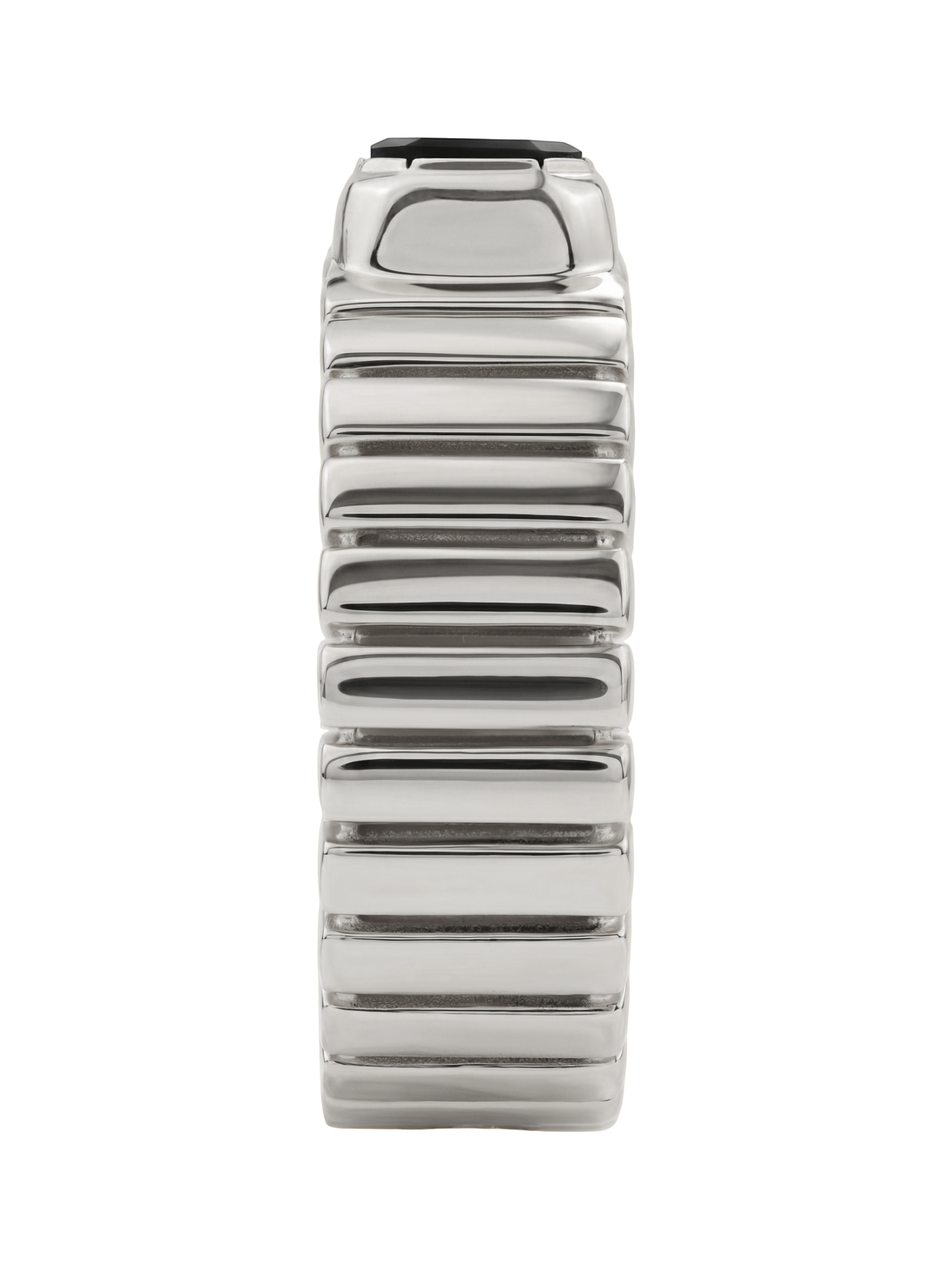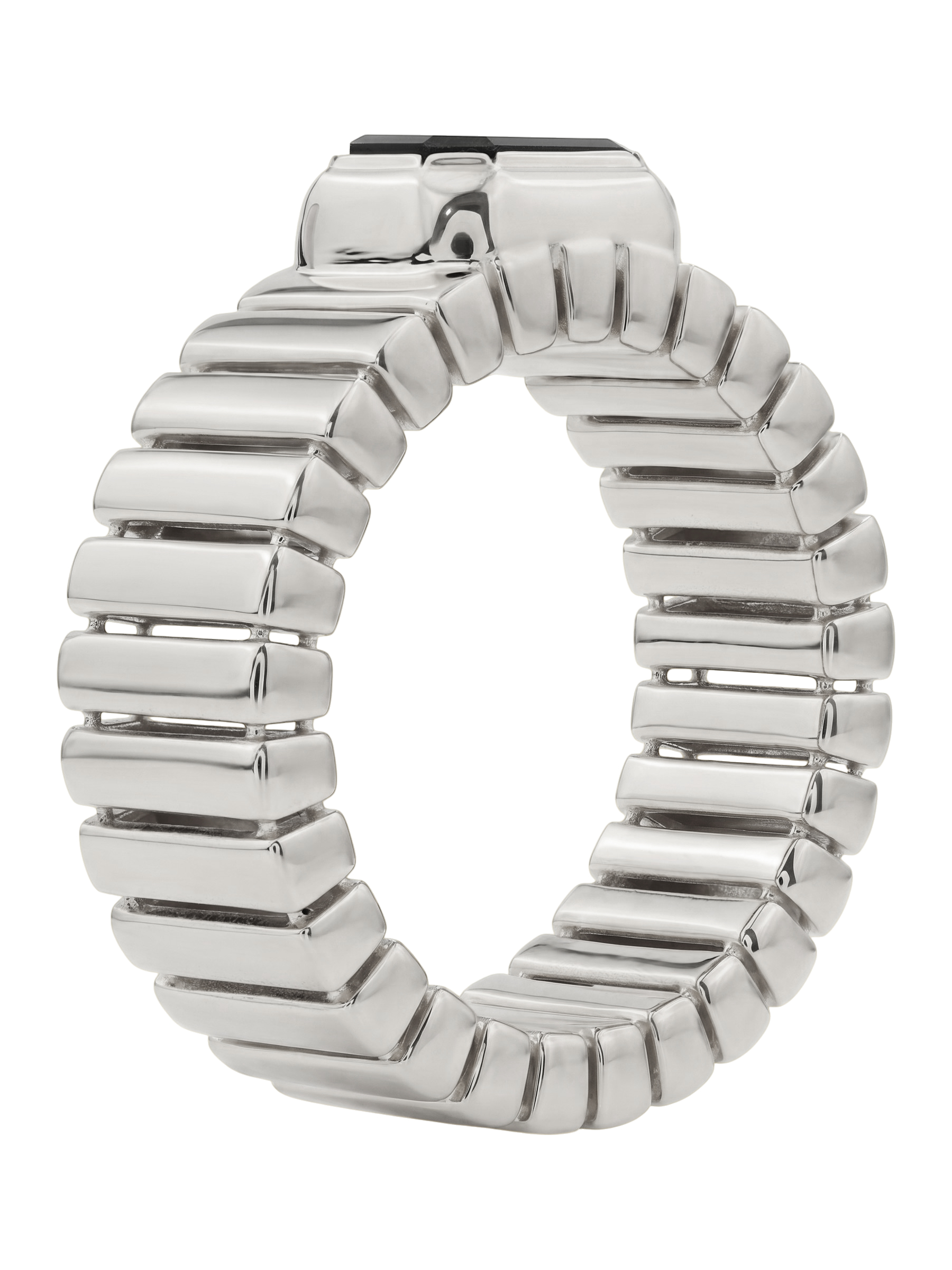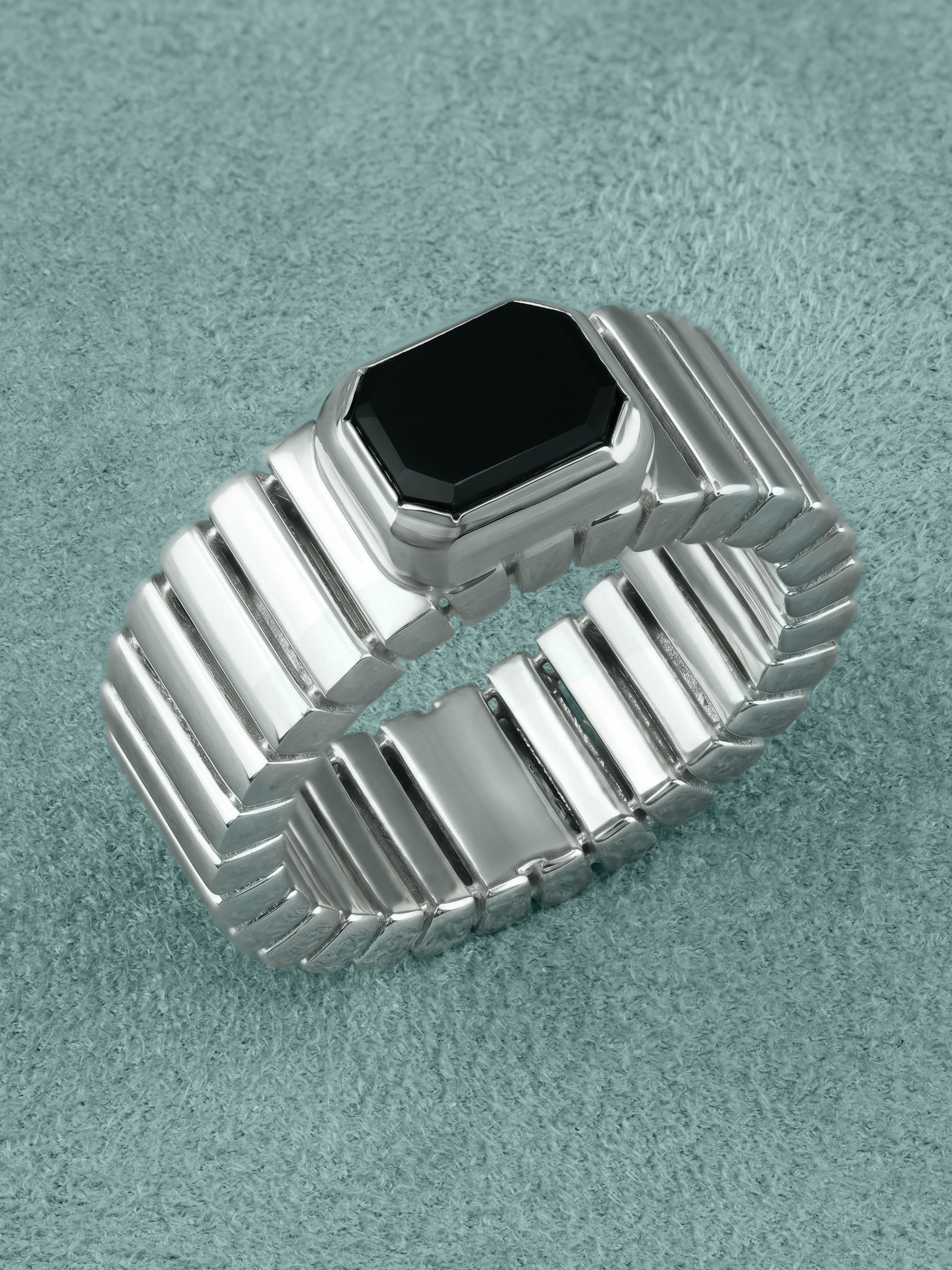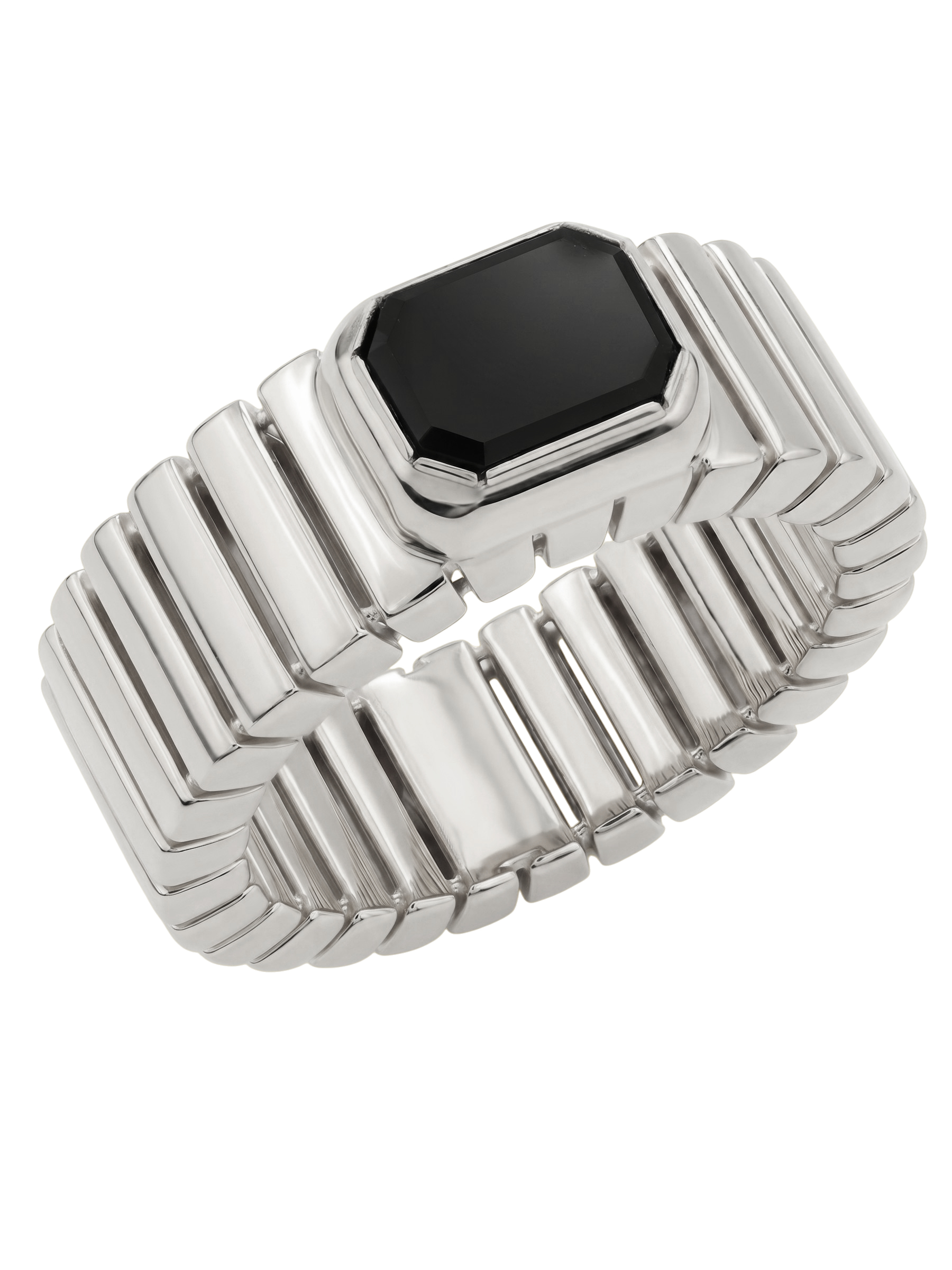 В центре композиции расположен оникс правильной формы октагон. Одна крупная вставка черного цвета придает изделию солидности и выразительности. Массивный рельефный шинка подчеркивает геометрию кольца, делая его самодостаточным аксессуаром, который не требует дополнений, но при этом отлично вписывается в составные комплекты украшений.