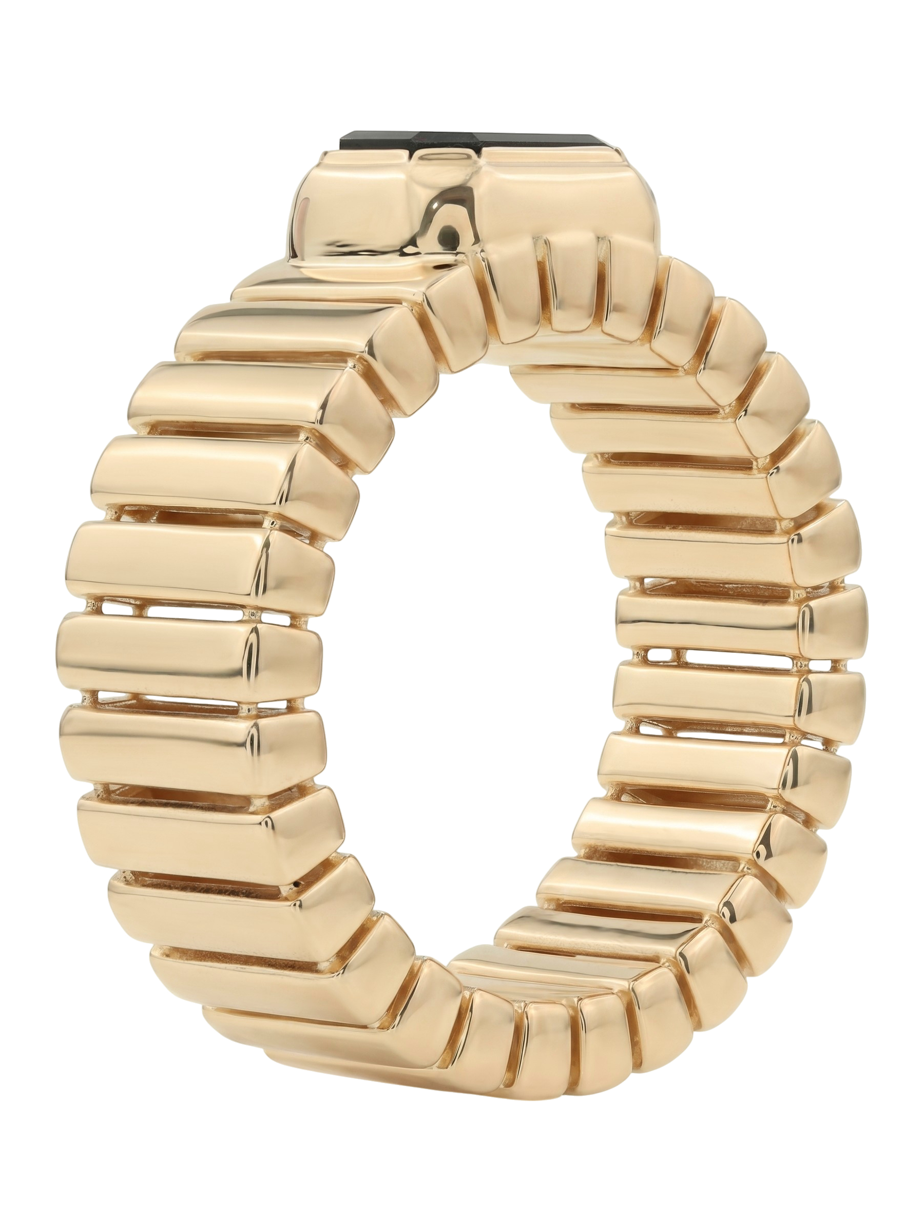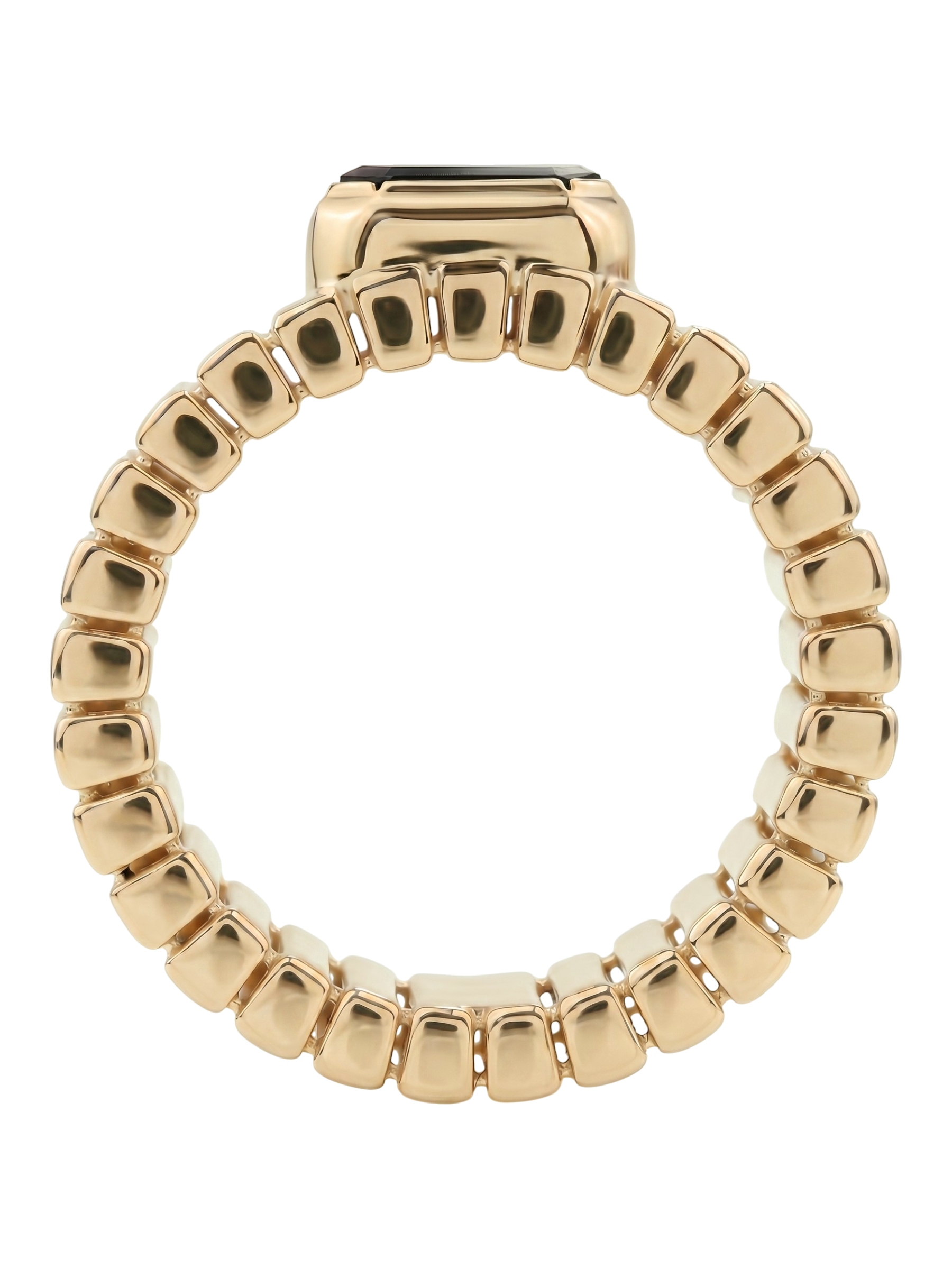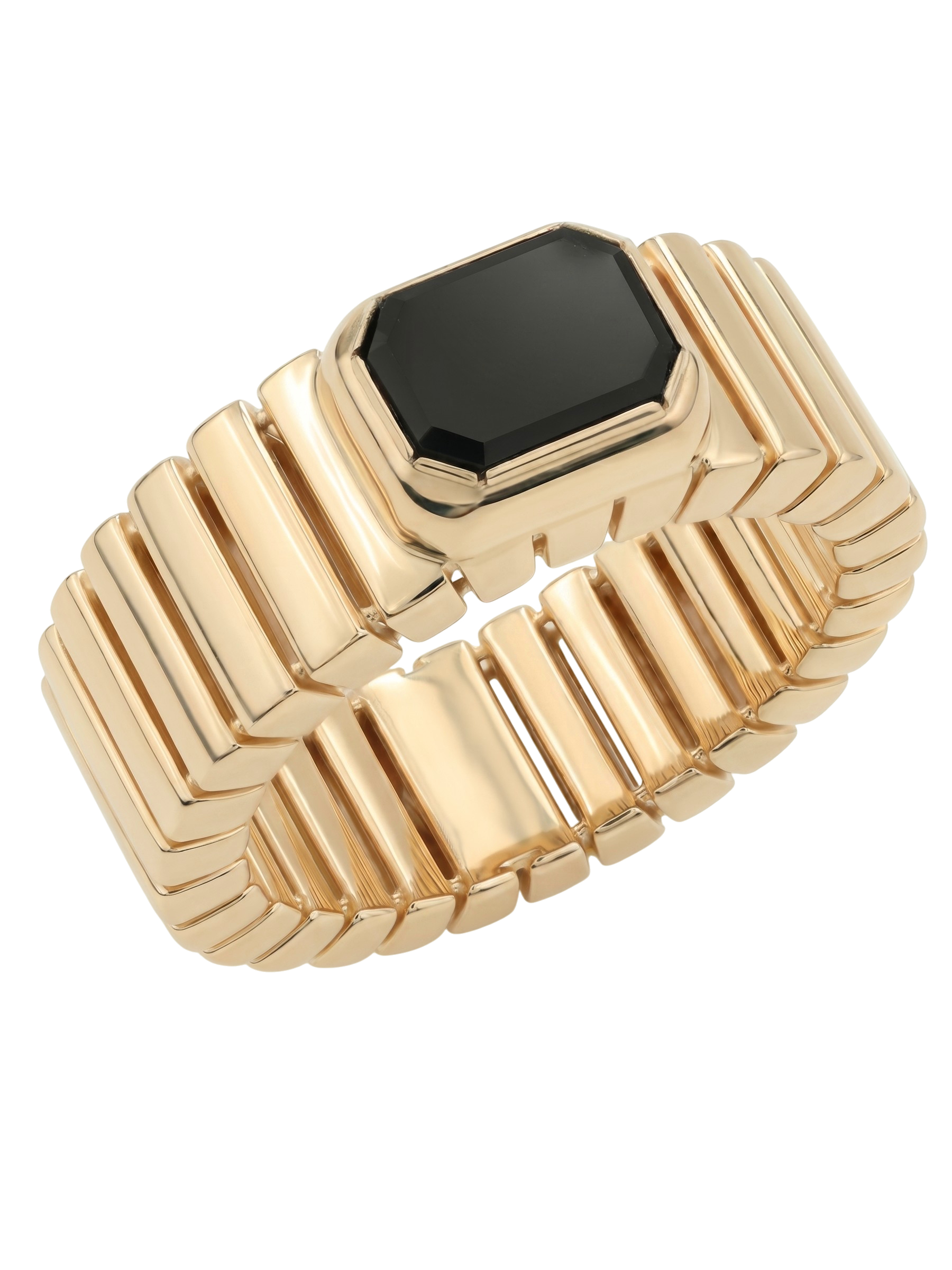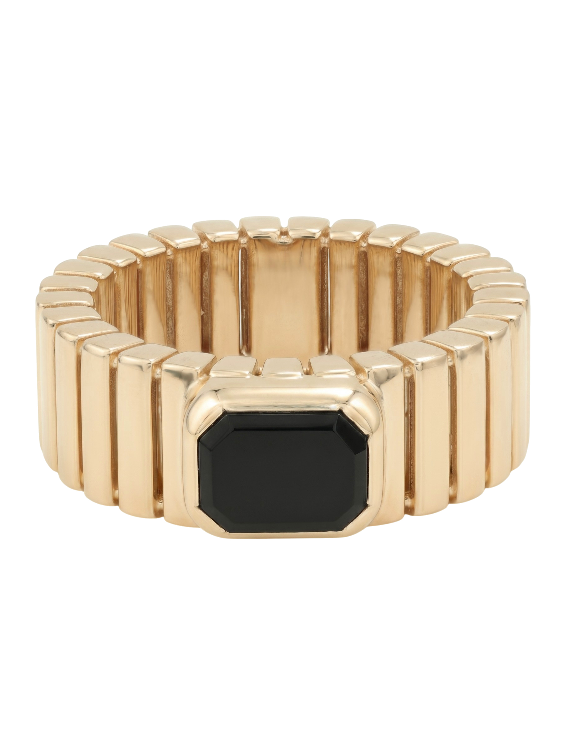 Центральным элементом композиции является одна вставка из натурального оникса глубокого черного цвета. Форма вставки — октагон — выбрана не случайно: ее сдержанная геометрия подчеркивает благородный блеск красного золота и придает кольцу особый шарм. Лаконичность линий делает это украшение универсальным аксессуаром, который легко вписывается как в деловой дресс-код, так и в вечерний стиль.