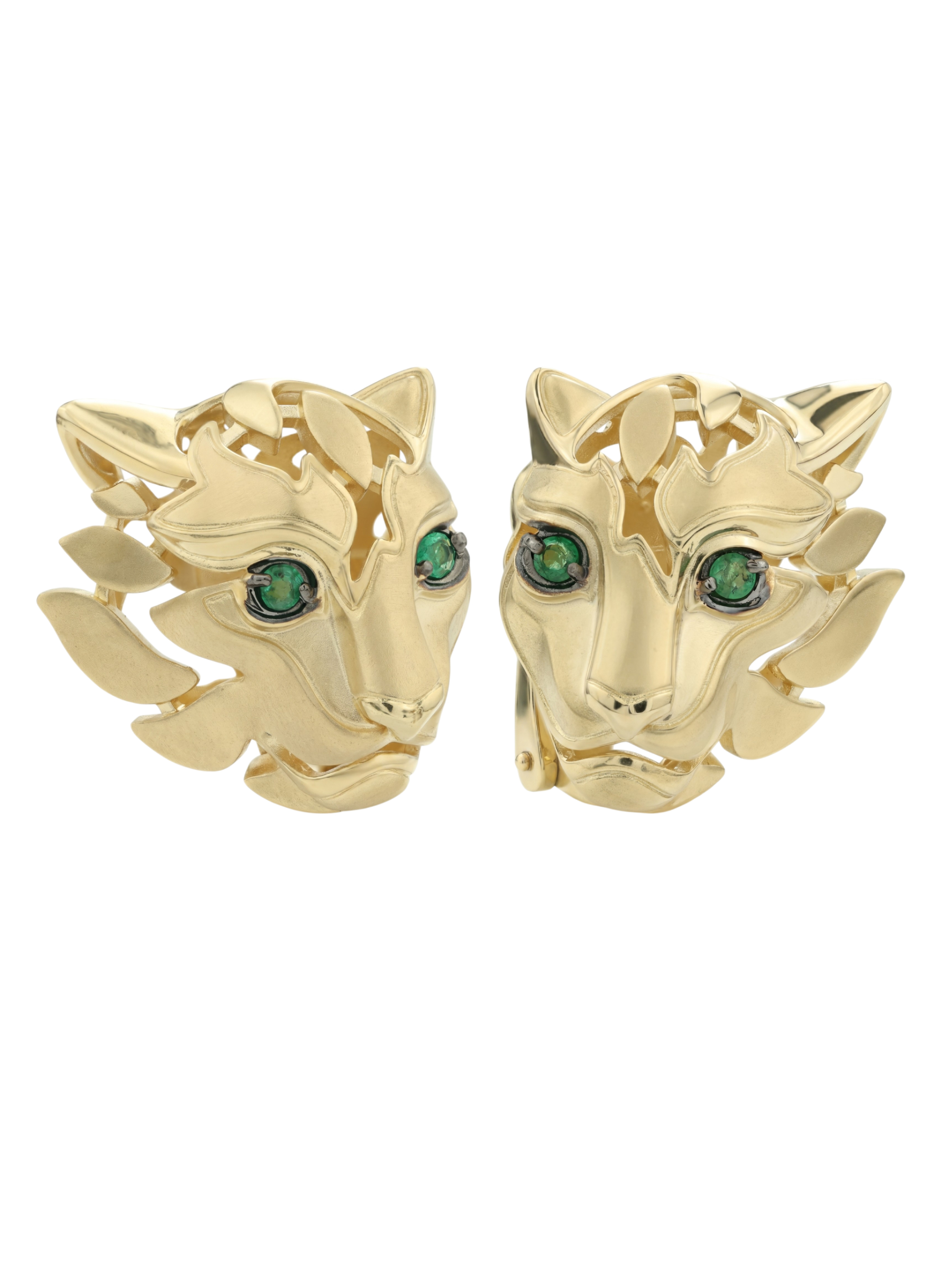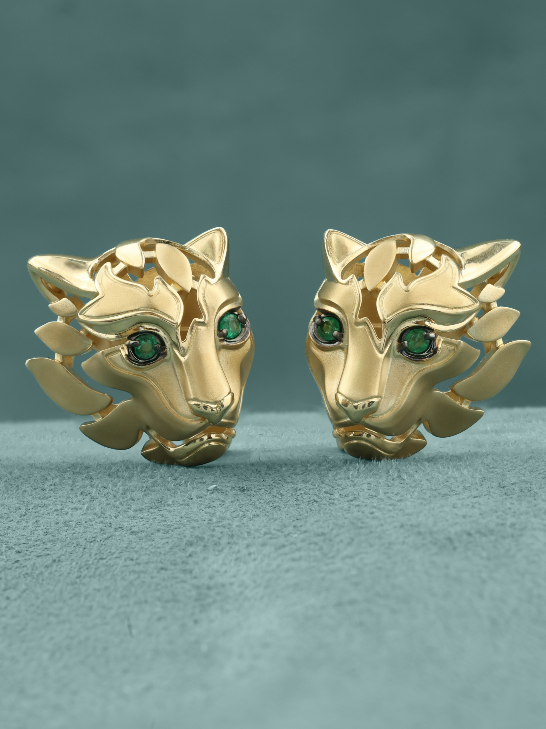 Взгляд хищника притягивает внимание благодаря выразительным вставкам: в изделии использовано четыре изумруда круглой формы. Глубокий зеленый цвет вставок эффектно контрастирует с теплым блеском лимонного золота, создавая гармоничное и запоминающееся сочетание. Продуманный дизайн позволяет этим серьгам органично дополнить как женский, так и мужской образ, добавляя ноту статусности и уверенности.