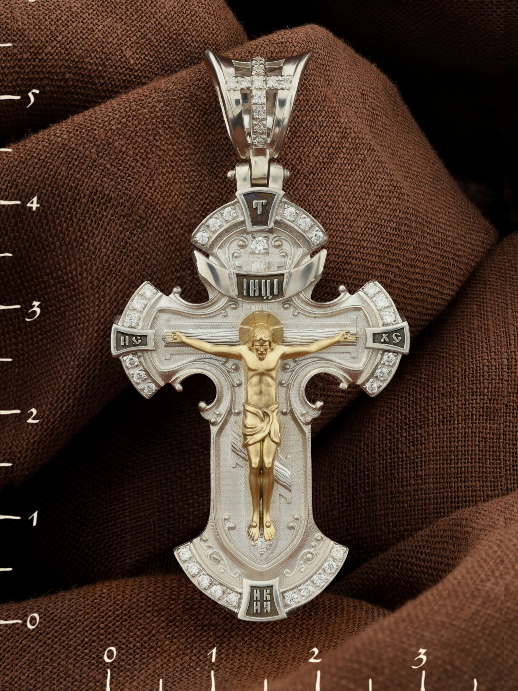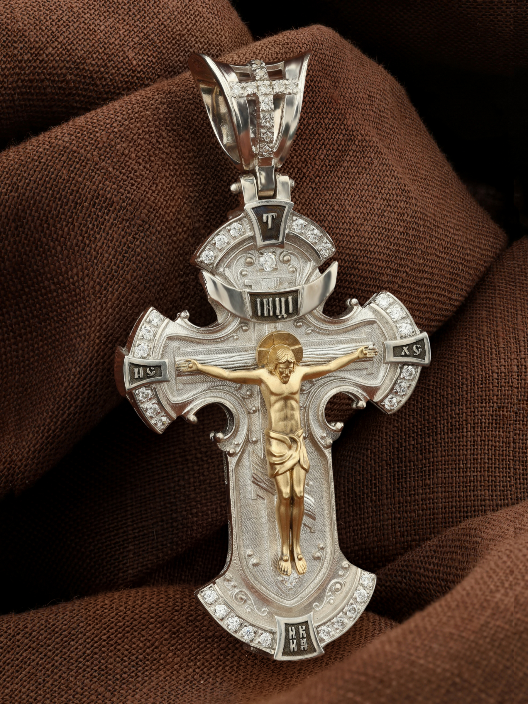 На лицевой стороне креста изображено Распятие Иисуса Христа на Голгофском Кресте, верхняя перекладина которого символизирует титло — табличку, на которой, согласно Евангелию, было начертано: Иисус Назорей Царь Иудейский (IНЦI). Справа и слева от Распятия изображены символы «IС ХС» — святое имя Христа. Внизу креста написано слово «НИКА», что значит «победитель». В верхней части креста обозначена буква «Т», которая символизирует одно из орудий страданий Господа — трость.