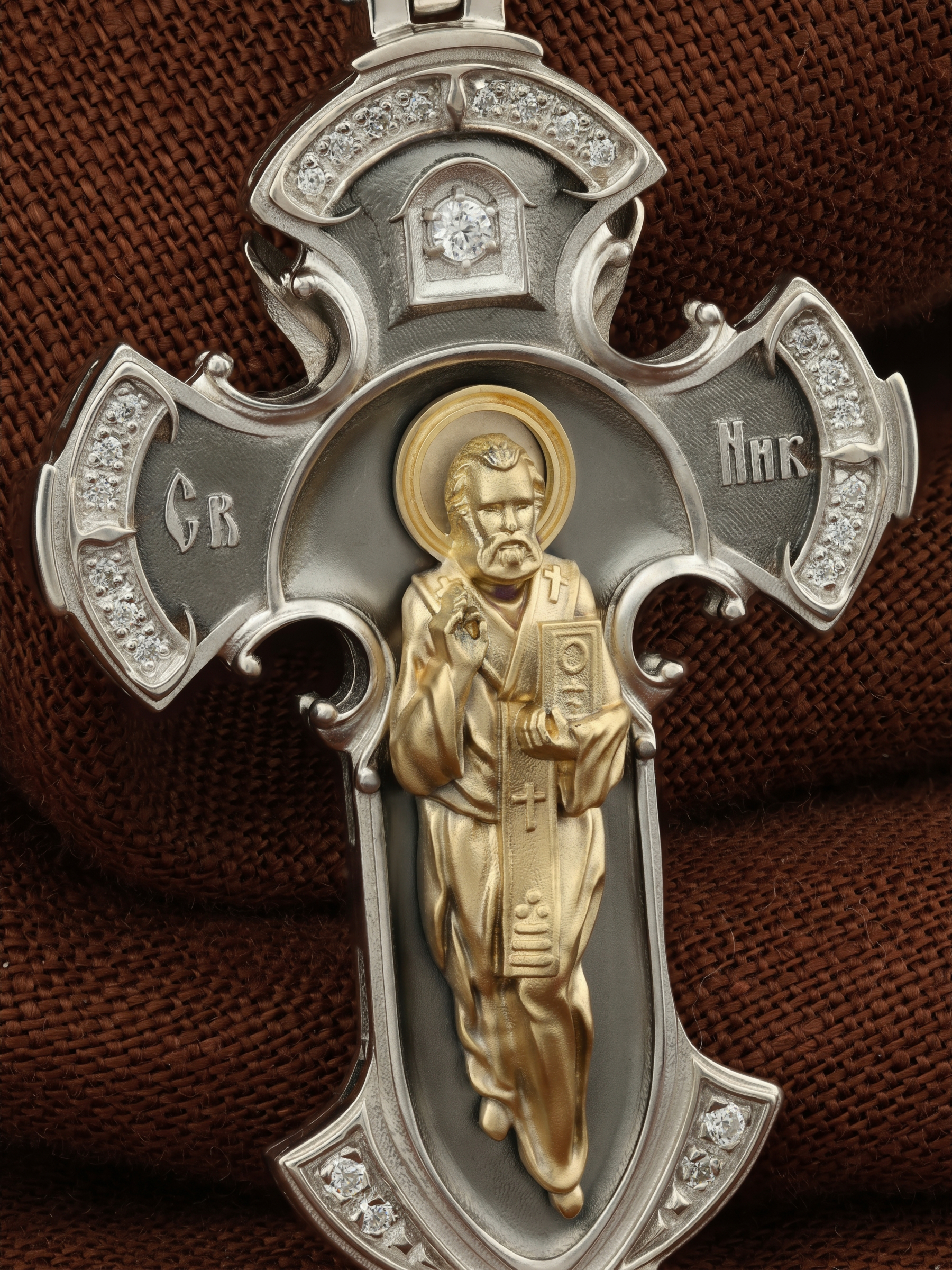Оборотную сторону креста возглавляет икона святителя Николая Чудотворца. На кулонном кольце помещено изображение Спаса Нерукотворного — образ Спасителя, который Он запечатлел на плате и передал для исцеления больному проказой царю Эдессы. ему придается победное и защитное значение.