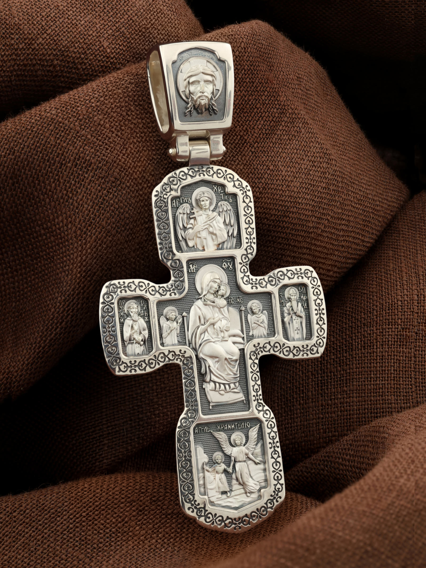 Внизу изображены три святителя, творцы Божественной Литургии. В центре — святой Василий Великий, справа — святой Иоанн Златоуст, а слева — святой Григорий Богослов. В центральной части оборотной стороны Креста изображена икона Божией Матери «Всецарица» или «Пантанасса». Чудотворная икона была написана в XVII веке и находится на Святой Горе Афон. Икона совершила множество чудесных исцелений. Пречистая Богородица наставляет на праведный путь, помогает укрепить веру, найти утешение. По бокам изображены прп. Сергий Радонежский и святитель Спиридон Триумфунский. Сверху и снизу помещены изображения Ангела-Хранителя. На кулонном кольце помещено изображение Спаса Нерукотворного. Ему придается победное и защитное значение.